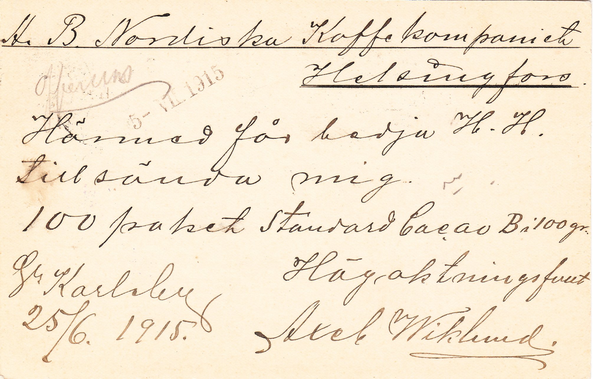 Diese nach Helsingfors = Helsinki adressierte Postkarte wurde am 25.06.1915 in Karleby geschrieben und aufgegeben.