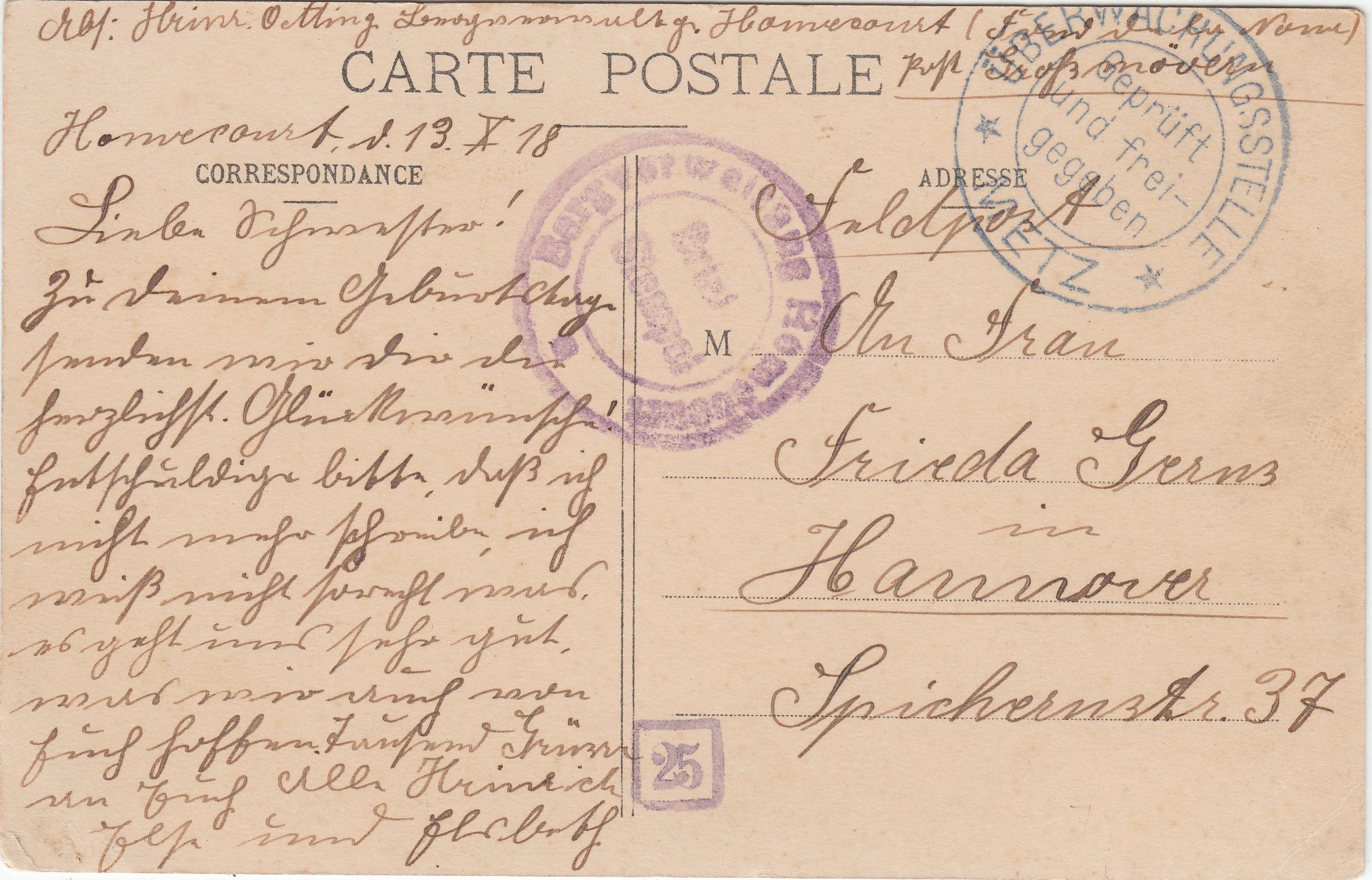 Diese Feldpostkarte wurde in Homécourt geschrieben und mit einem Truppenstempel "Bergverwaltung Homécourt Brief Stempel" versehen aufgegeben: