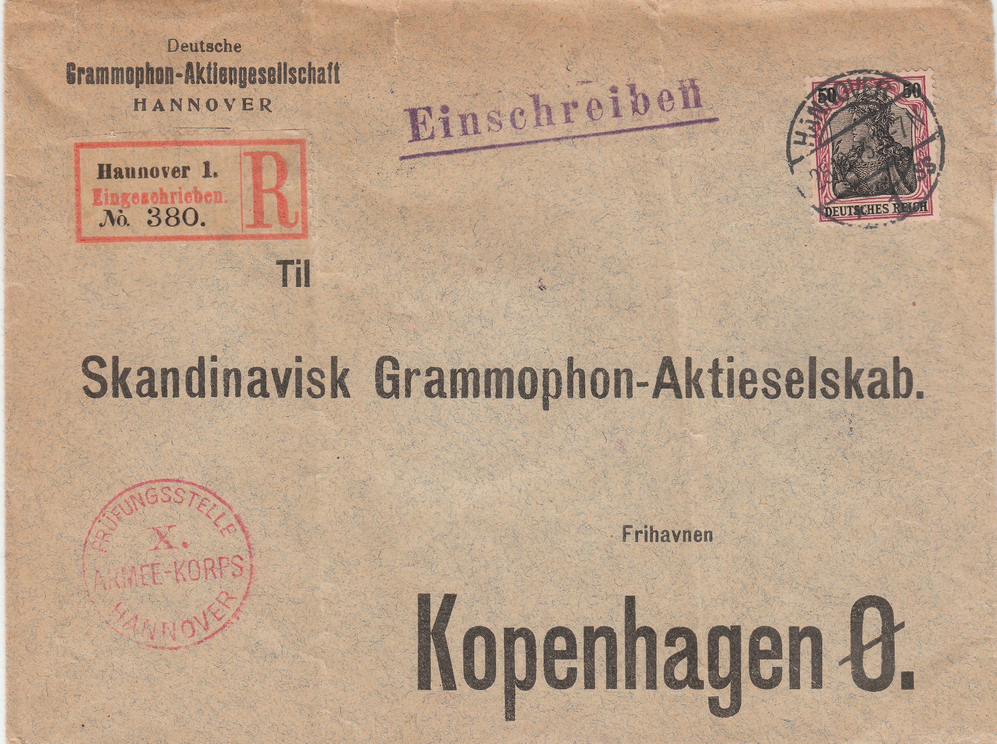 Dieser Brief vom 25.10.1915 mit Absender "Deutsche Grammophon-Aktiengesellschaft Hannover" sollte per Einschreiben an einen Geschäftspartner in Kopenhagen in Dänemark gehen: