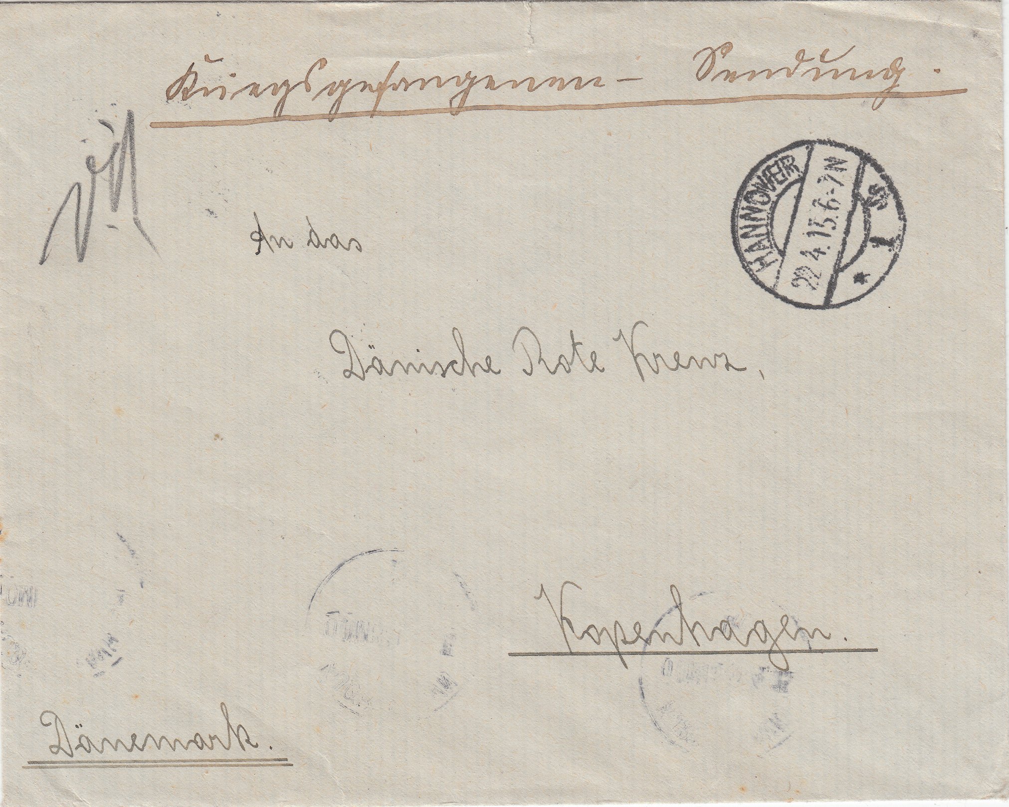 Auch portofreie Kriegsgefangenen-Sendungen ins Ausland, die ganz normal über den Briefkasten aufgegeben wurden, wie dieser Brief vom 22.04.1915 aus Hannover an das Dänische Rote Kreuz in Kopenhagen, lief durch diese Zensurstelle:
