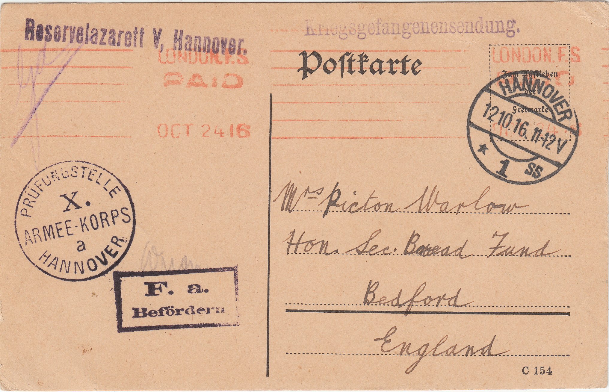So wurde dieser Beleg am 12.10.1916 in Hannover der Post übergeben und nach England geleitet.