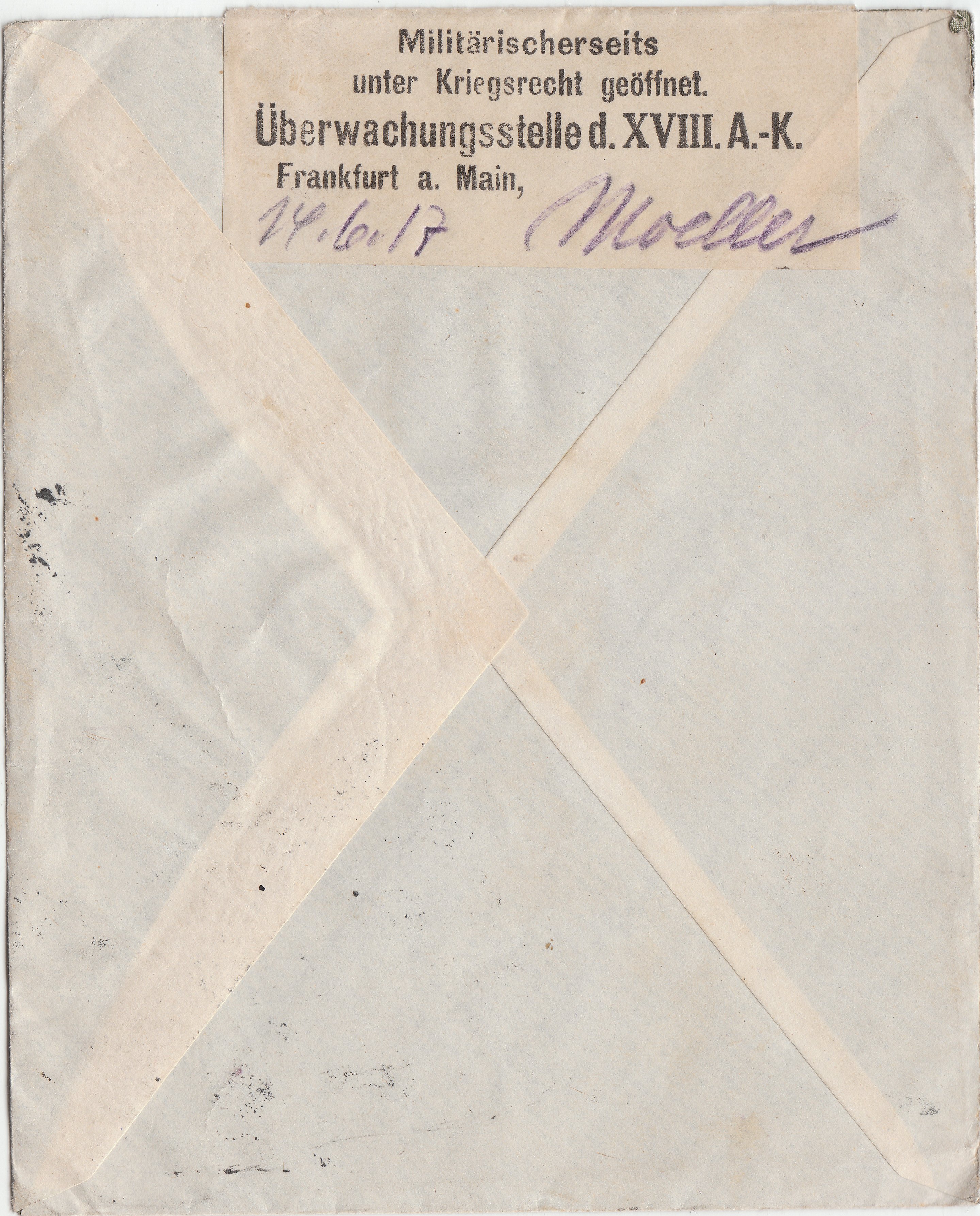 Der Beleg wurde linksseitig geöffnet und mit Verschlußzettel ""Militärischerseits unter Kriegsrecht geöffnet. Überwachungsstelle d. XVIII. A.-K. Frankfurt a. Main" wieder verschlossen. Darauf setzte Herr "Moeller" am "14.6.17" sein Namenszeichen: