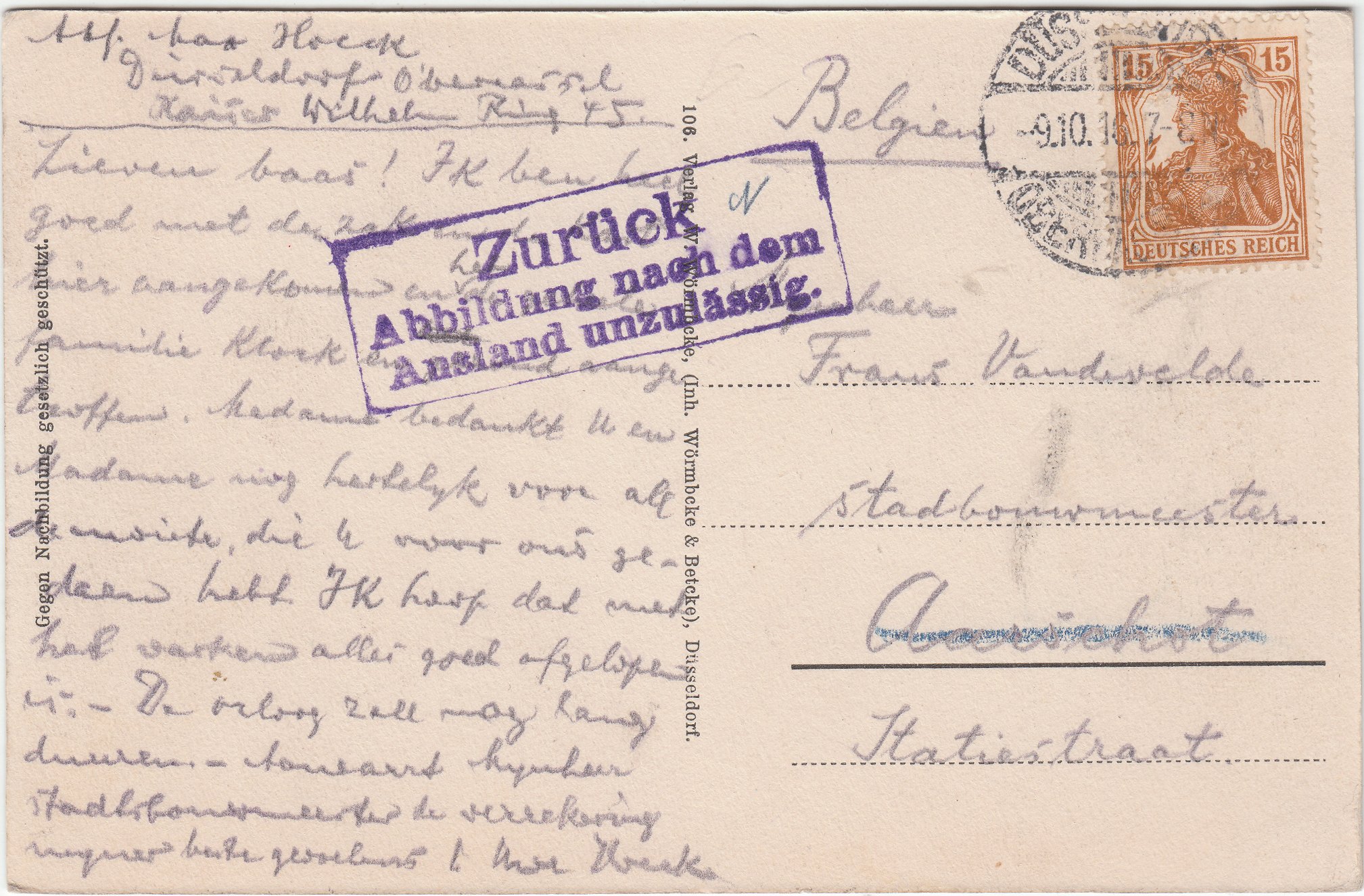 Diese am 09.10.1916 in Düsseldorf-Oberkassel aufgegebene Ansichtskarte nach Belgien wurde von der Auslandbriefprüfstelle moniert und ging mit einem Hinweisstempel "Zurück Abbildung nach dem Ausland unzulässig." in Violett an den Absender zurück: