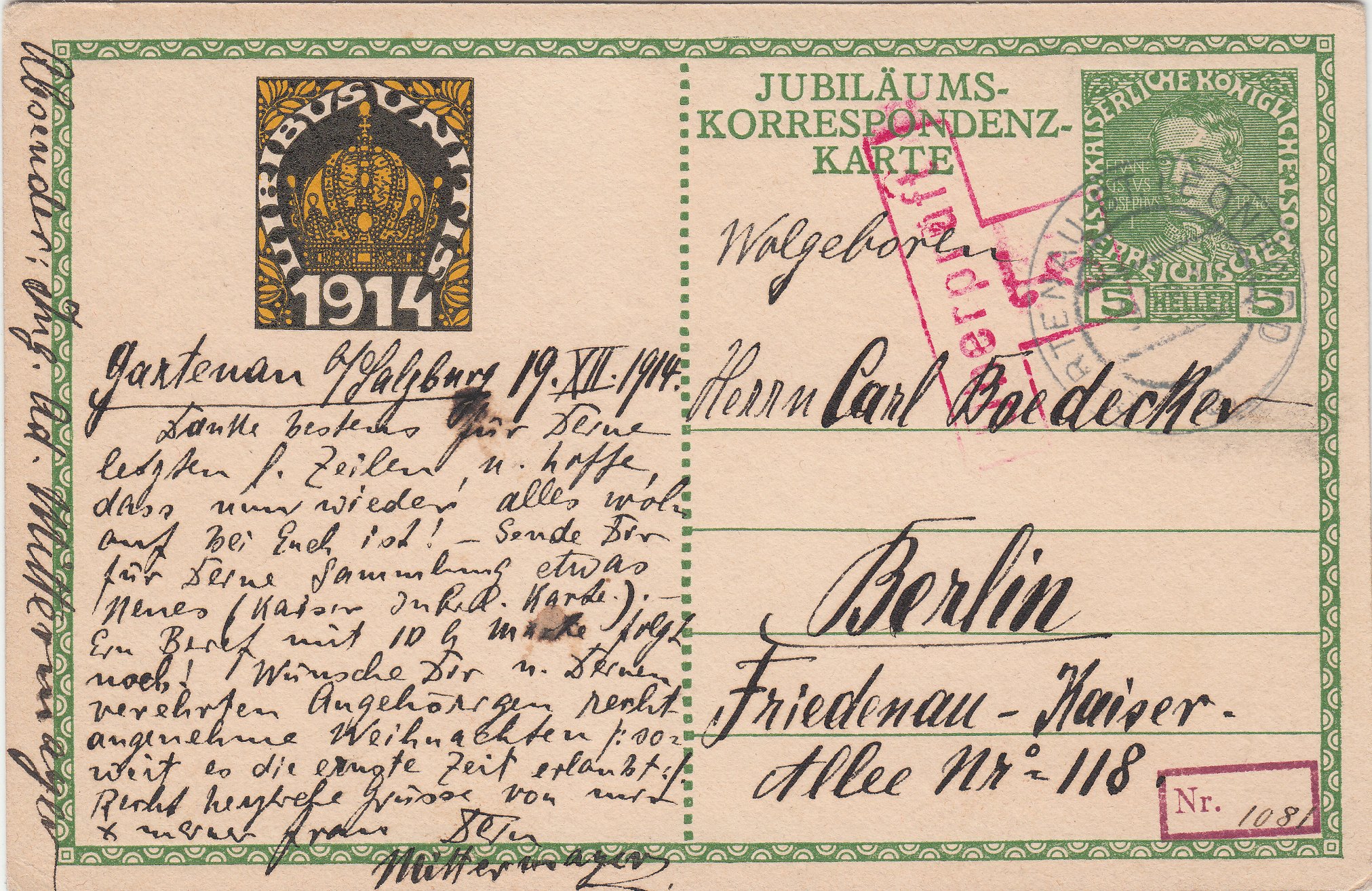 Diese am 19.12.1914 in Gartenau St. Leonhard bei Salzburg geschriebene Postkarte ist adressiert nach Berlin Friedenau: