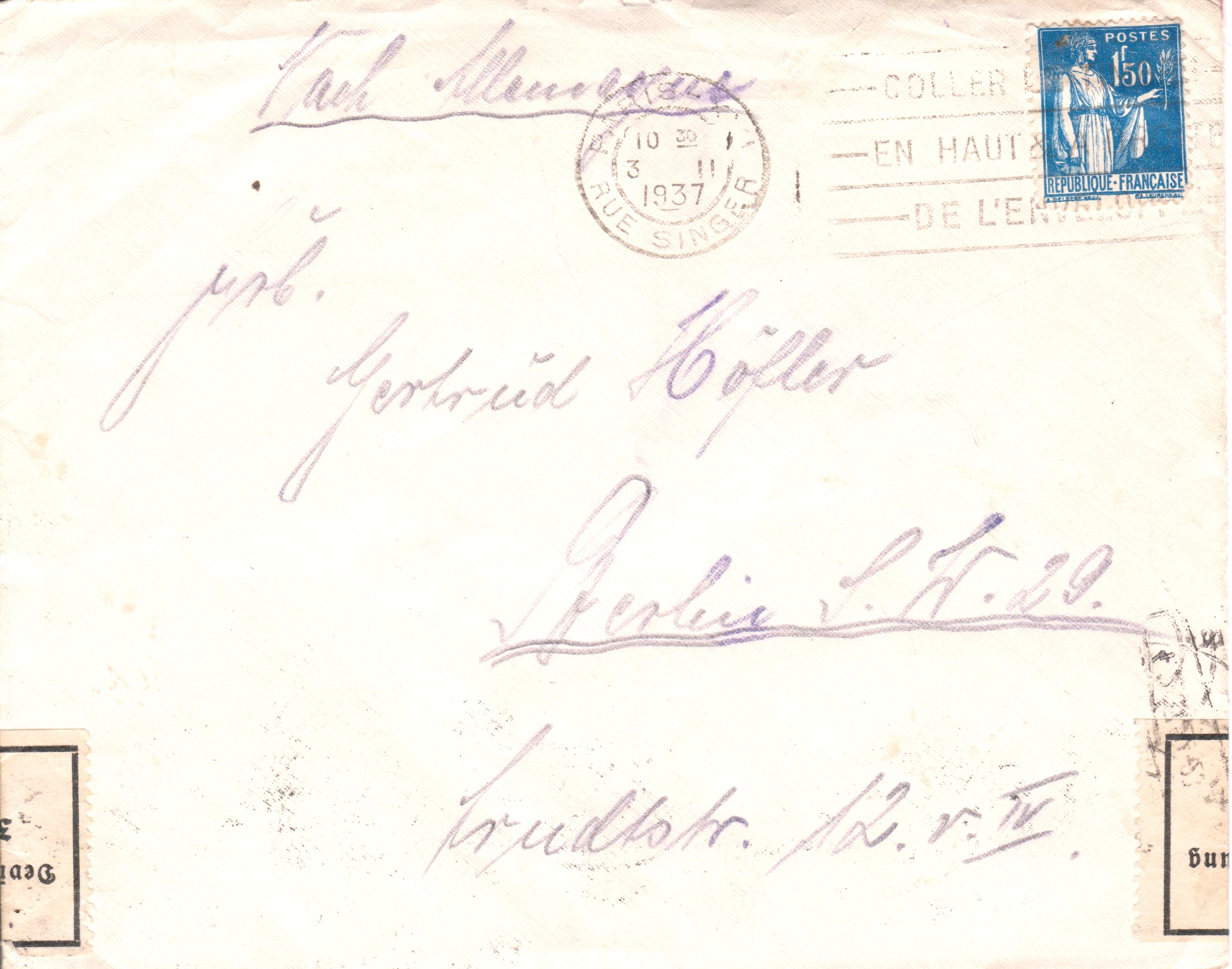 Nach Berlin adressierter Brief, aufgegeben am 03.02.1937 in Paris:
