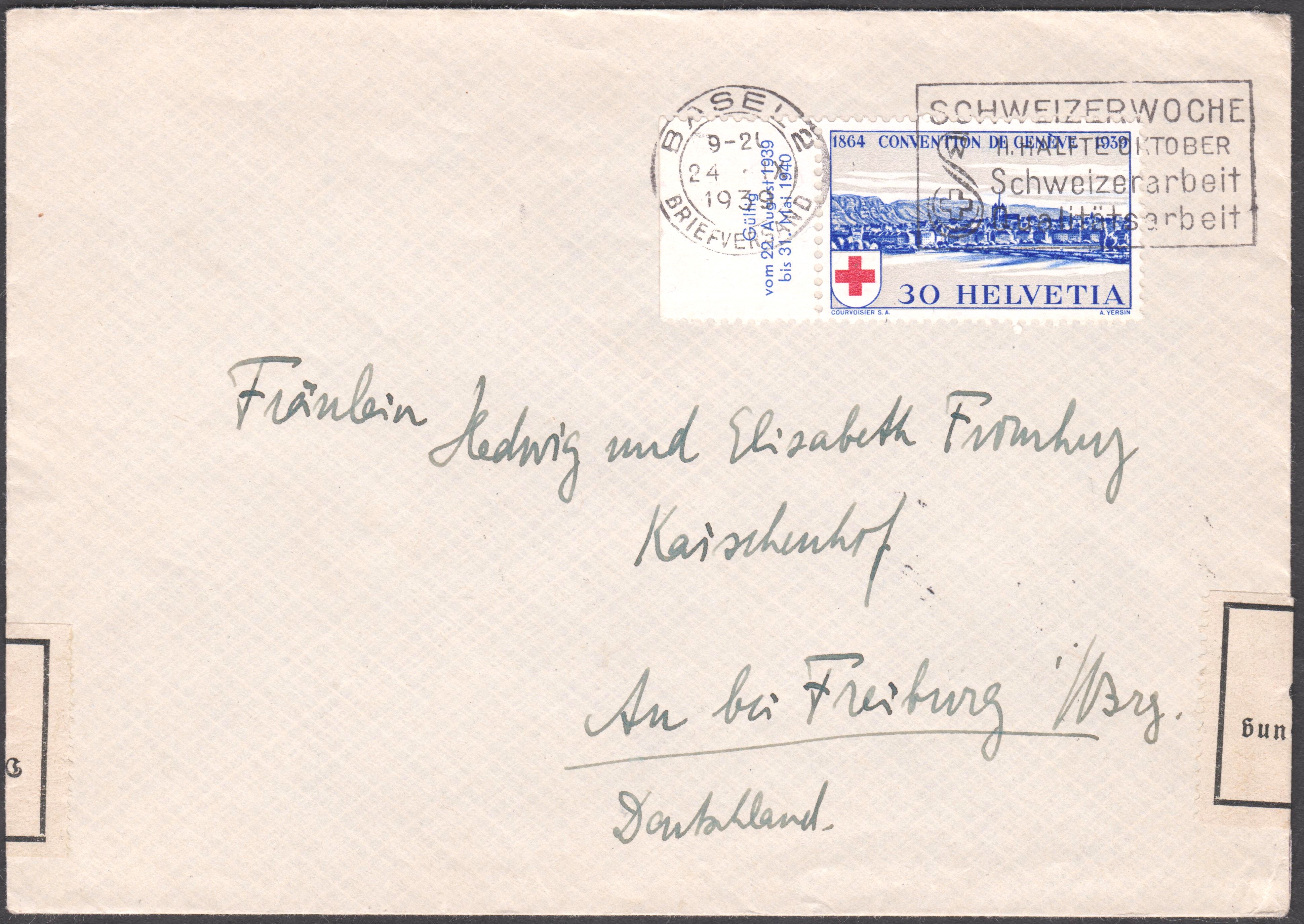 Dieser nach "Au bei Freiburg im Breisgau" adressierte Brief wurde am 24.09.1939 in BASEL aufgegeben: