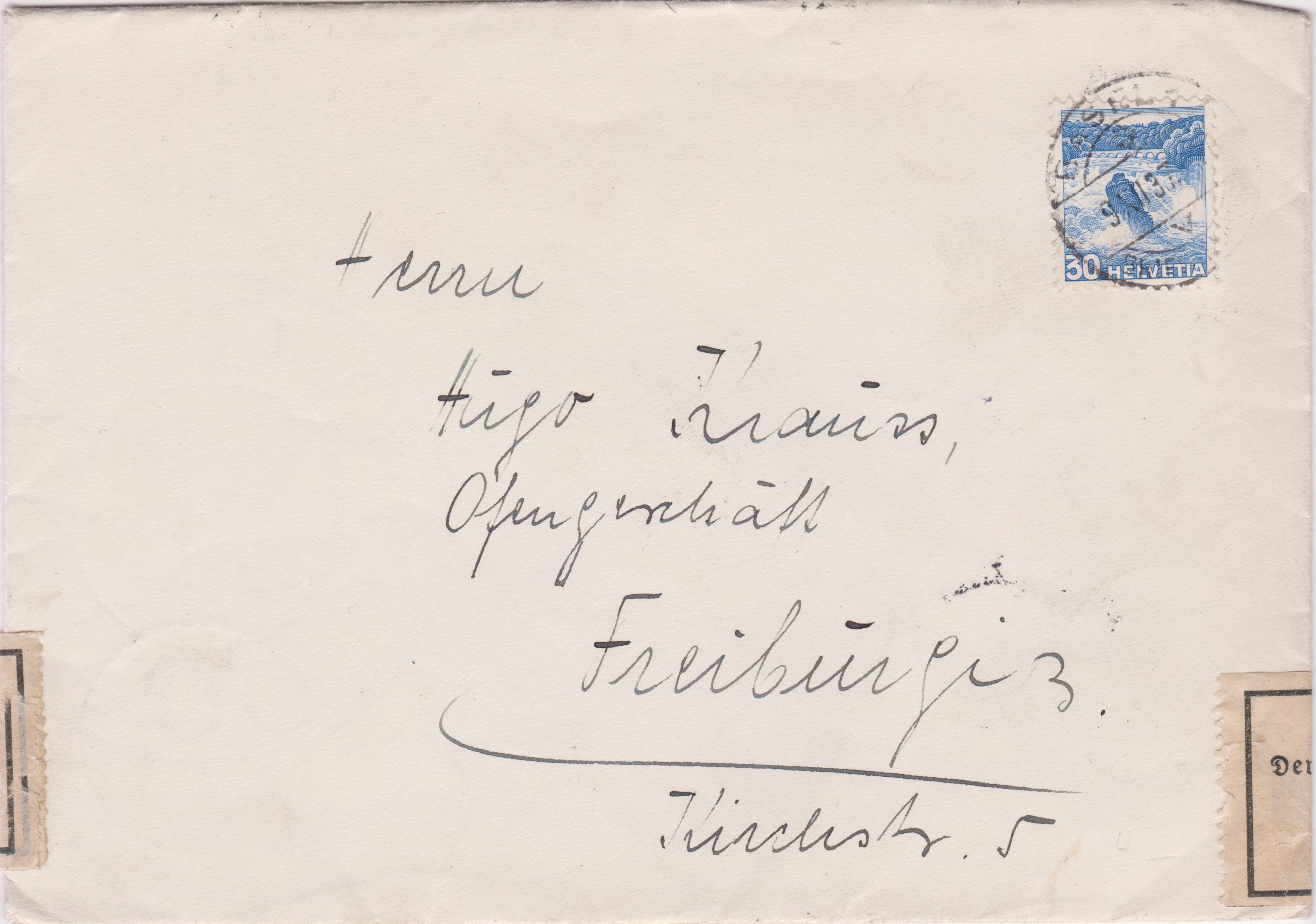 Der Brief wurde in FREIBURG (BREISGAU) rückseitig "Zur Devisenüberwachung zollamtlich geöffnet":