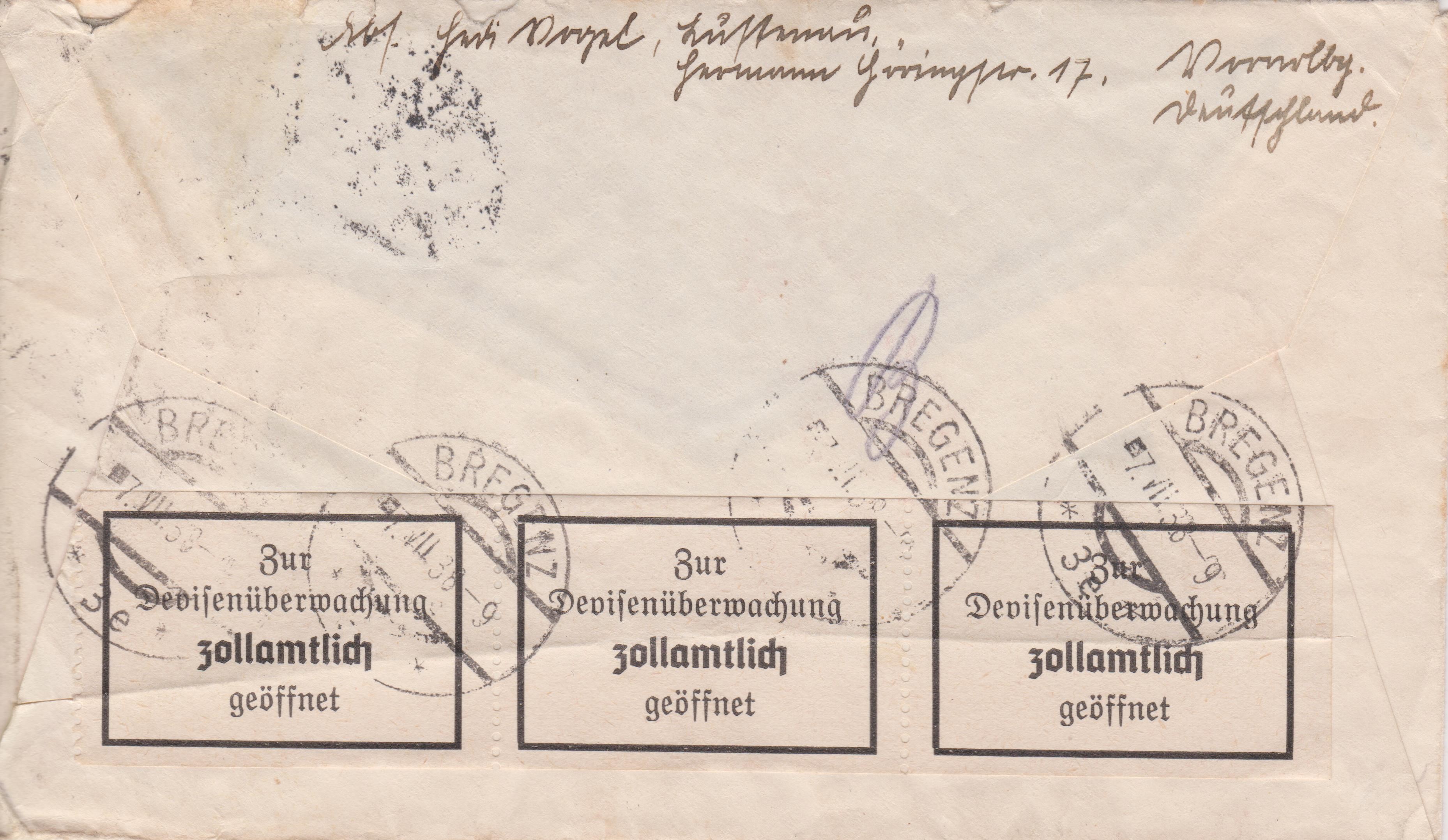 Der Brie wurde am 07.07.1938 in BREGENZ rückseitig "Zur Devisenkontrolle zollamtlich geöffnet" und nach erfolgter Prüfung mit einem Klebezettel wieder verschlossen, was vier Abschläge eines Tagesstempels "BREGENZ 3e" dokumentieren.