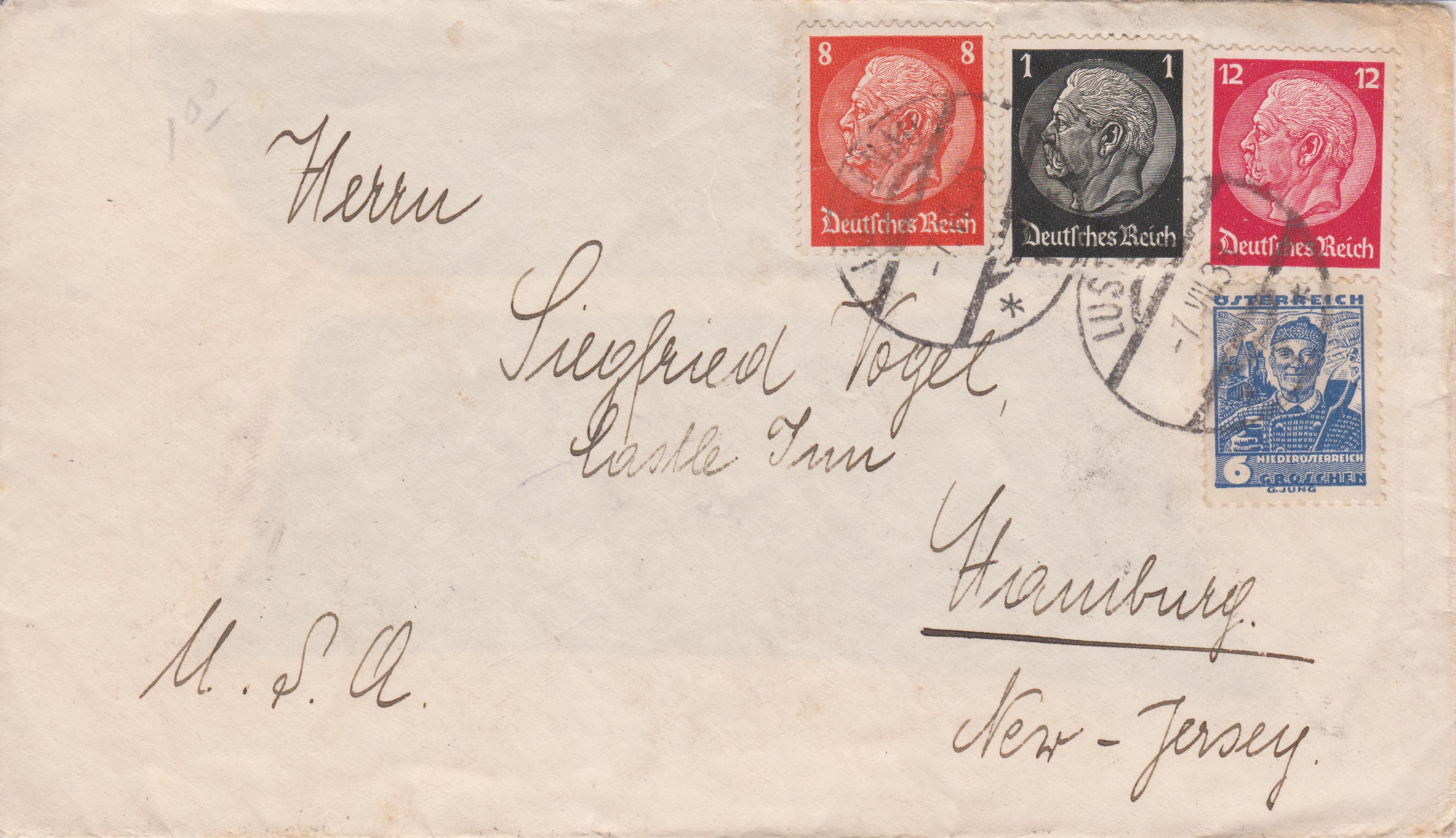 Dieser Brief in die USA wurde, frankiert mit 21 Pf der Dauerserie Hindenburg sowie 6 Groschen Österreich (= 4 Pf) am 07.07.1938 in LUSTENAU aufgegeben: