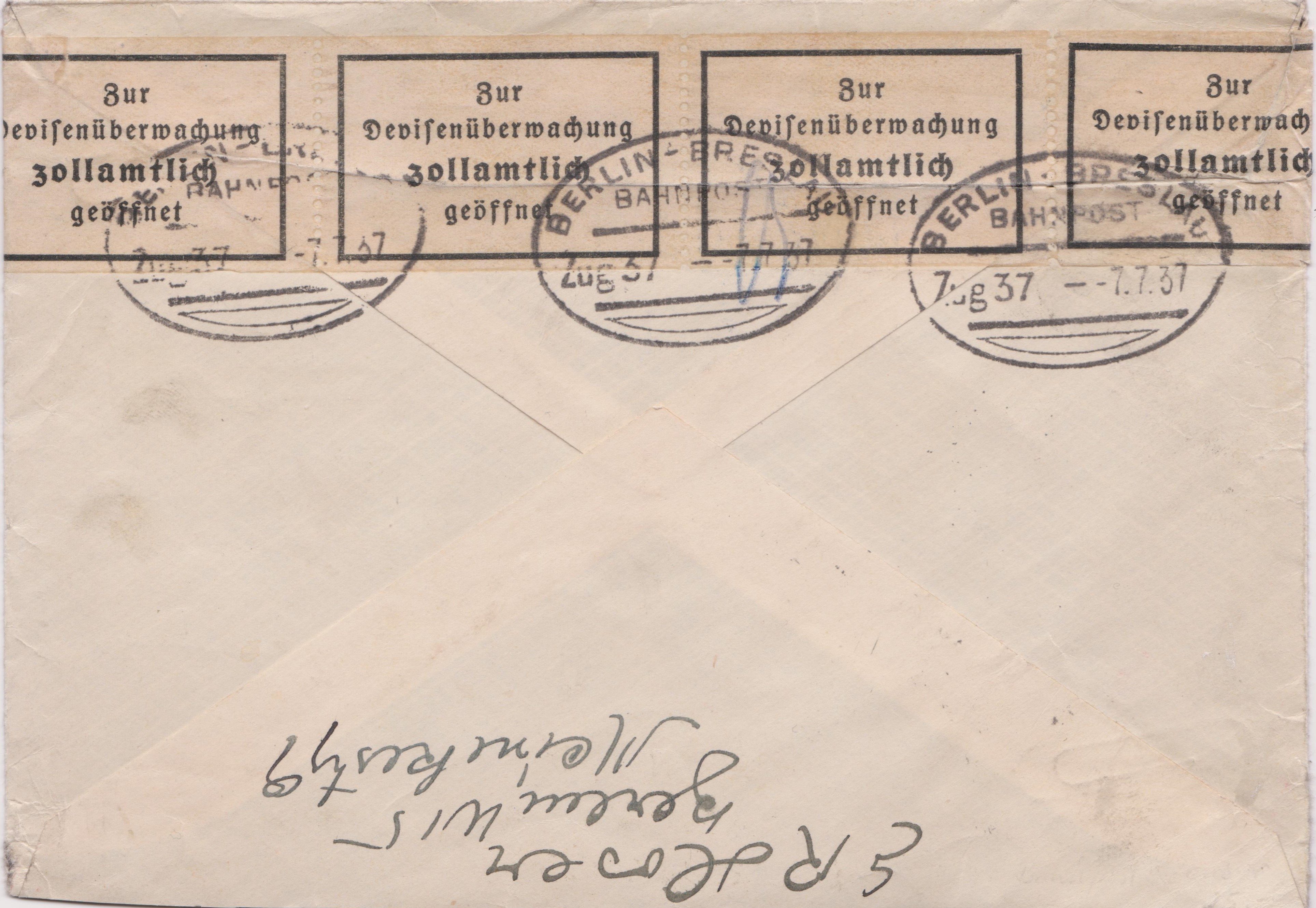 Der Beleg wurde von der BAHNPOST Zug 37 BERLIN - BRESLAU rückseitig geöffnet und nach erfolgter Devisenüberwachung wieder verschlossen: