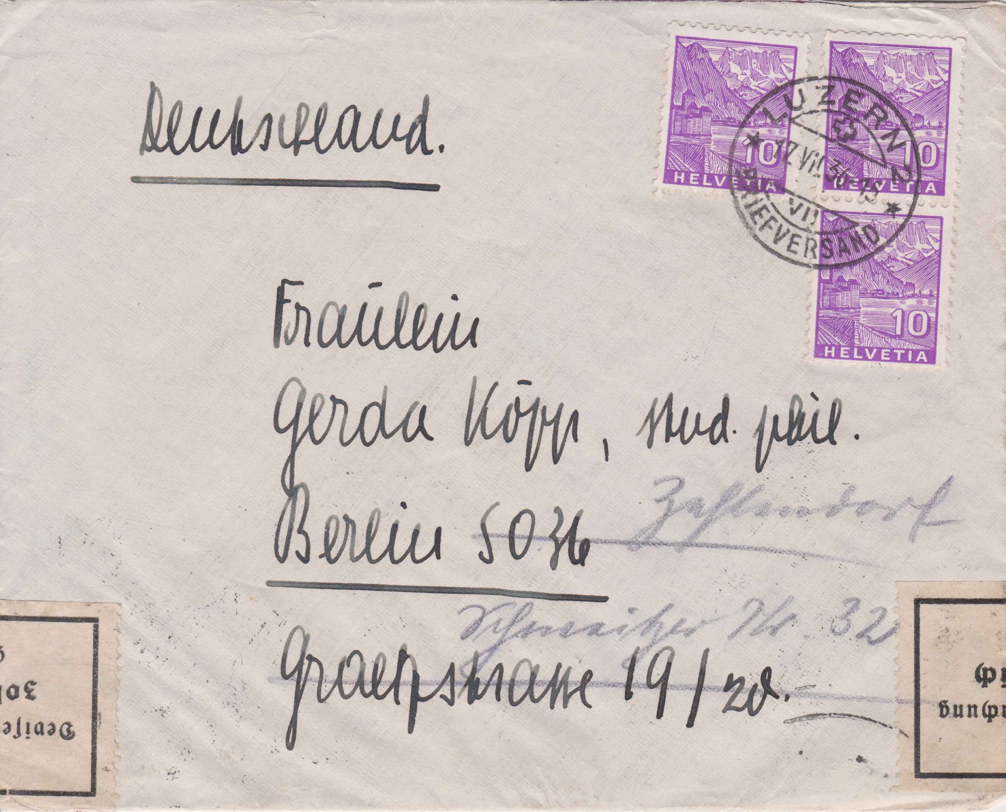 Dieser nach Berlin adressierte Brief wurde am 17.07.1936 in LUZERN aufgegeben: