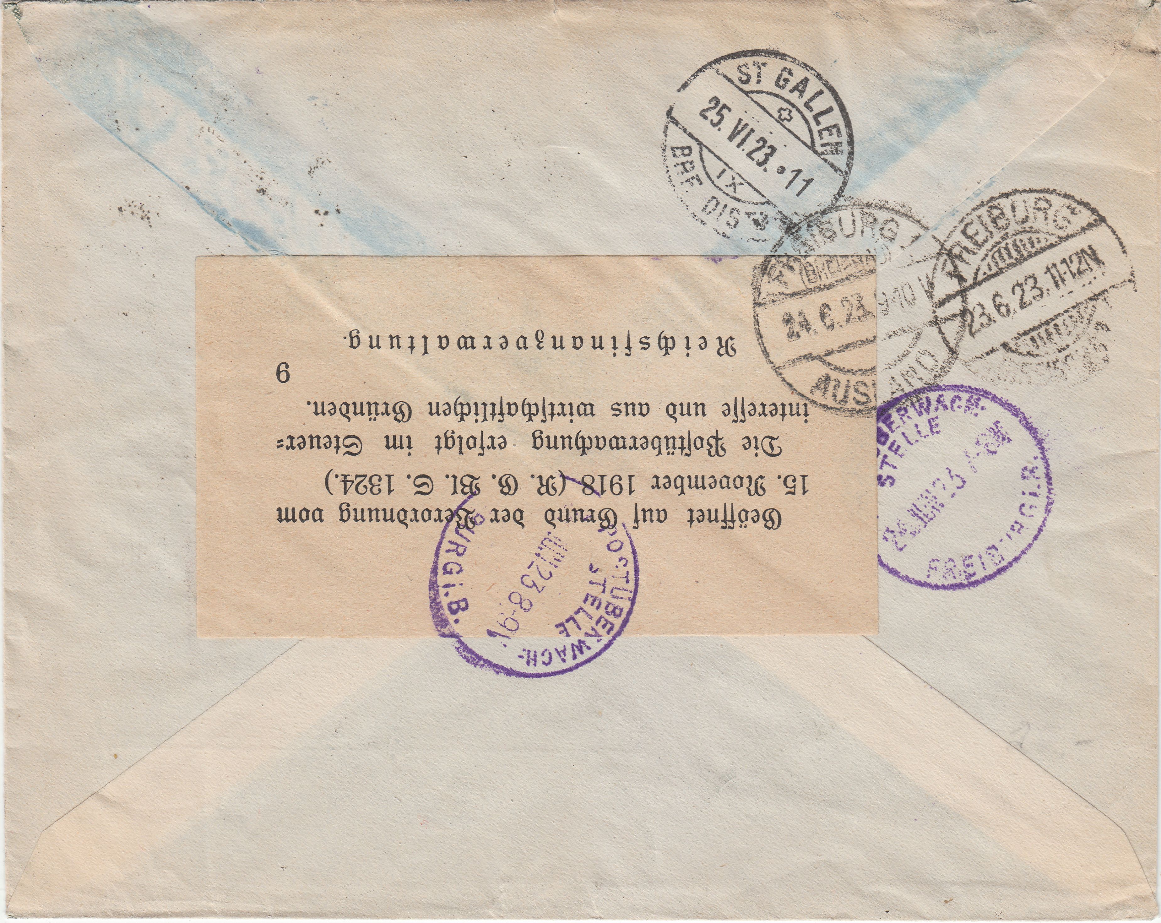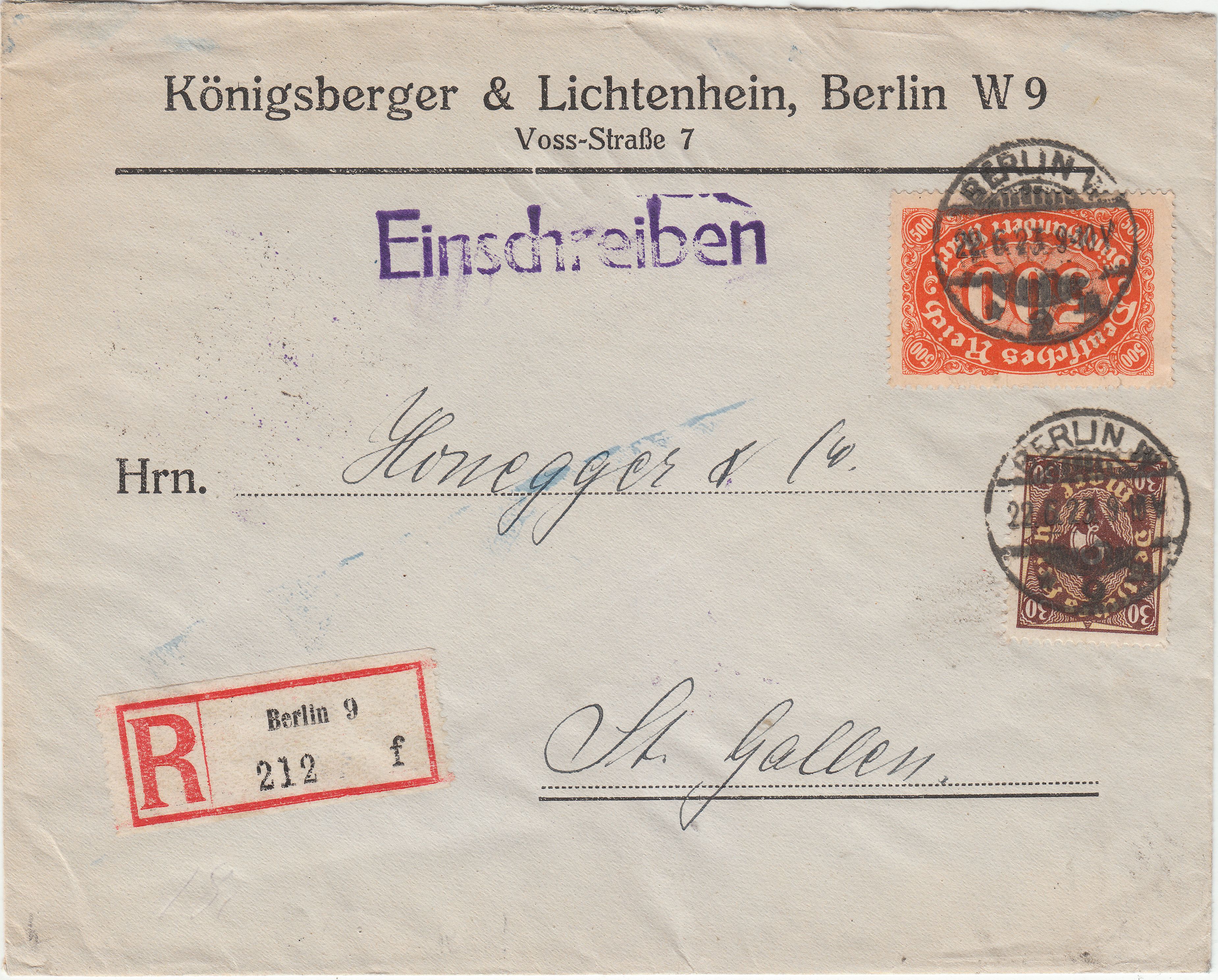 Hier ein am 22.06.1923 in "BERLIN W 9" per Einschreiben aufgegebener Brief, adressiert nach "St. Gallen":
