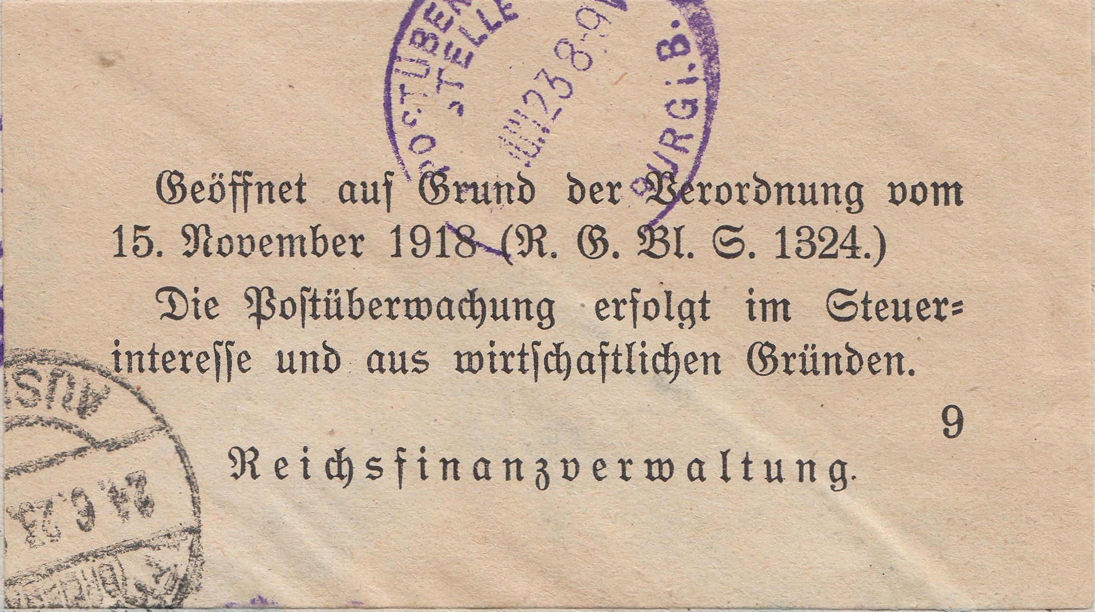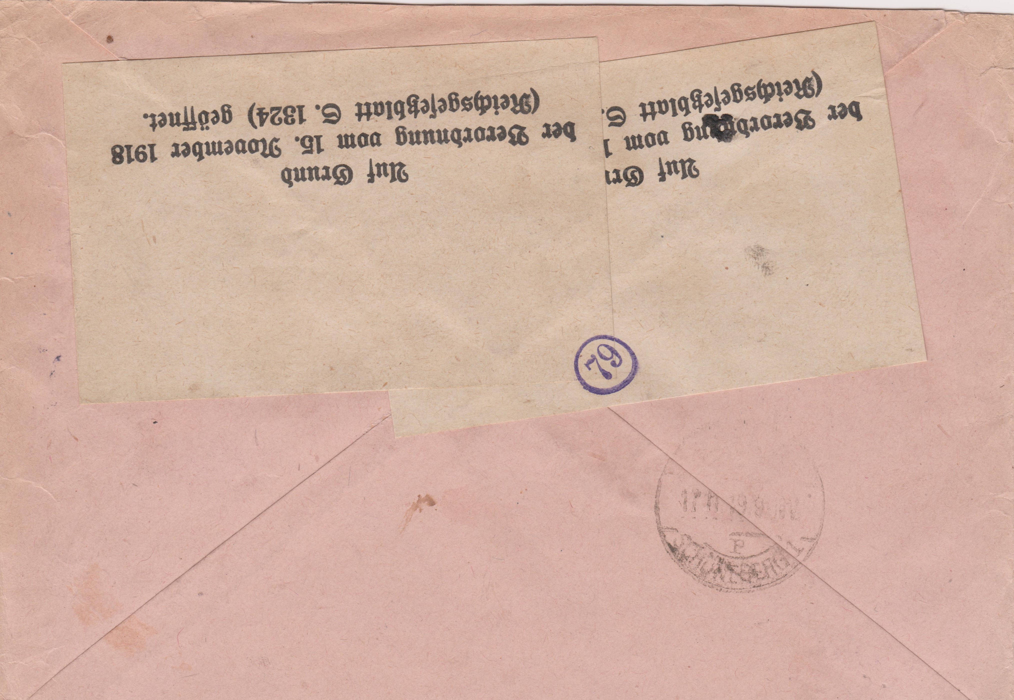 Auch dieser Brief wurde laut Verschlußzettel "Auf Grund der Verordnung vom 15. November 1918 (Reichsgesetzblatt S. 1324) geöffnet."!