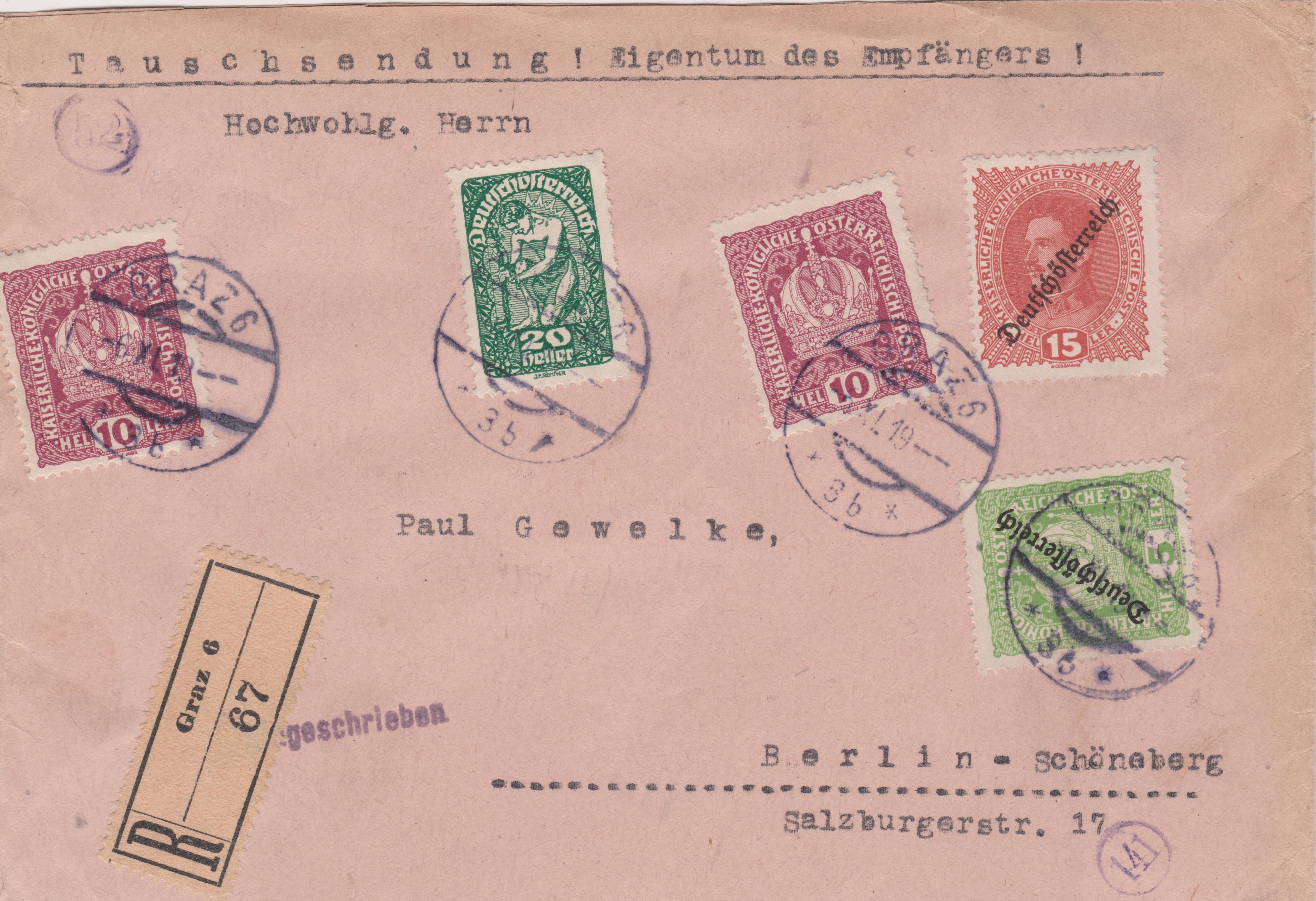 Dieser nach Berlin adressierte, am 06.11.1919 in Graz per Einschreiben aufgegebene Brief wurde tituliert als "Tauschsendung (Eigentum des Empfängers)":