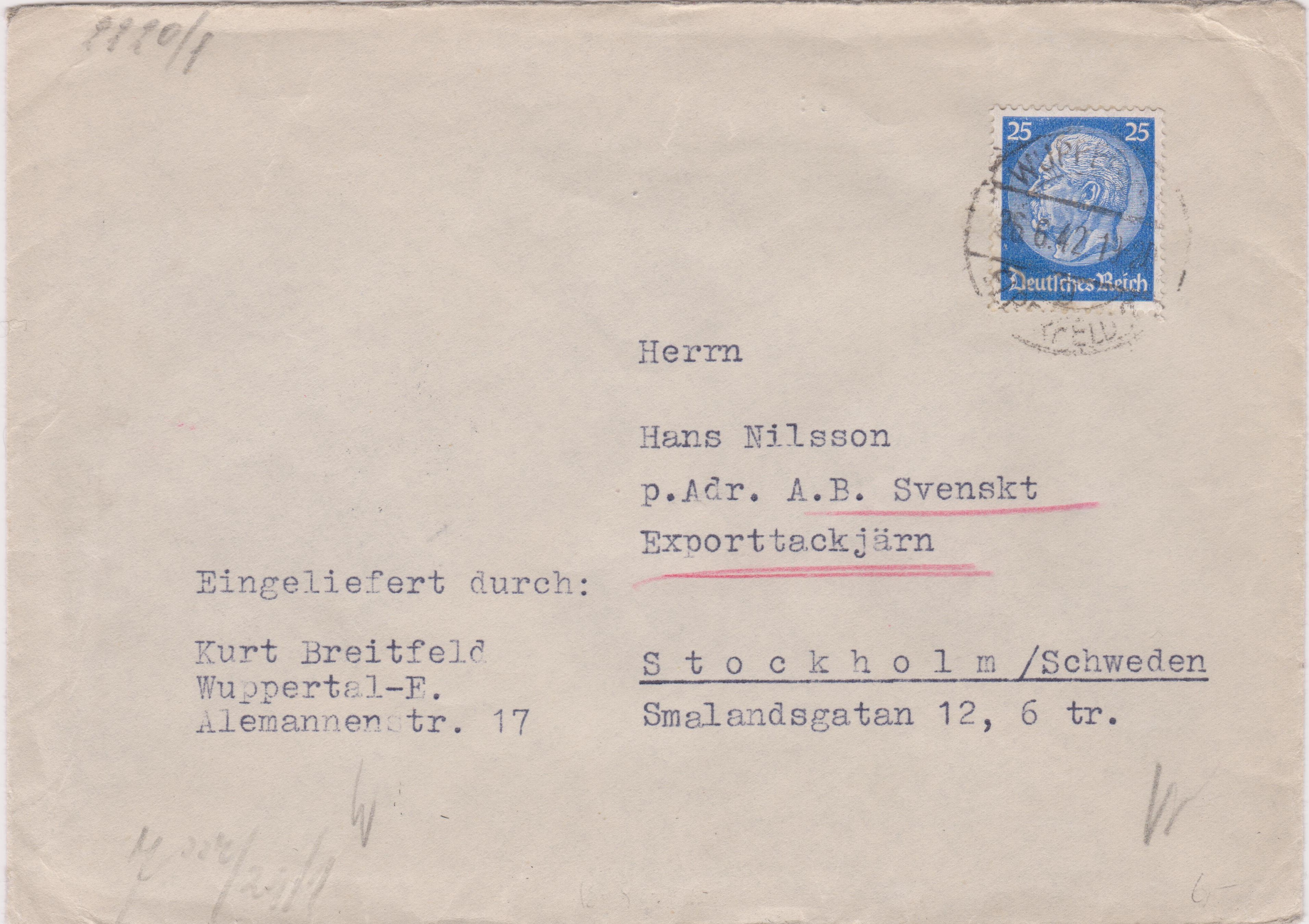 Nach Stockholm adressierter Brief, frankiert mit 25 Pf der Dauerserie Hindenburg, aufgegeben am 26.06.1942 in WUPPERTAL: