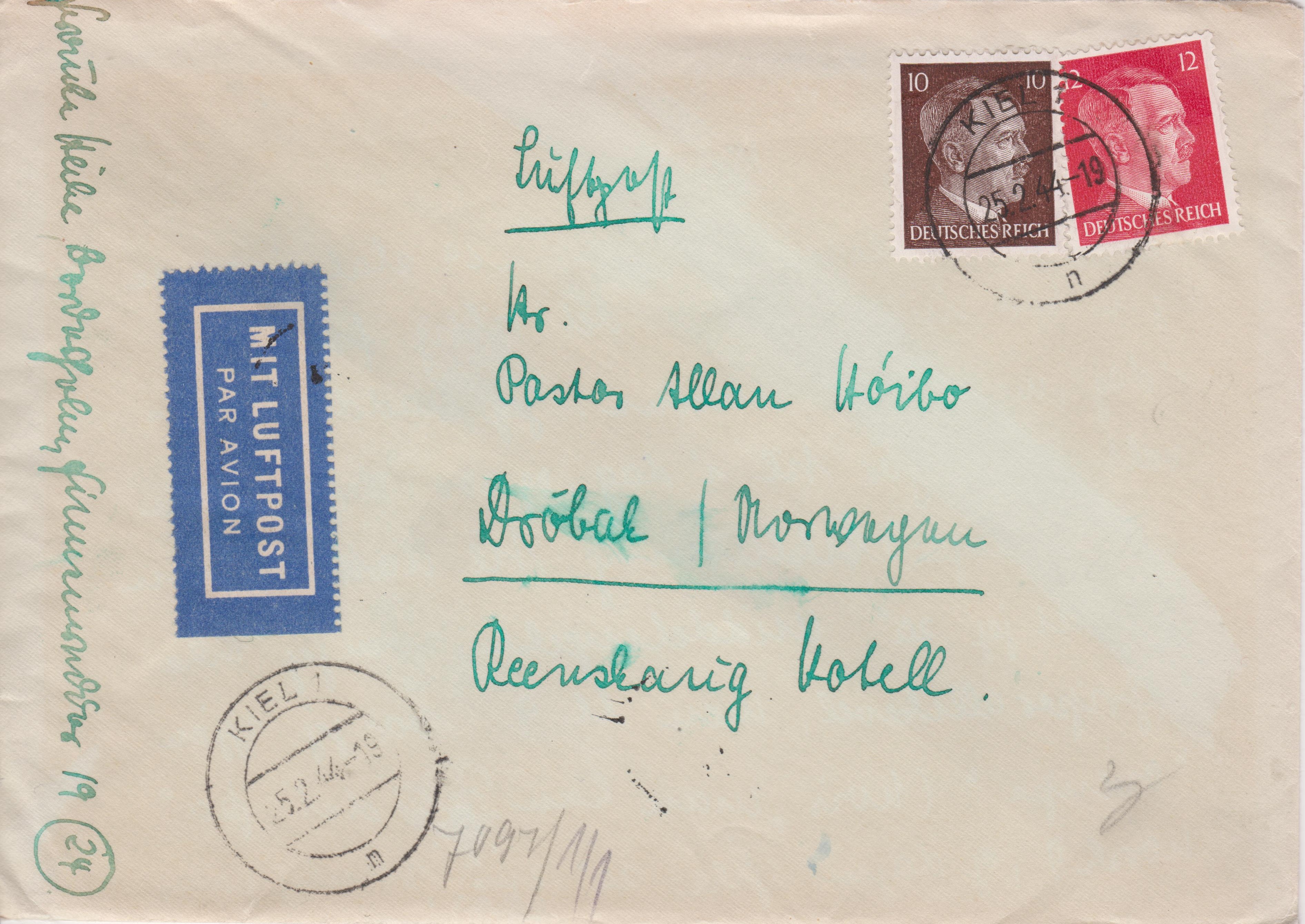 Dieser am 25.02.1944 um 19 Uhr in KIEL aufgegebene Luftpostbrief, Portostufe 22 Pf, wurde der ABP Berlin zugeleitet, wo er vorderseitig sowie rückseitig mit mehreren verschiedenen Chemikalien chemisch untersucht wurde: