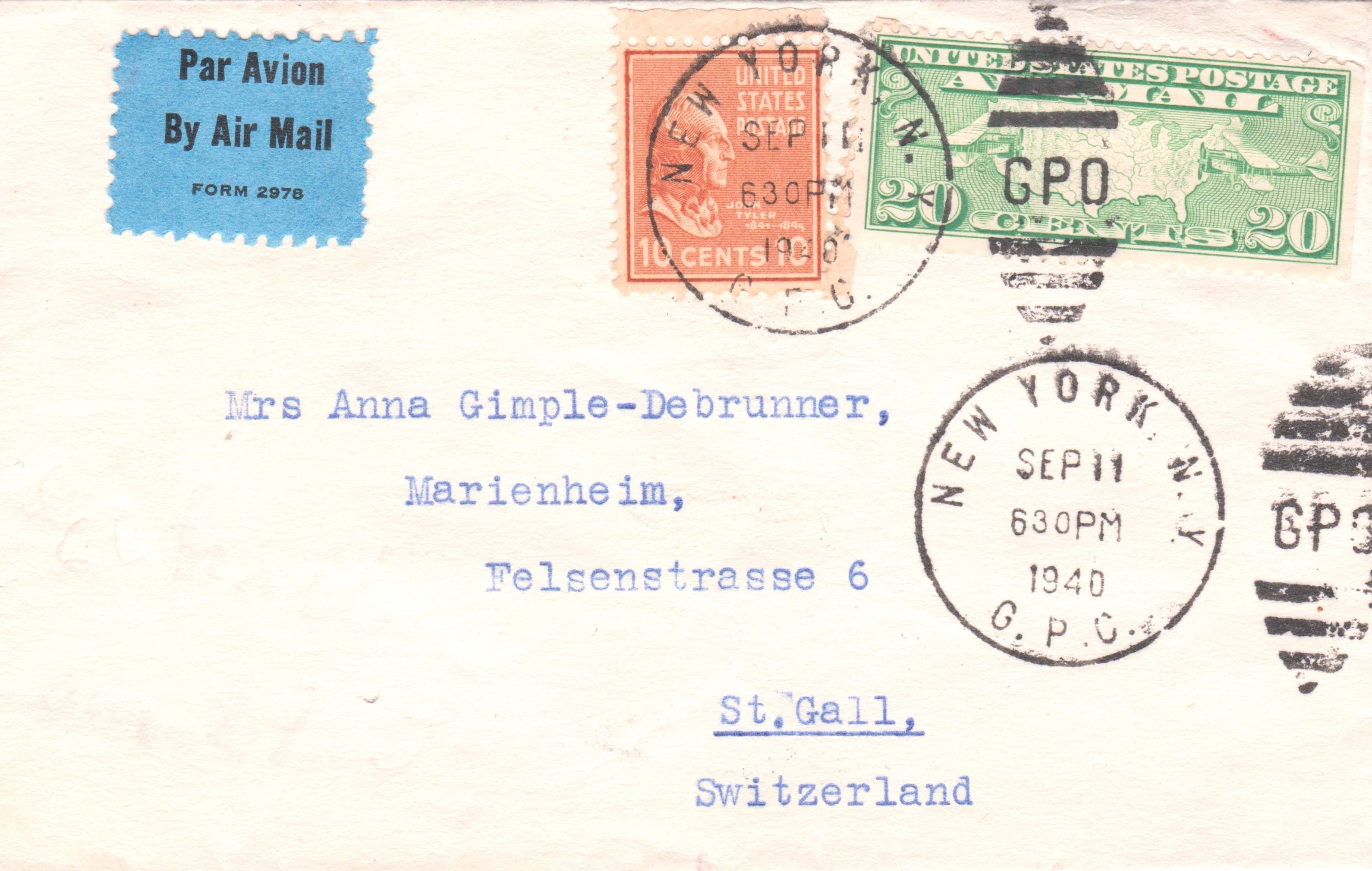 Dieser nach St. Gallen adressierte Luftpostbrief wurde am 11.09.1940 in New York aufgegeben: