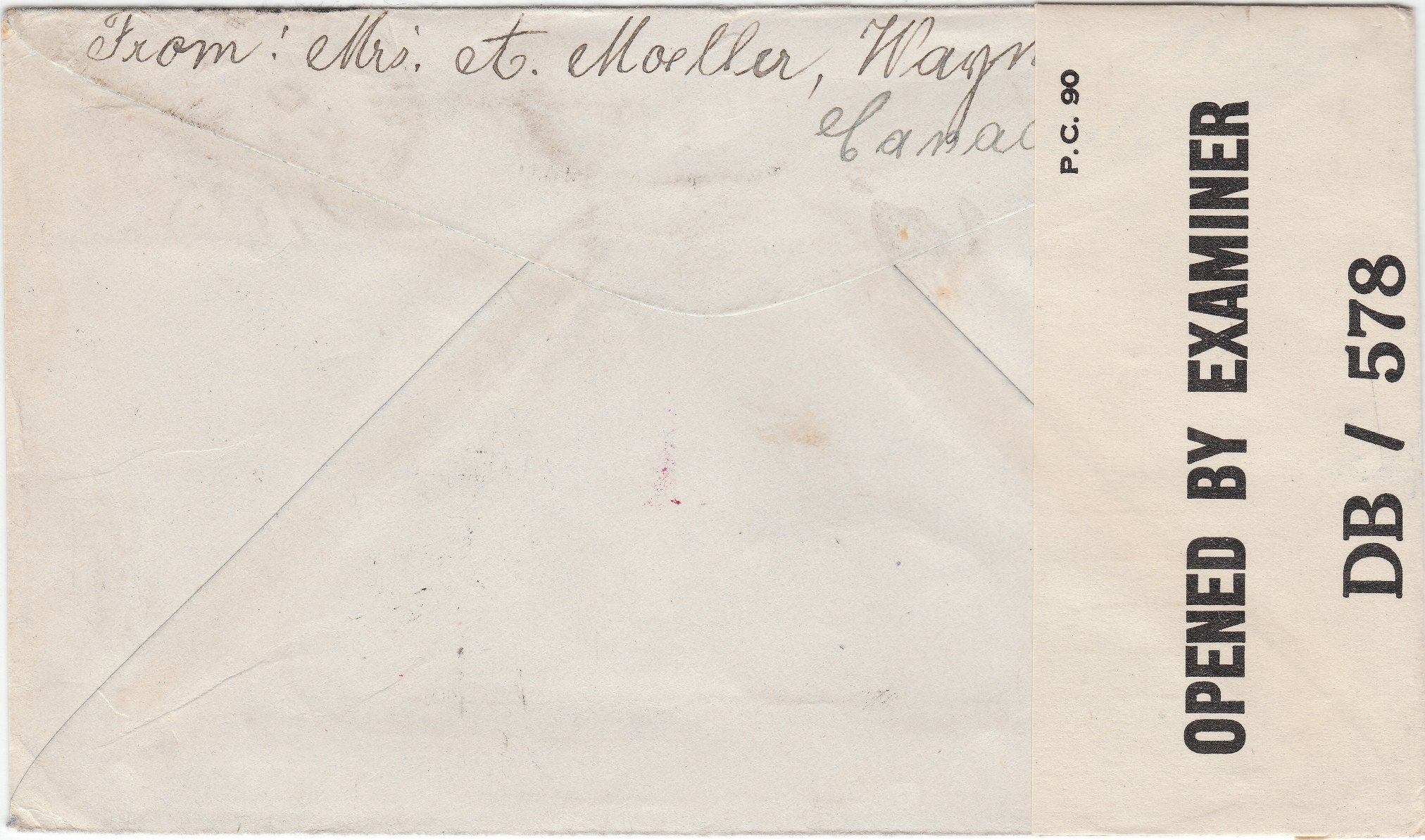 Dieser nach Genf in der Schweiz adressierte Brief wurde am 15.02.1944 in Wayne, Alberta, in Kanada aufgegeben: