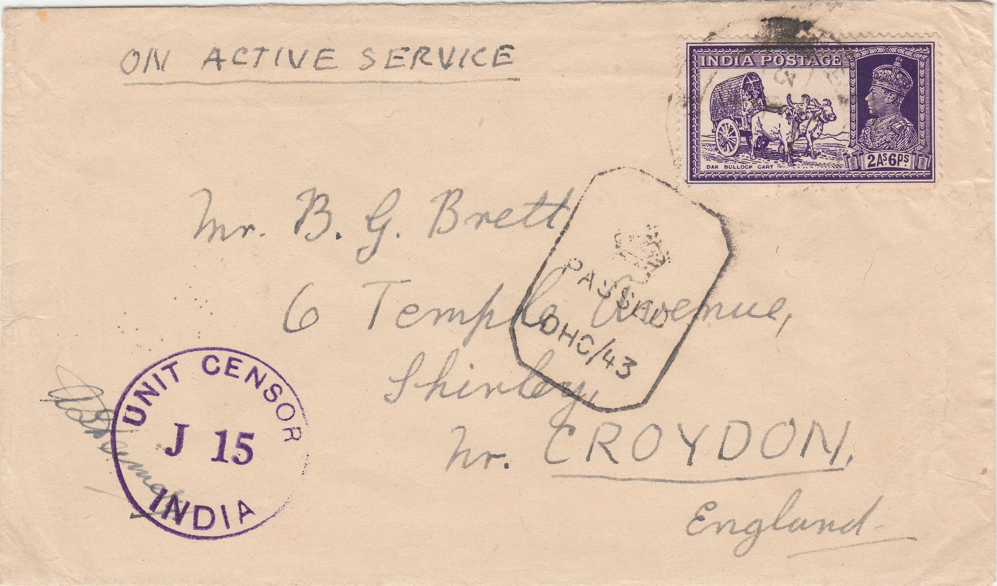 In Indien wurden zur Feldpostzensur während des Zweiten Weltkriegs meistens solche Einkreisstempel mit 30 mm Durchmesser und der Inschrift "UNIT CENSOR INDIA" in Violett verwendet, die in der Mitte einen Großbuchstaben = Versalie sowie eine Ziffer trugen, in diesem Beispiel "J 15". Dieses Exemplar zeigt diesen Zensurstempel mit handschriftlicher Signatur des Zensors: