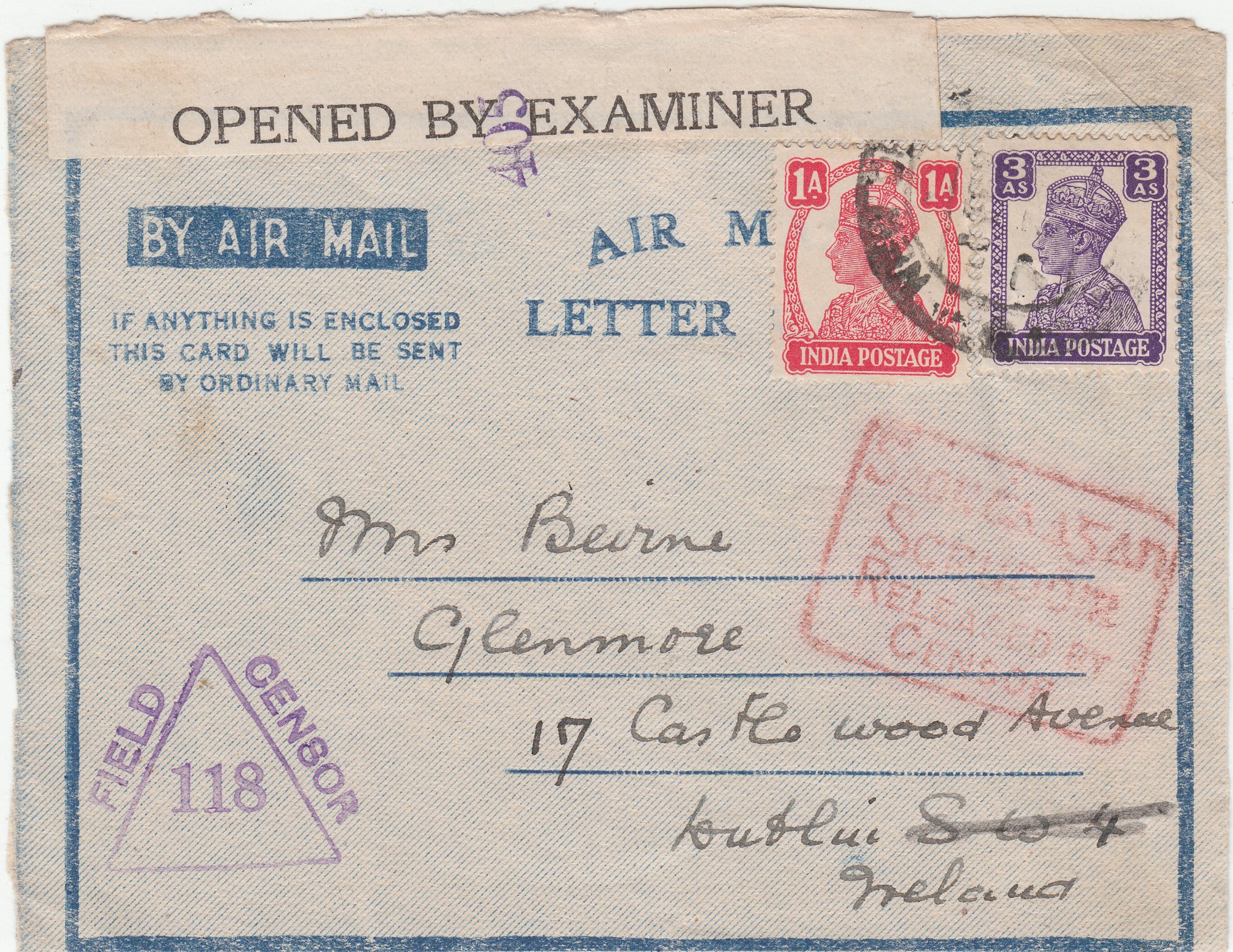 Dieser Beleg, von dem leider nur noch die Vorderseite erhalten ist, wurde von der indischen Feldpostzensur oben geöffnet und mit einem Verschlußzettel "OPENED BY EXAMINER" wieder verschlossen, was ein Stempel "405" in Violett dokumentiert: