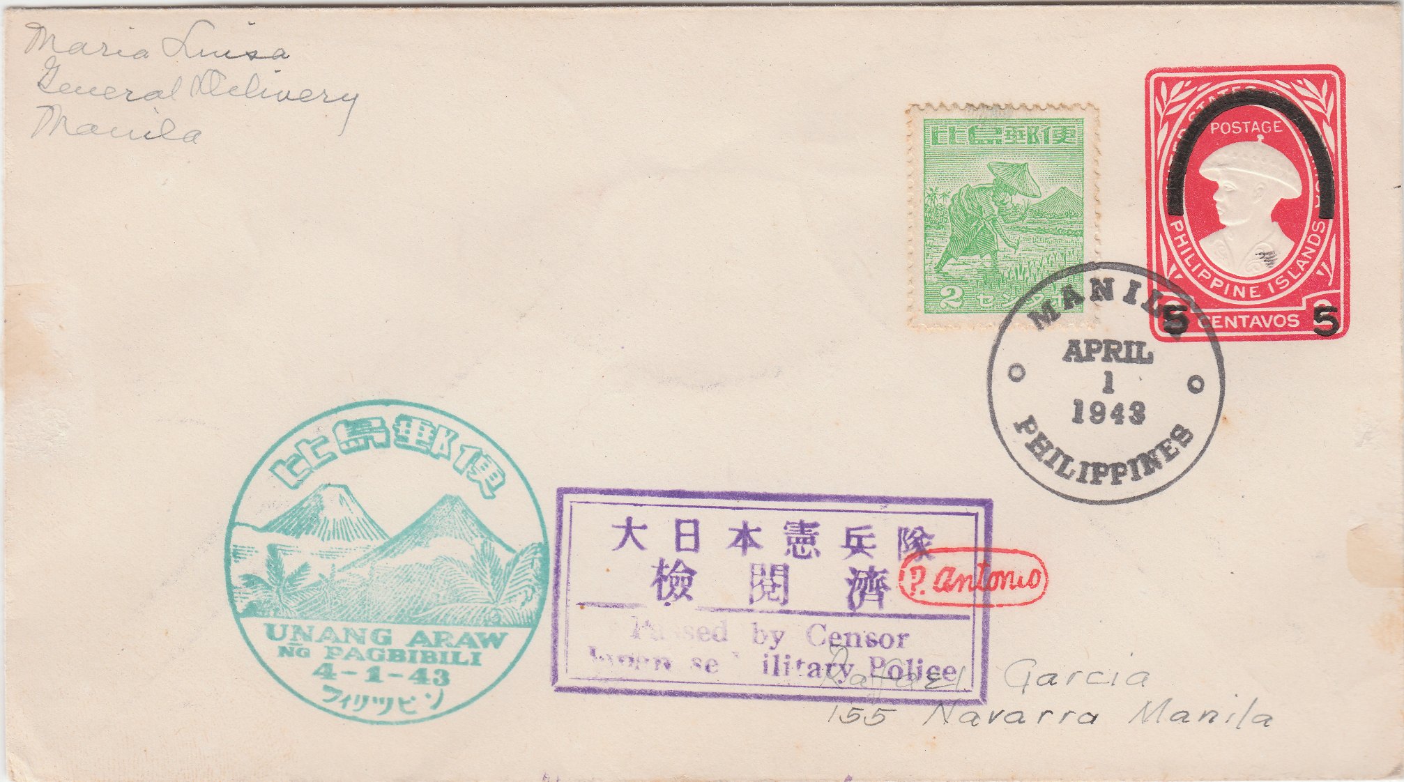 Der Beleg wurde dann am 01.04.1943 mit einer Zusatzfrankatur versehen als Ortsbrief in Manila aufgegeben und lief durch die Zensur der japanischen Militärpolizei, wo ein zweisprachiger Stempel japanisch/englisch in Violett abgeschlagen wurde: