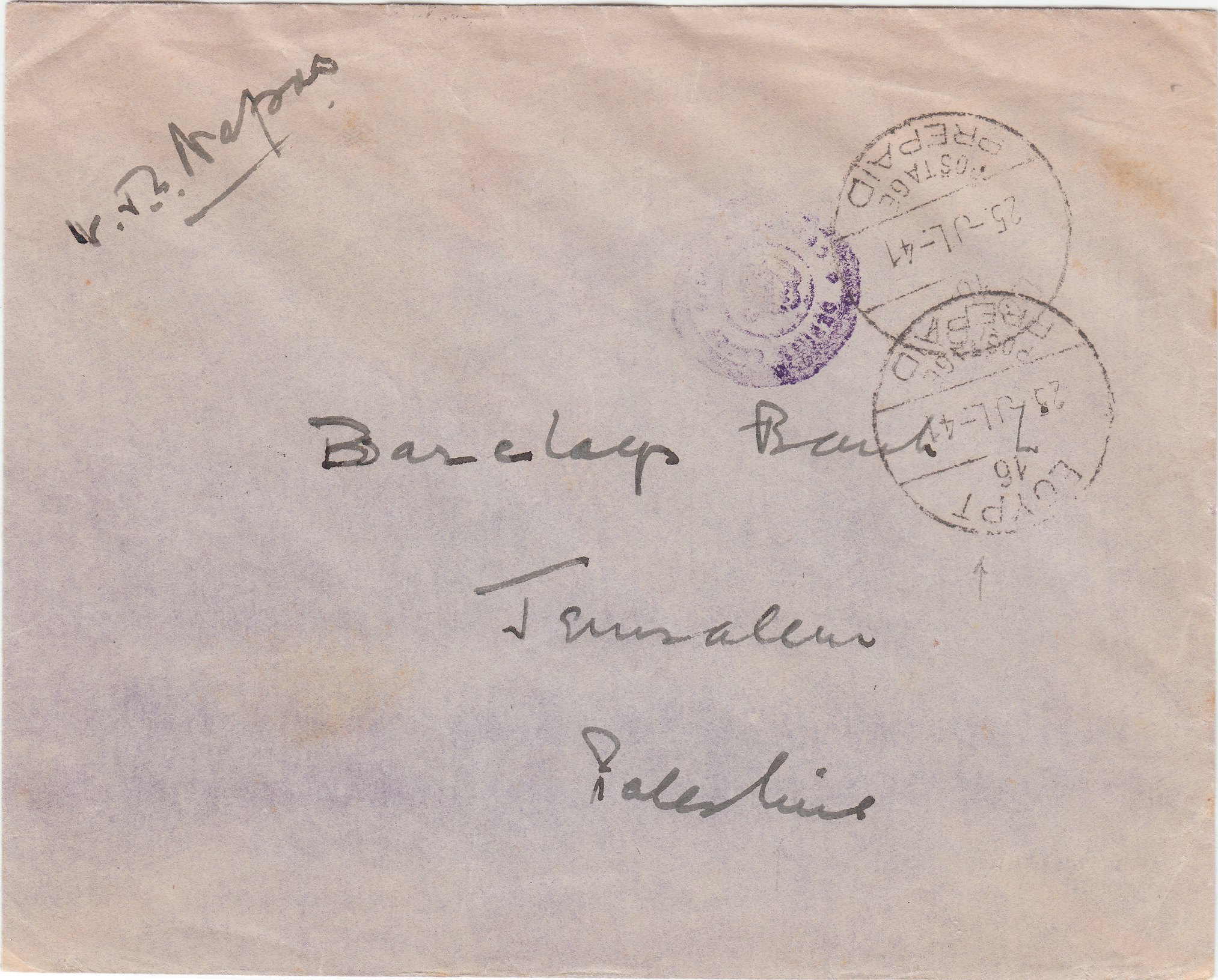 Dieser nach Jerusalem in Palästina adressierte Brief wurde am 25.07.1941 in Ägypten aufgegeben und trägt zwei Abschläge eines Tagesstempels "EGYPT 16 POSTAGE PREPAID":