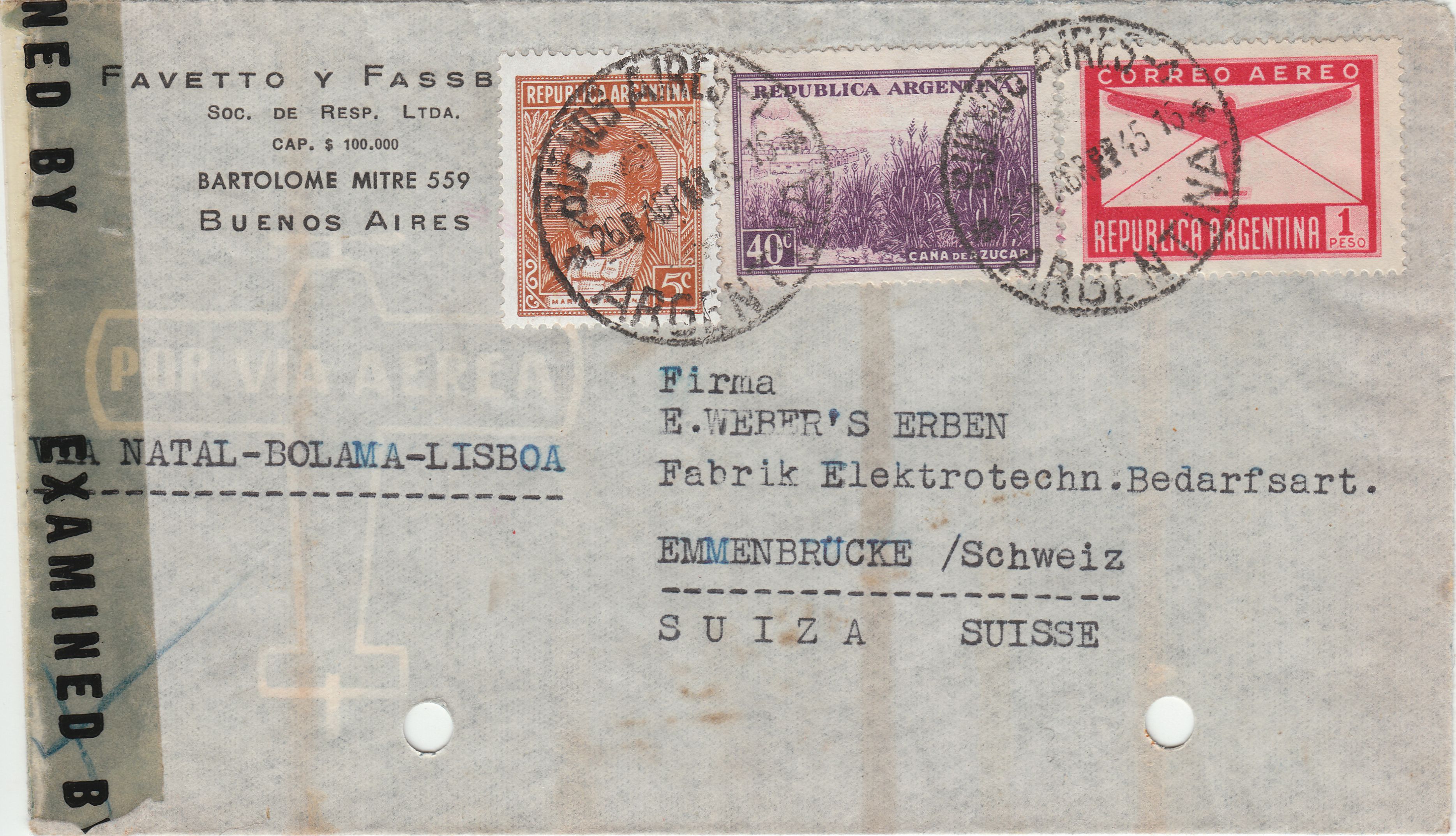 Hier als erstes Beispiel ein nach Emmenbrücke adressierter Brief, aufgegeben am 26.04.1945 in BUENOS AIRES in Argentinien:
