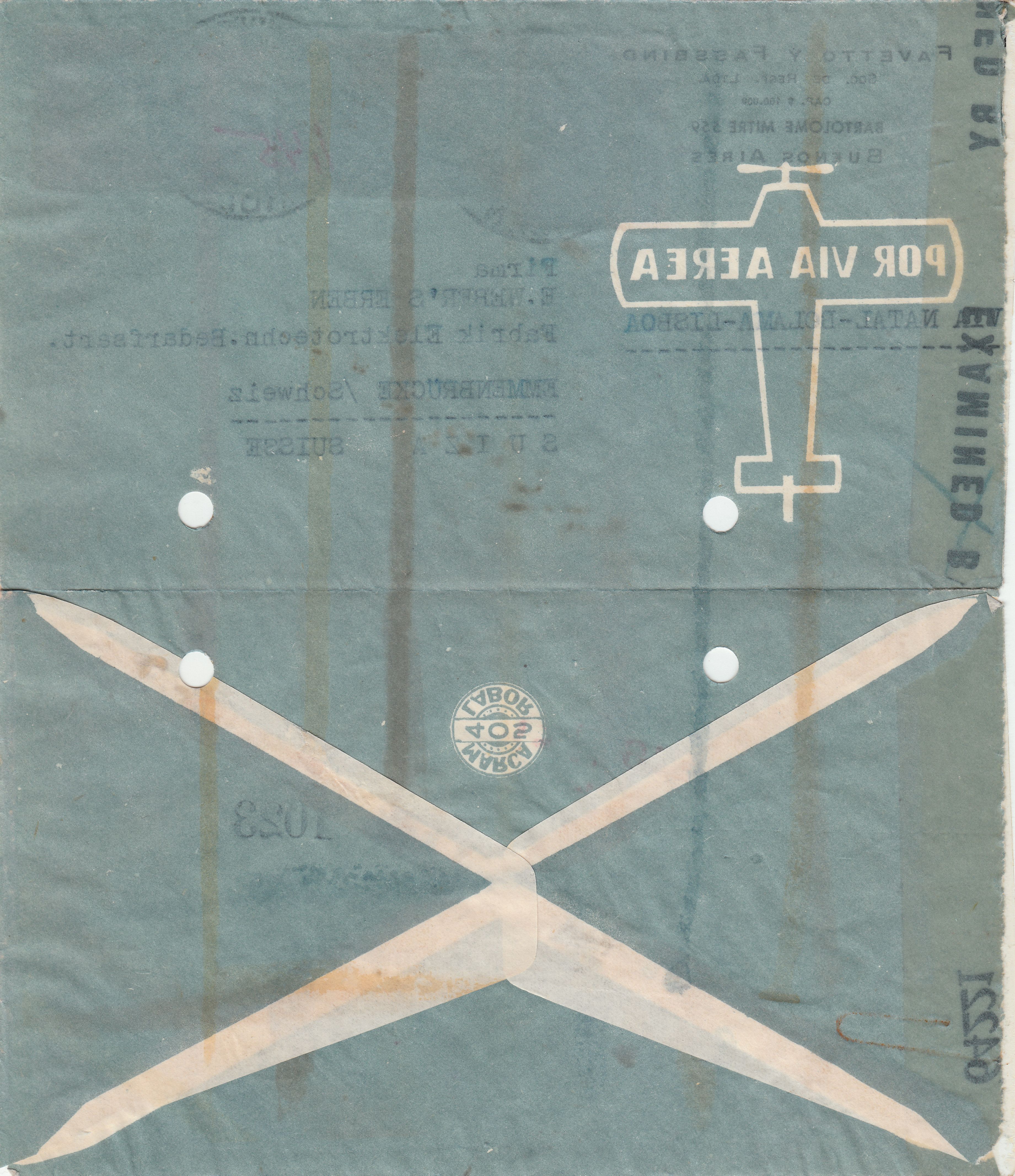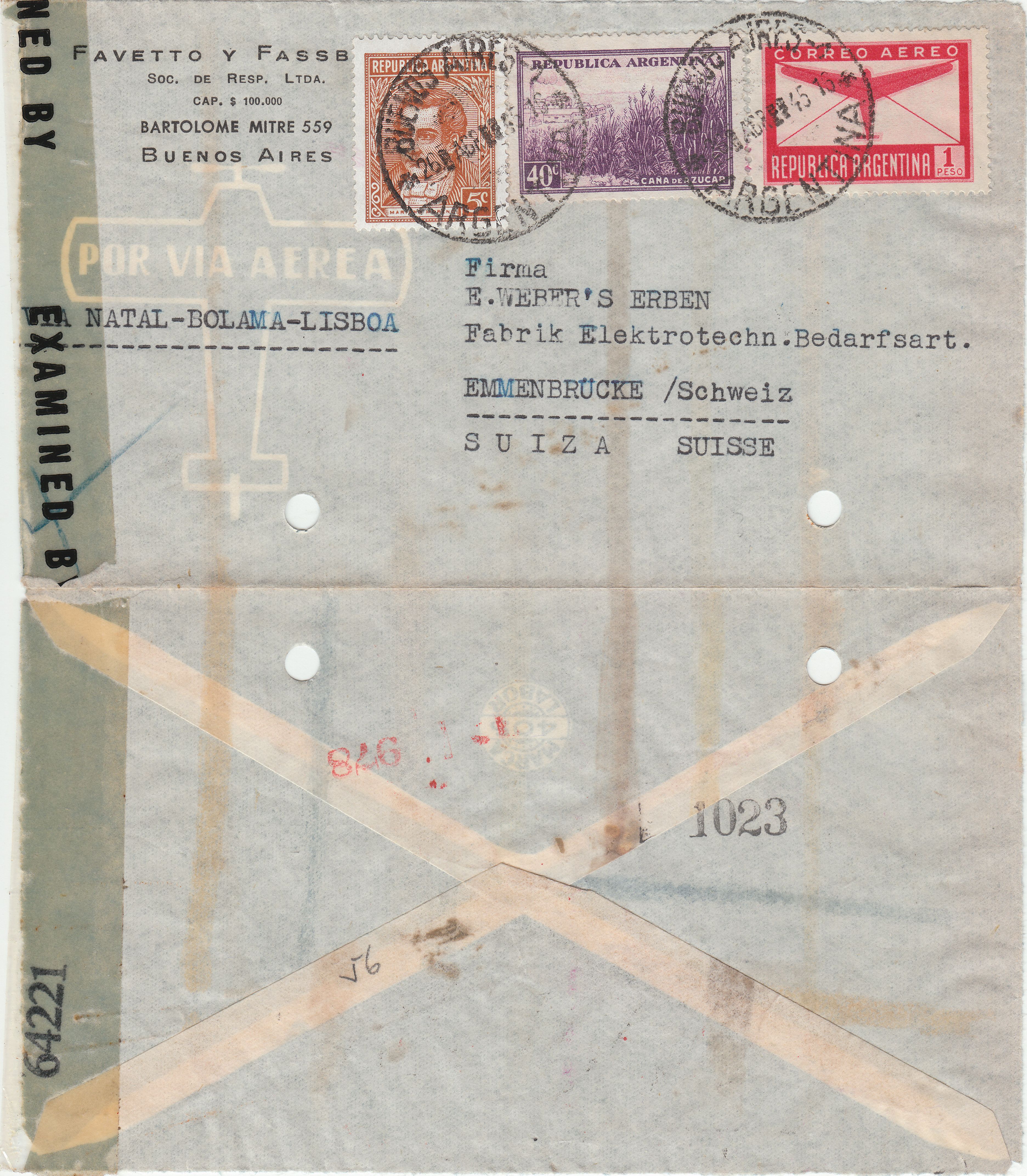 Dieser Brief wurde befördert von Buenos Aires über Rio de Janeiro, Port of Spain, San Juan, Miami, New York, Horta, Lissabon und Zürich nach Emmenbrücke.