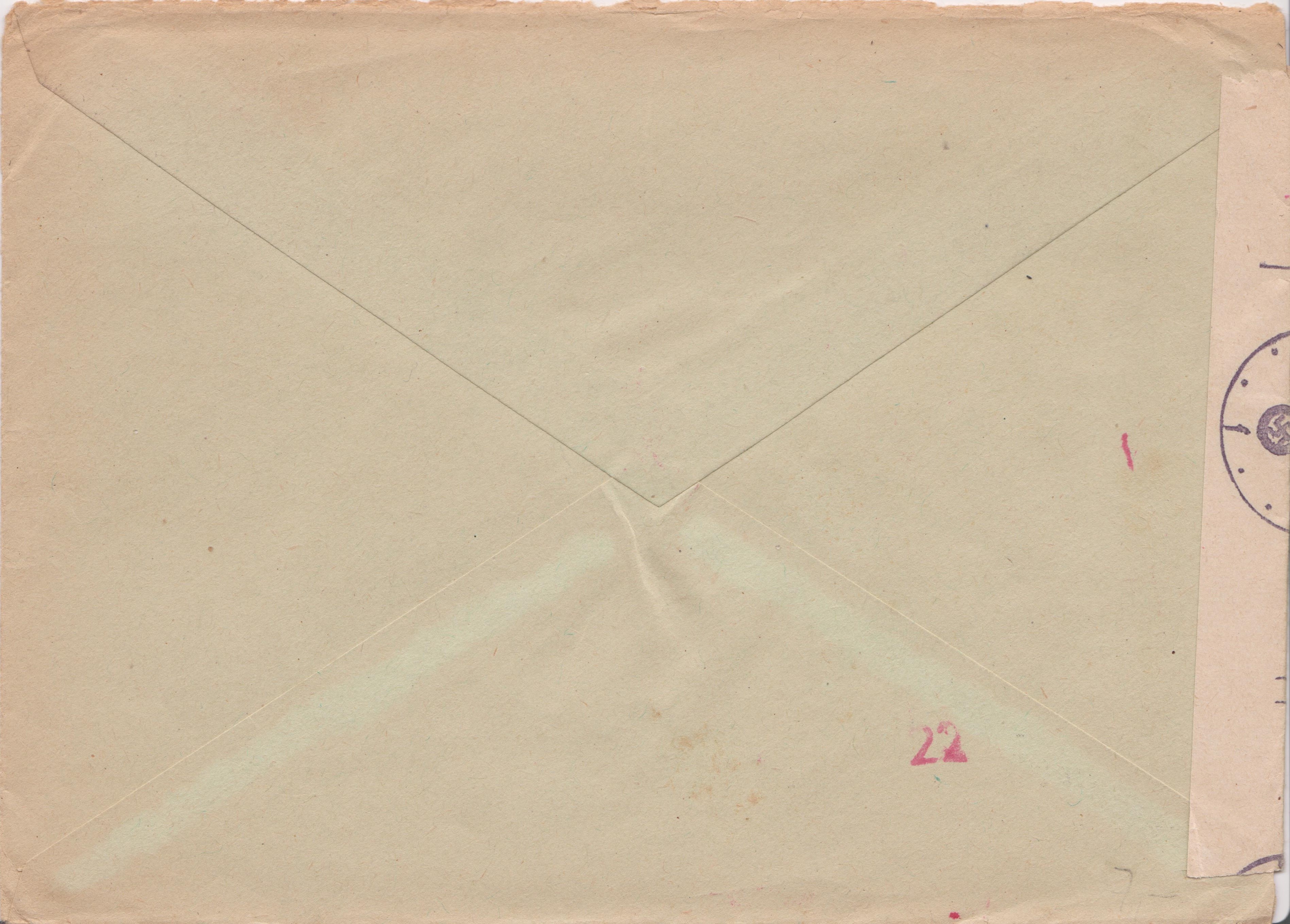 Der Brief wurde der Auslandsbriefprüfstelle Hamburg zugeleitet, wo er rückseitig geöffnet und nach erfolgter Prüfung mit einem Verschlußstreifen "Geöffnet Oberkommando der Wehrmacht f", Landsmann FV2.1, wieder verschlossen wurde, was ein Prüfstempel in Rot, Landsmann FP2.5, dokumentiert.