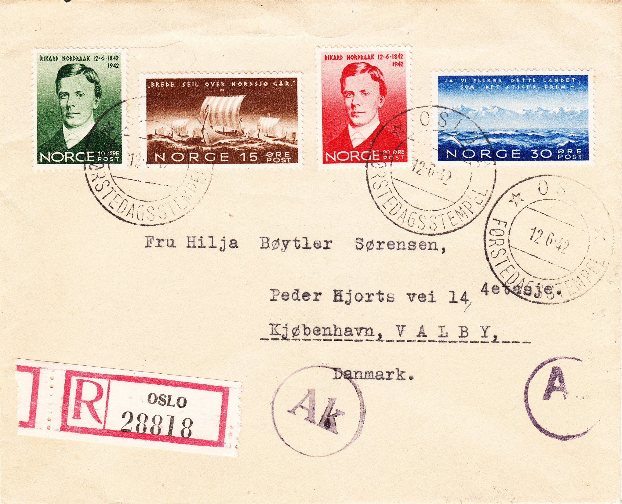 Hier ein nach Kopenhagen adressierter Brief, der als FDC am 12.06.1942 in Oslo aufgegeben wurde:
