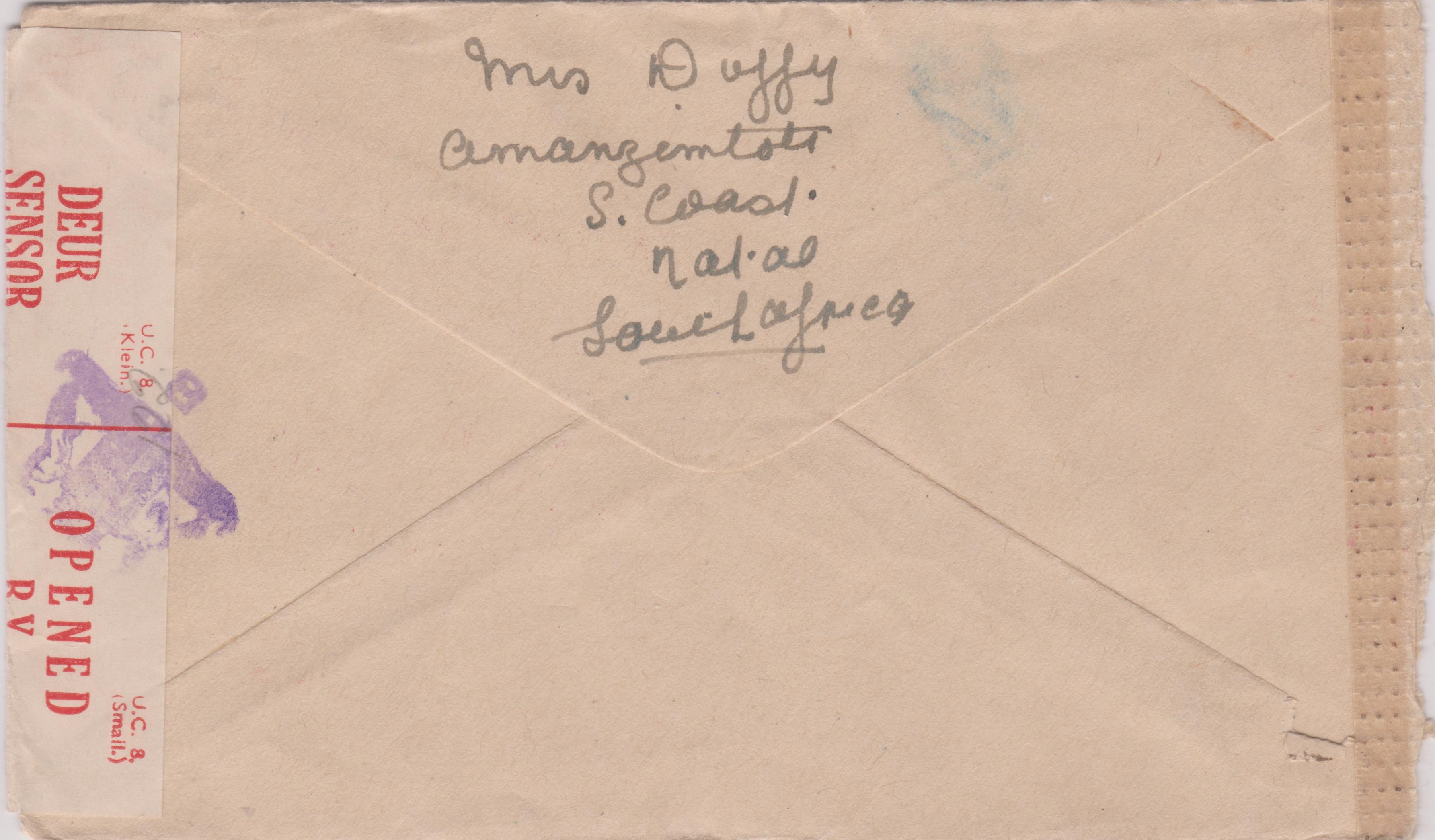 Der Beleg durchlief die Zensurstelle in Südafrika, wo er rechtsseitig geöffnet und nach erfolgter Prüfung mit einem Verschlußzettel wieder verschlossen wurde, was ein rückseitig abgeschlagener Prüfstempel dokumentiert.