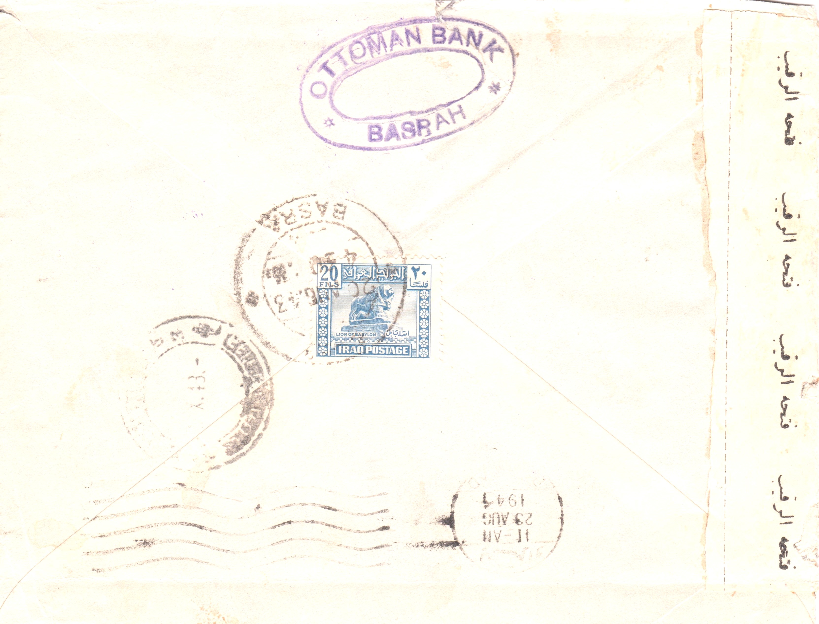 Bankbrief, adressiert nach TEHERAN (IRAN) aufgegeben am 20.08.1943 in BASRAH (IRAK).