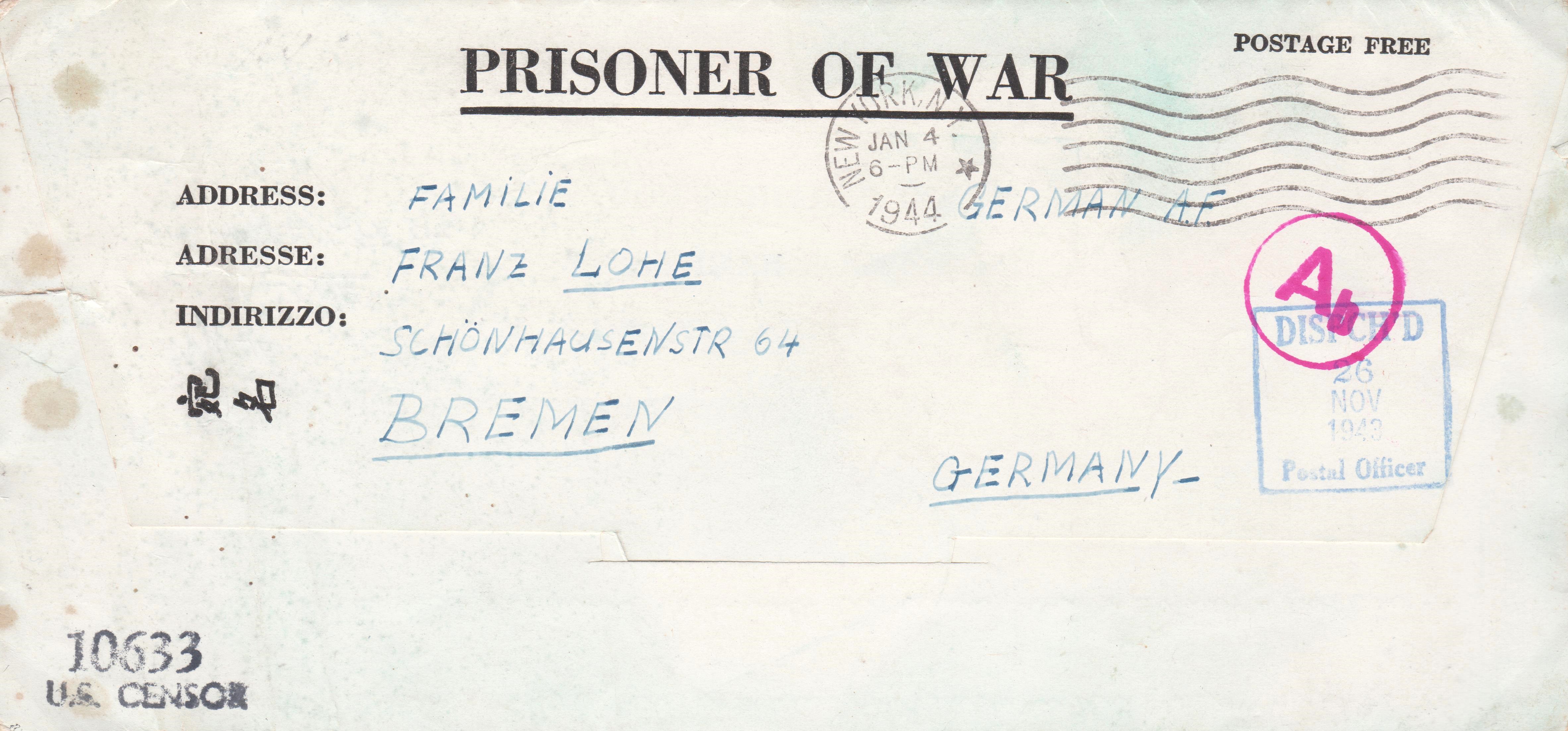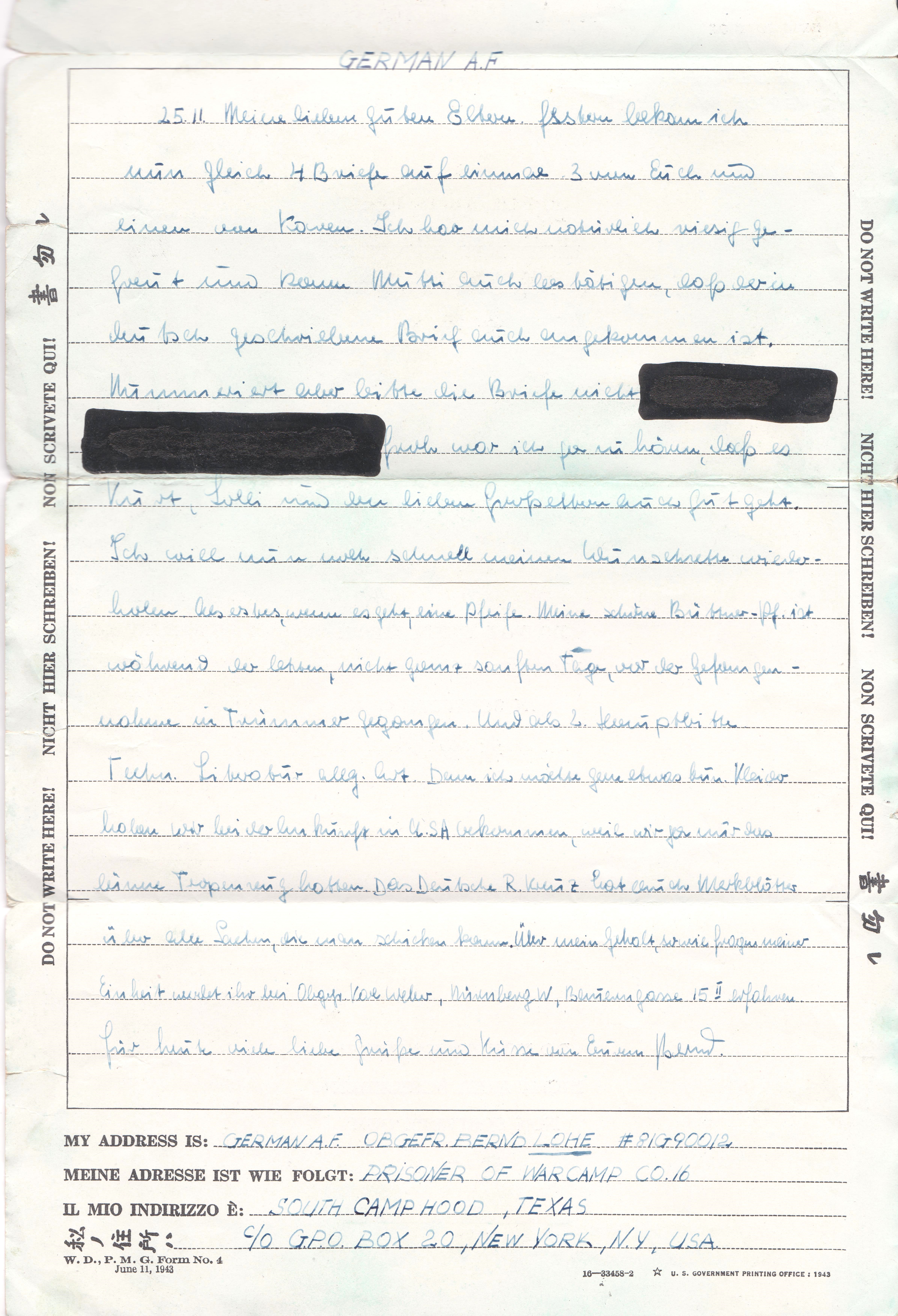 Der Brief durchlief die Zensur in den USA und erhielt nach erfolgter Prüfung einen Prüfstempel "10633 U. S. CENSOR", wo eine Textstelle mechanisch entfernt sowie geschwärzt wurde: