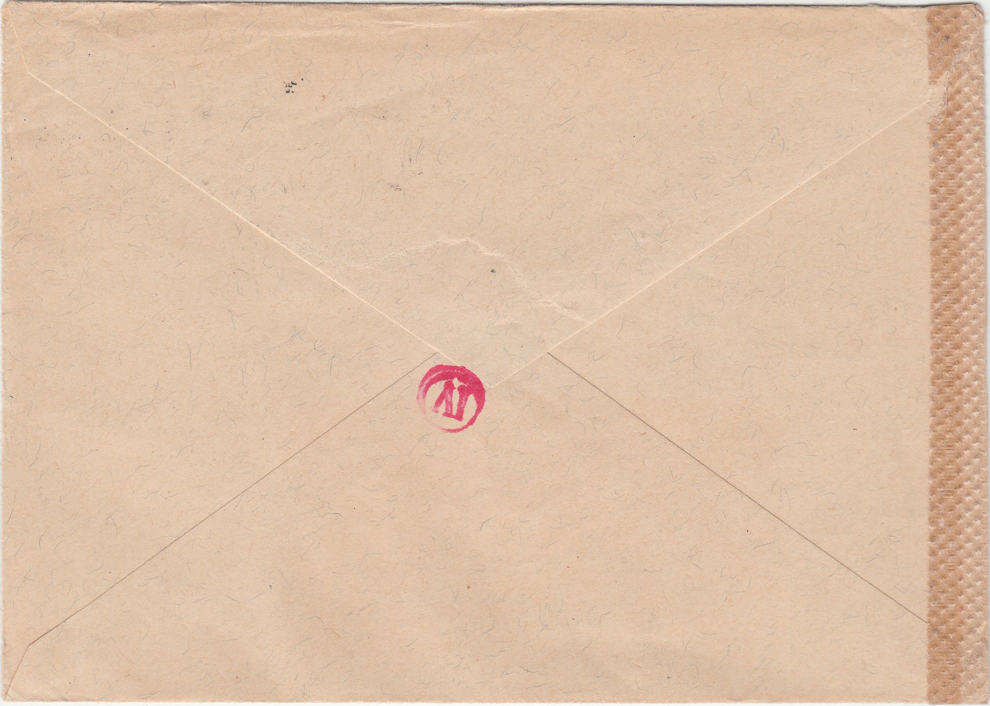 Der Brief wurde in der ABP München linksseitig geöffnet und nach erfolgter Prüfung mittels der Briefverschlussvorrichtung wieder verschlossen, was ein Stempel der Briefverschlussvorrichtung in Blau, V-förmige Blätter in Kreis, katalogisiert als Landsmann DPB1.2, dokumentiert.