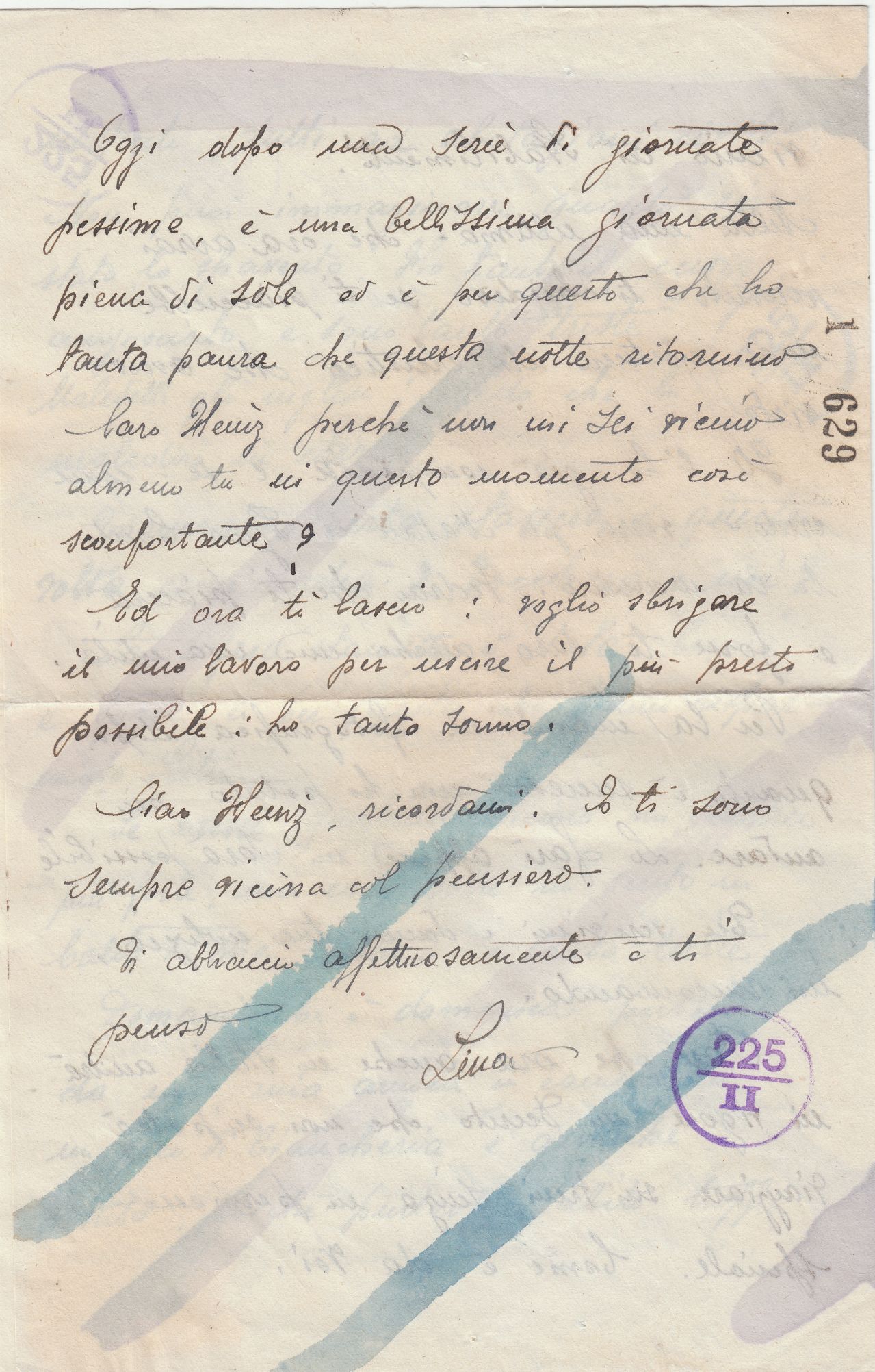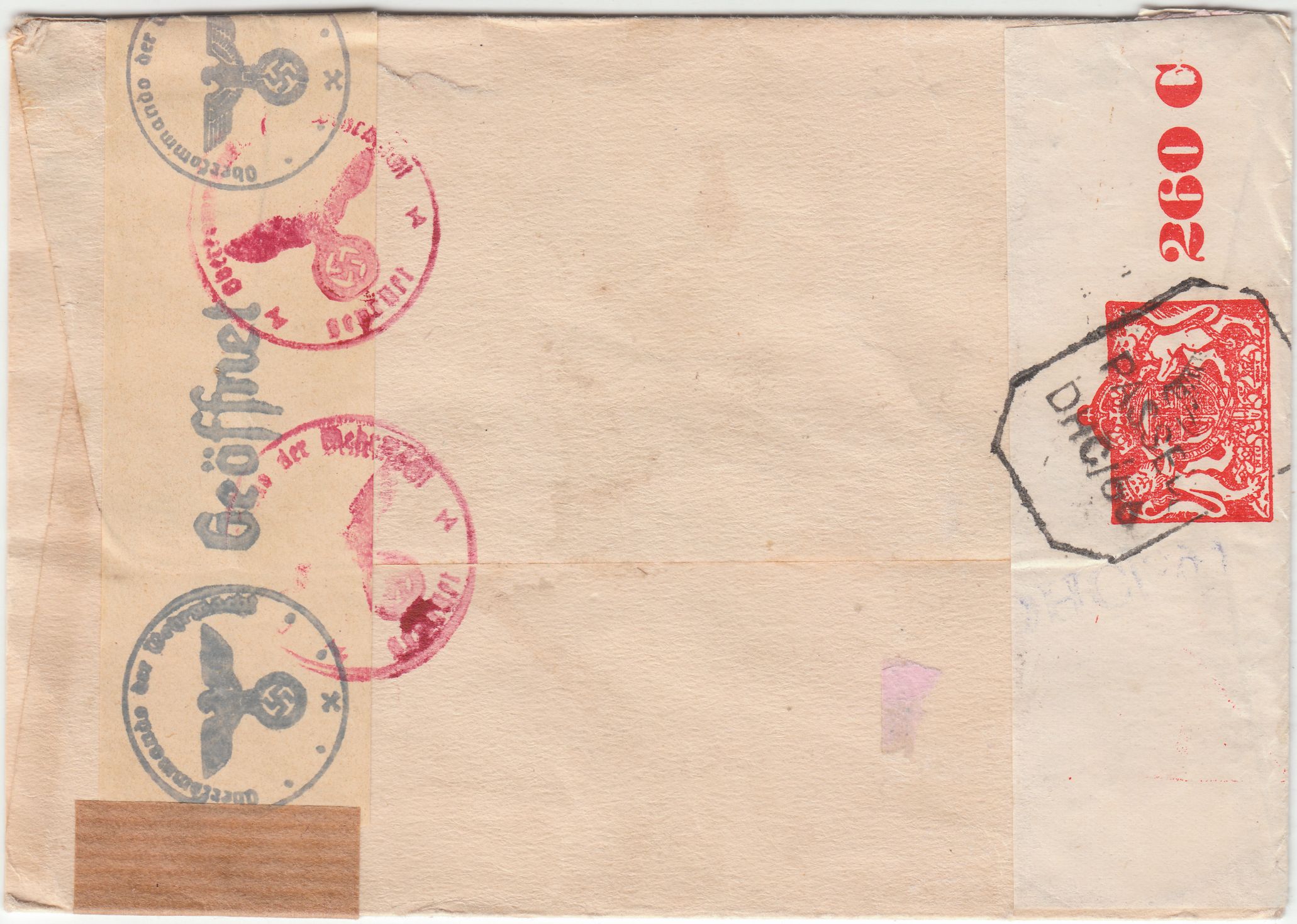 Anschließend lief der Brief durch die Auslandsbriefprüfstelle München, die für Post von und nach Italien zuständig war. Dort wurde der Beleg linksseitig geöffnet und nach erfolgter Zensurierung mit der Briefverschlußvorrichtung wieder verschlossen, was mit einem Stempel der Briefverschlußvorrichtung "OKW" in Blau dokumentiert wurde.