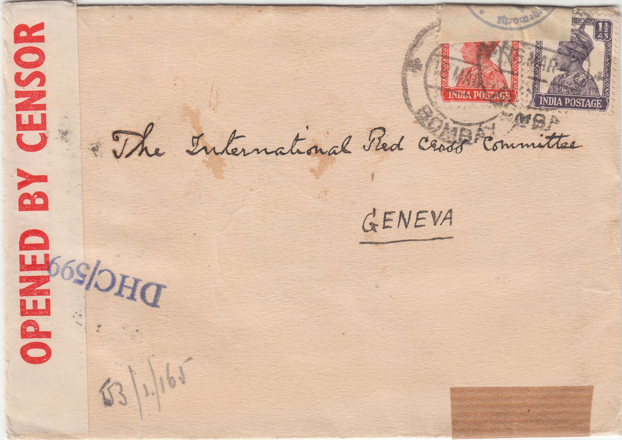 Dieser nach "GENEVA" = Genf in der neutralen Schweiz adressierte Brief wurde am 18.03.1944 in Bombay in Indien aufgegeben: