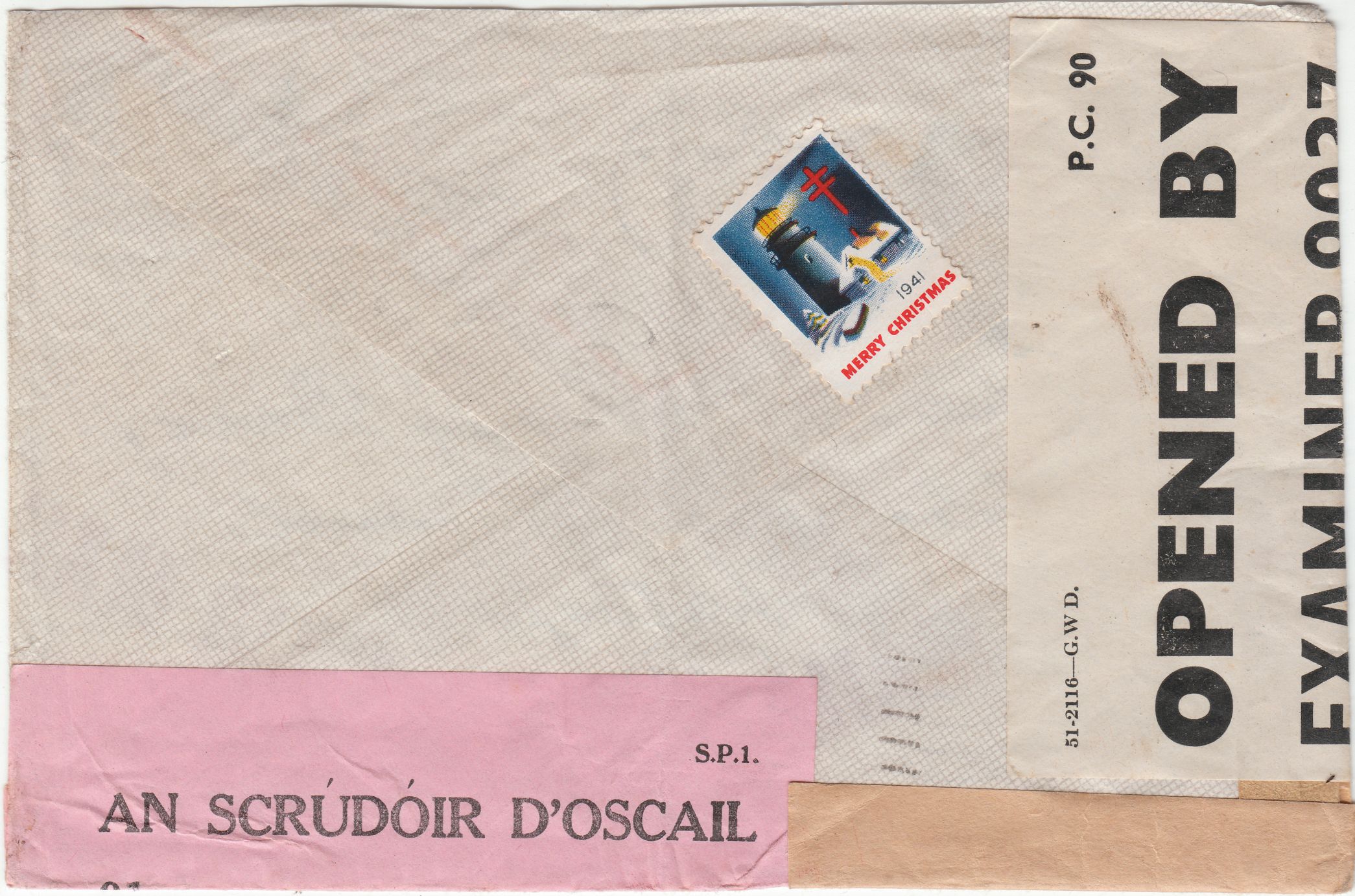 Das im Zweiten Weltkrieg treng neutral gebliebene Irland unterzog alle Auslandssendungen einer genauen Kontrolle. In der irischen Zensurstelle wurde dieser Brief unten geöffnet und nach erfolgter Pürfung mit einem rosa Verschlußzettel "S.P.1. AN SCRÚDÓIR D'OSCAIL 91 OPENED BY CENSOR" wieder verschlossen, wobei die "91" die Prüfernummer darstellt.