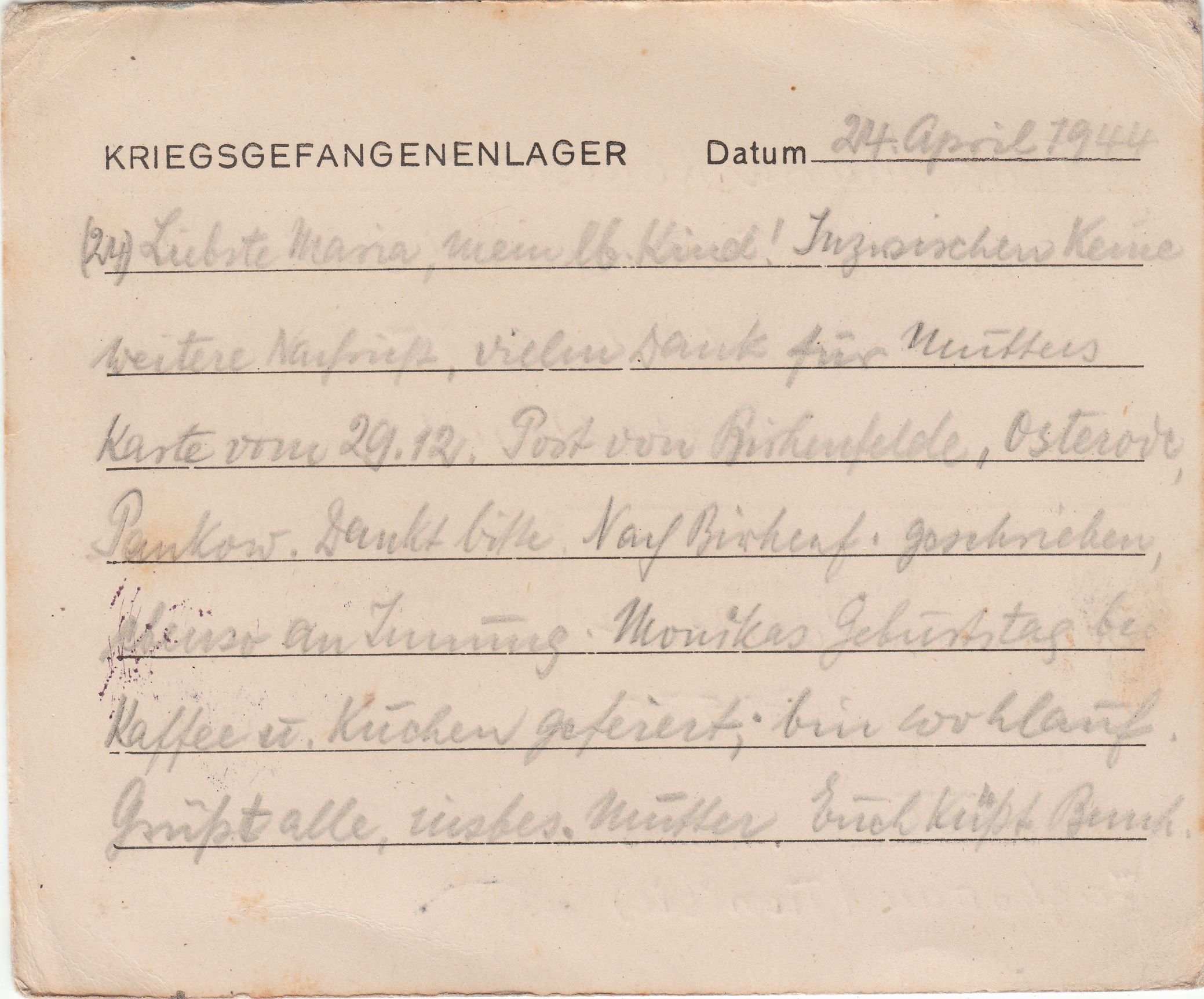 Dieser Vordruck einer Kriegsgefangenenpostkarte wurde am 24.04.1944 von einem deutschen Kriegsgefangenen im Lager "XVII" in "Zaghouan(Tunisie)" beschrieben und im Kriegsgefangenenlager geprüft, worauf ein violetter Einkreisstempel "DEPOT P. G. XVII CONTROLE No 17" hinweist.