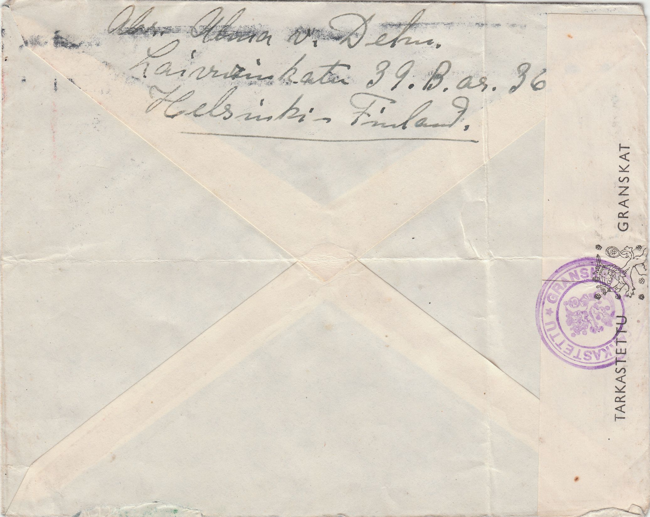 Der Beleg lief in Finnland durch die Zensurstelle, wo er linksseitig geöffnet und nach erfolgter Prüfung mit einem 38 mm breiten Verschlußstreifen "TARKASTETTU GRANSKAT" sowie der Abbildung eines Löwen wieder verschlossen wurde, was vorderseitig sowie rückseitig per Prüferstempel "TARKASTETTU GRANSKAT 49" dokumentiert wurde.