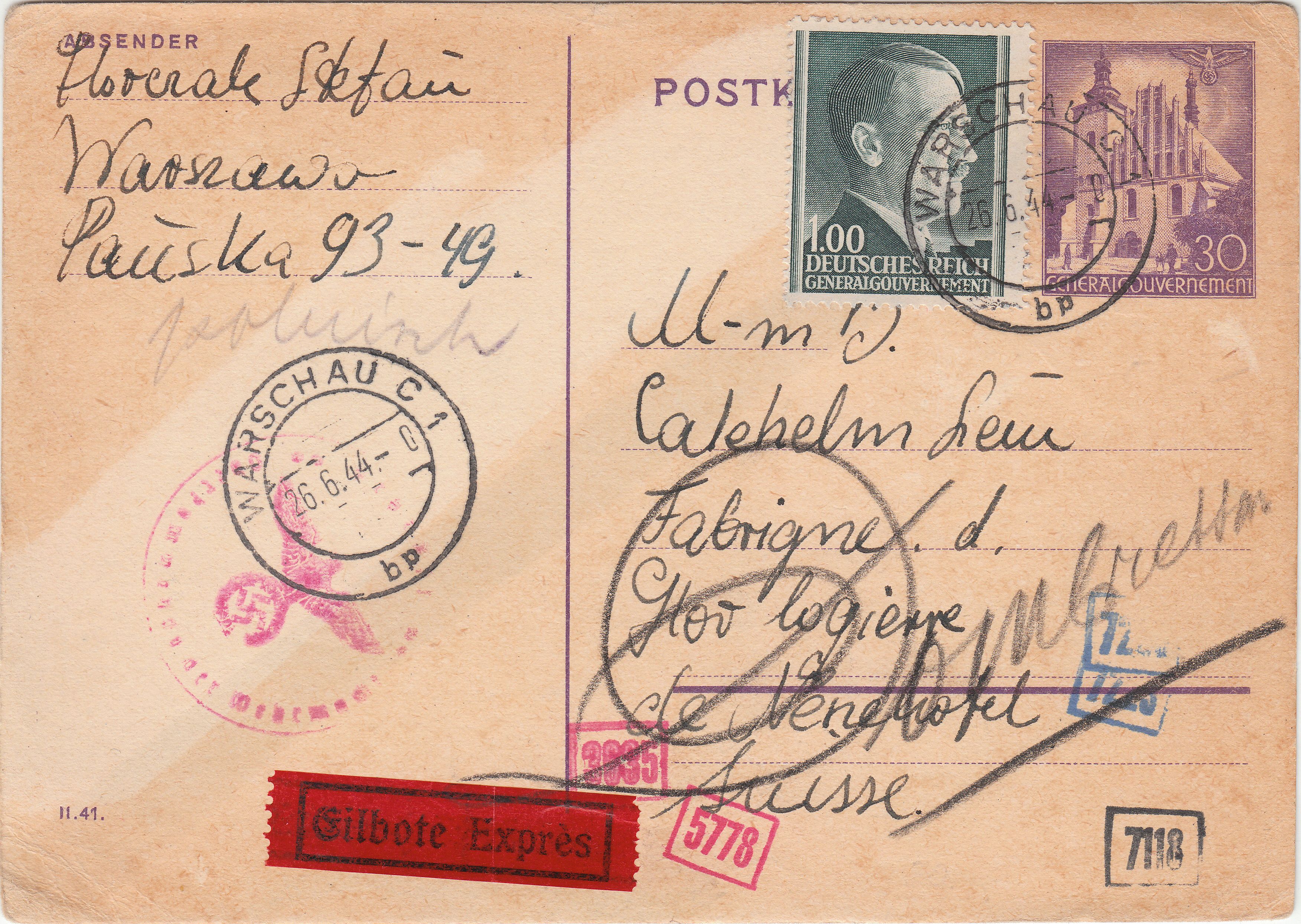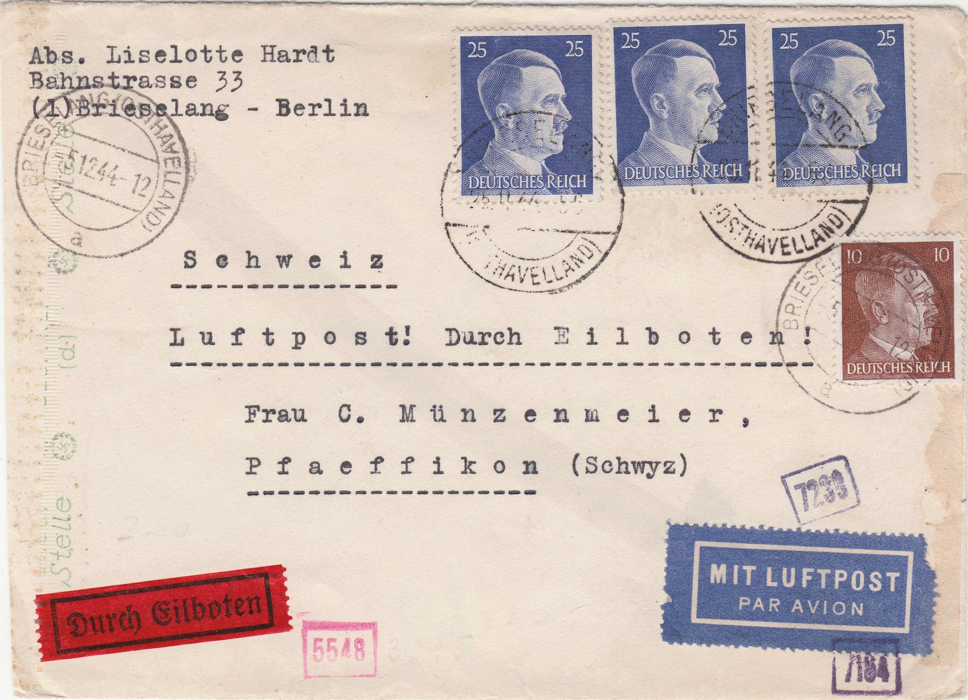 Dieses tat der Absender, indem er ein Postwertzeichen der Dauerserie Adolf Hitler der Wertstufe zu 10 Pfennig verklebte und den Brief dann am 05.12.1944 in BRIESELANG am Postschalter aufgab. Nachdem er sich ausgewiesen hatte entwertete der Postbeamte die Zusatzfrankatur per Tagesstempel und setzte zur Dokumentation der erfolgten Überprüfung der Personalien des Absenders einen Blankoabschlag des Tagesstempels links neben die Frankatur.