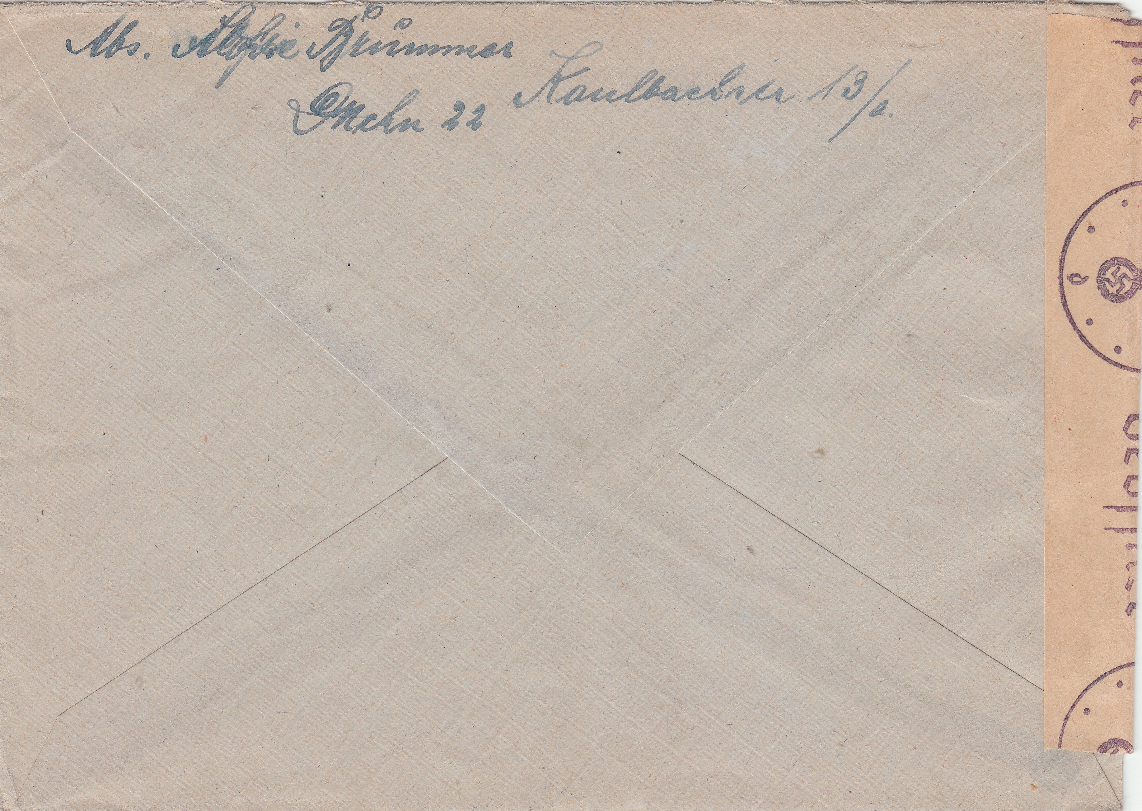 Nach erfolgter Prüfung wurde der Brief mit der Briefverschlußvorrichtung mit einem neutralen Streifen, senkrecht geriffelt, wieder verschlossen, was ein Stempel der Briefverschlußvorrichtung in Grün, Landsmann DPB3.1, dokumentierte. Der neutrale Streifen ist leider nicht mehr vorhanden.