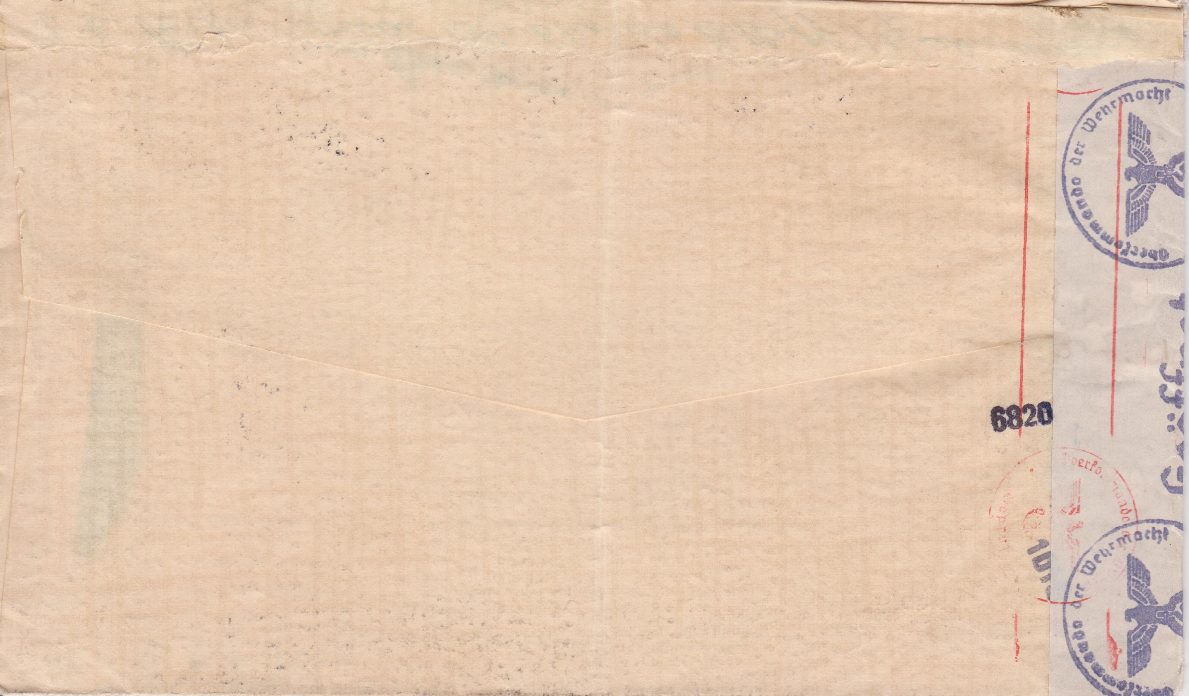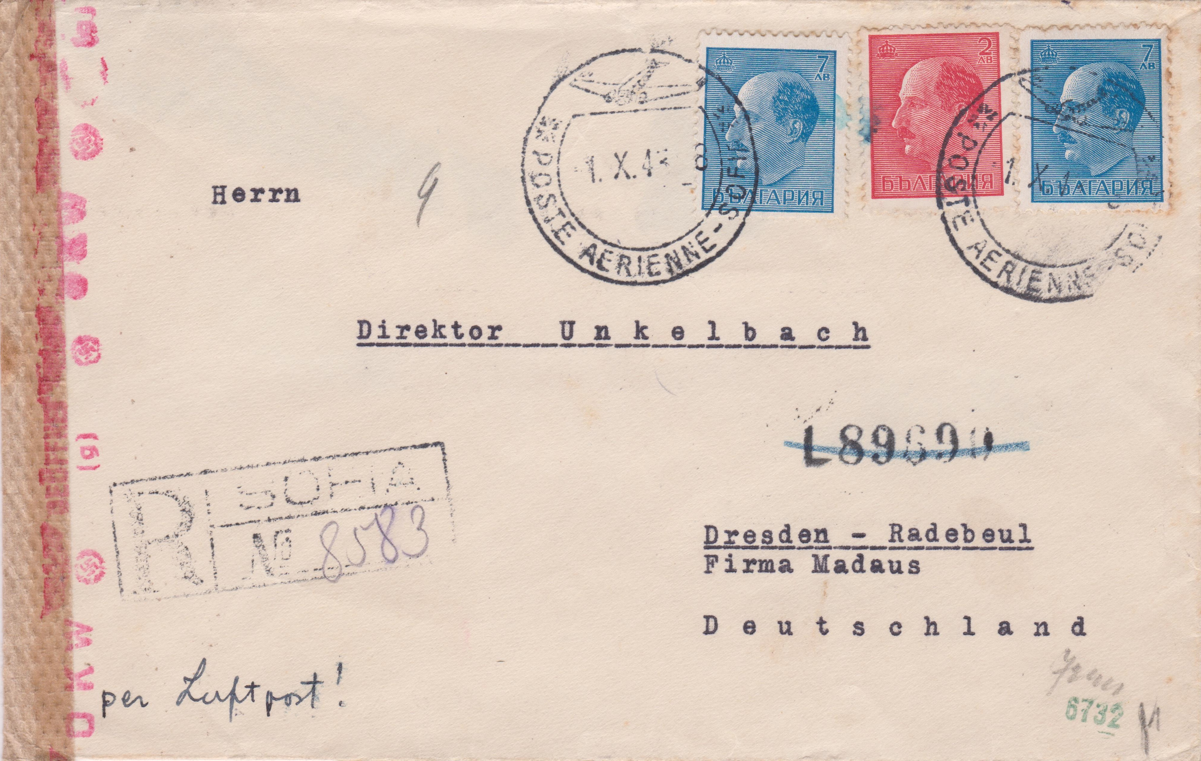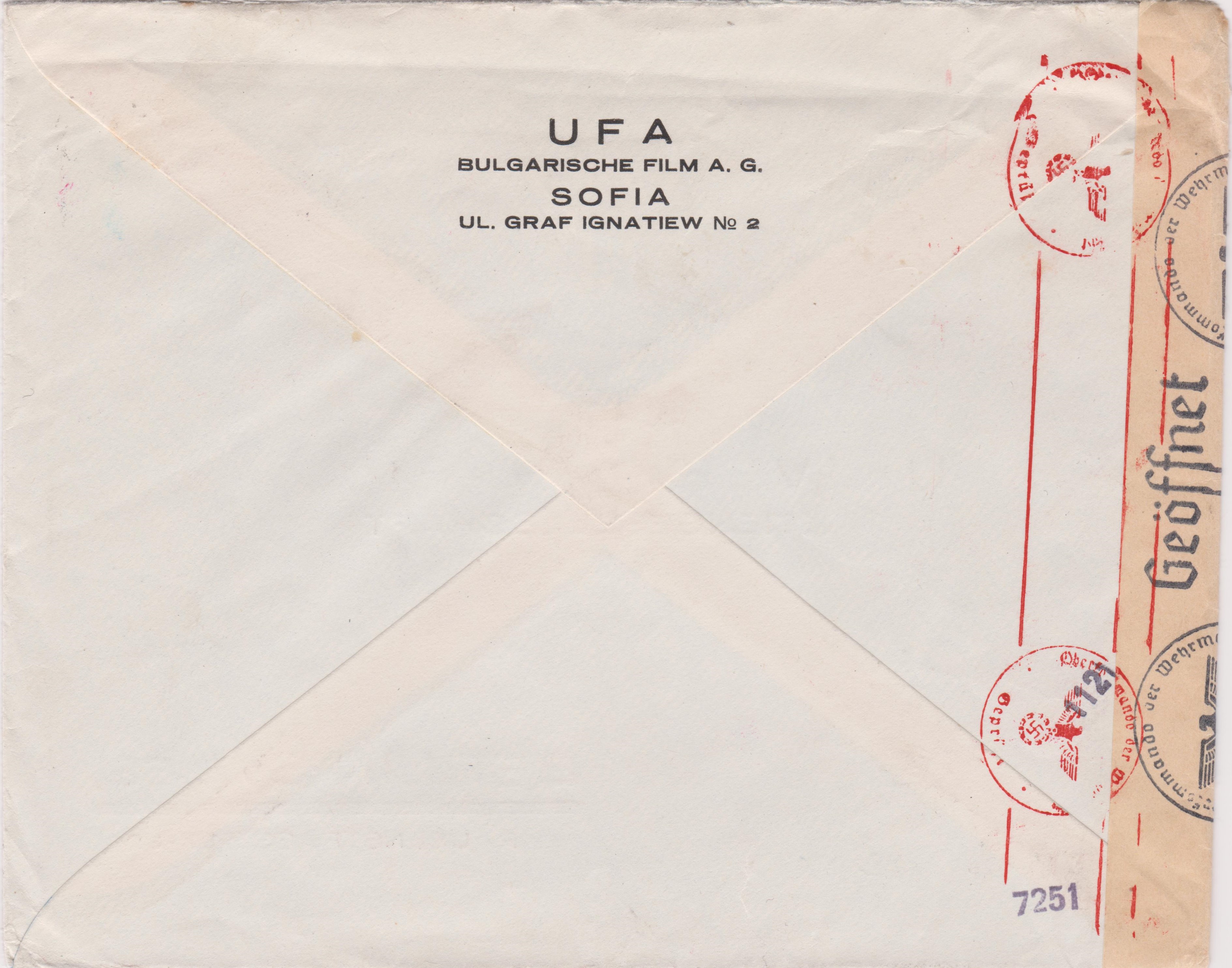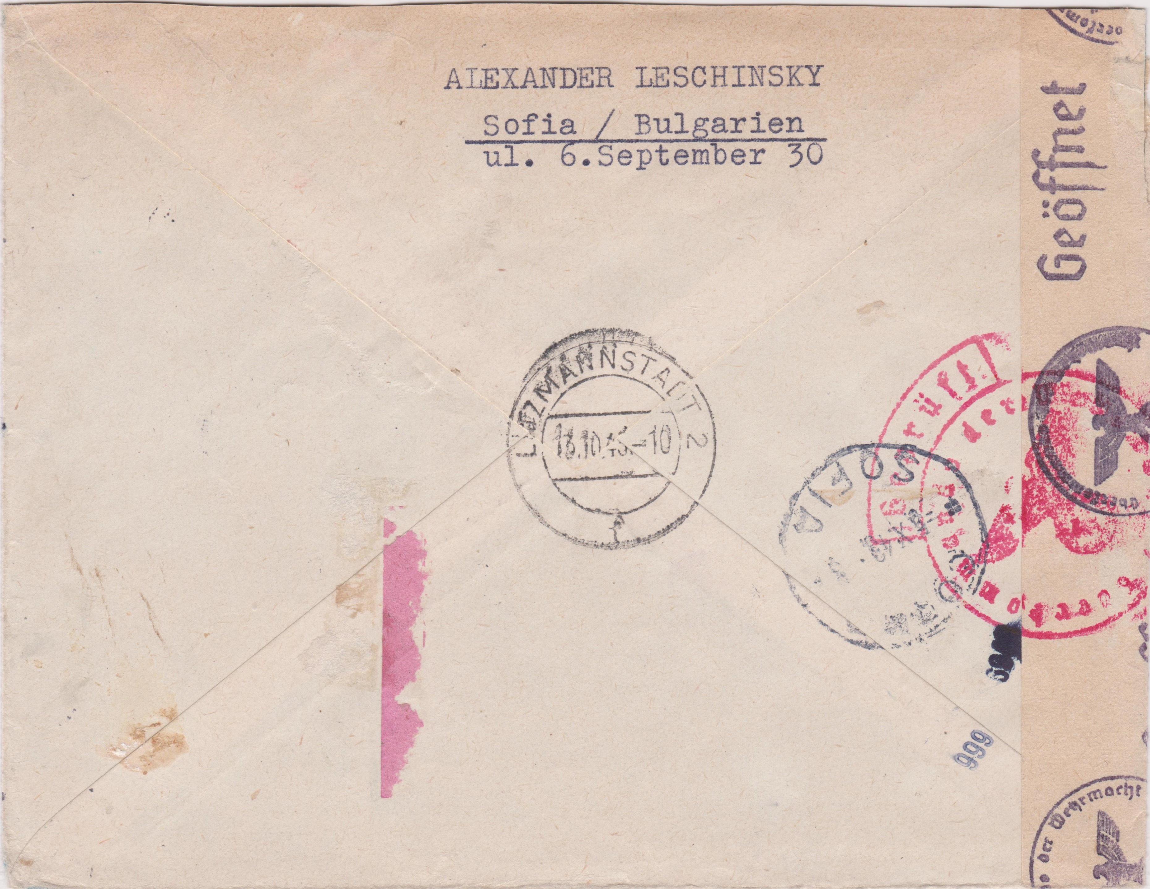 Dieser nach Dresden-Radebeul adressierte, am 01.10.1943 in Sofia in Bulgarien per Einschreiben und Luftpost aufgegebene Brief wurde in der Auslandsbriefprüfstelle Wien linksseitig geöffnet und nach erfolgter Zensurierung mit einem neutralen Streifen der Briefverschlußvorrichtung, 30° diagonal geriffelt, Landsmann GV6.3, wieder verschlossen, was mit einem Stempel der Briefverschlußvorrichtung dokumentiert wurde: