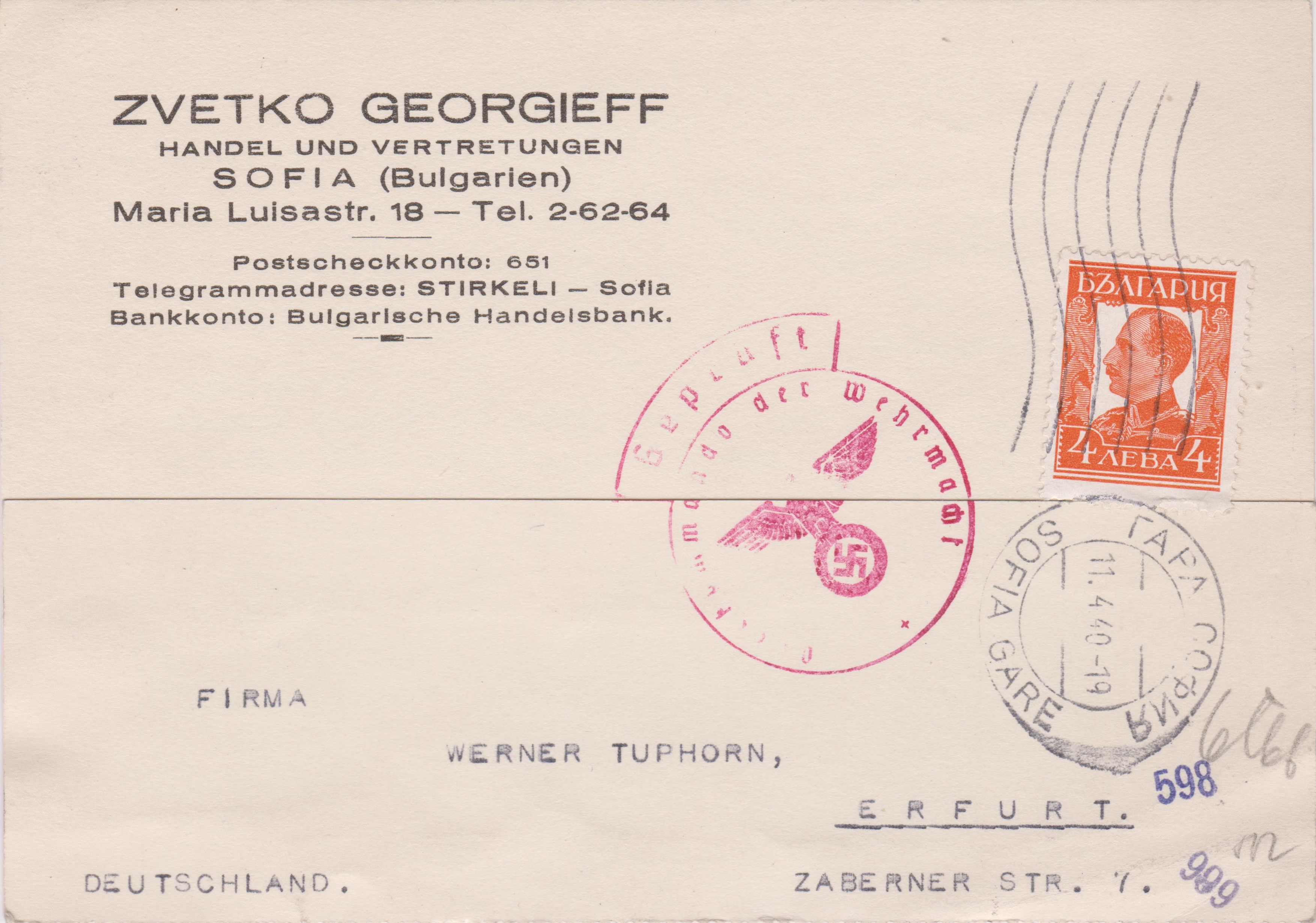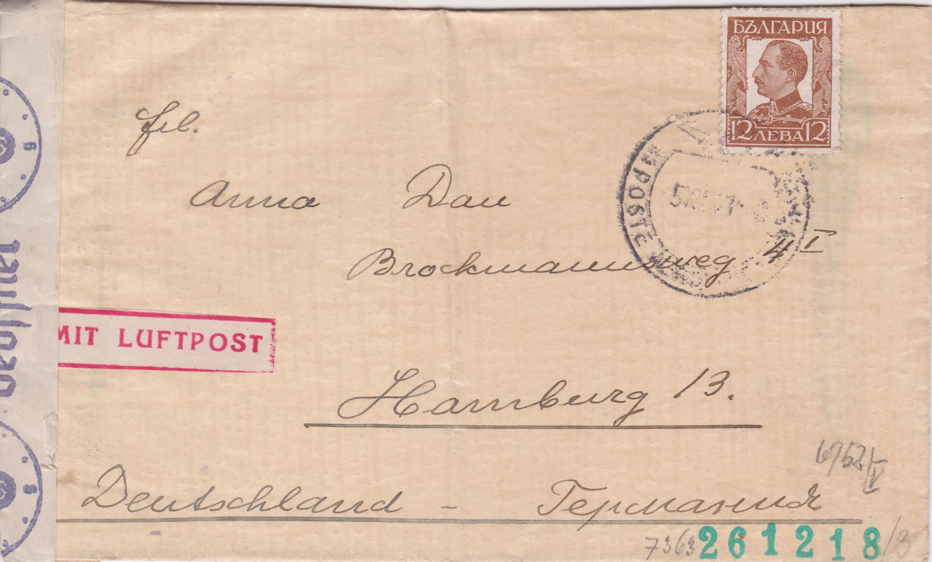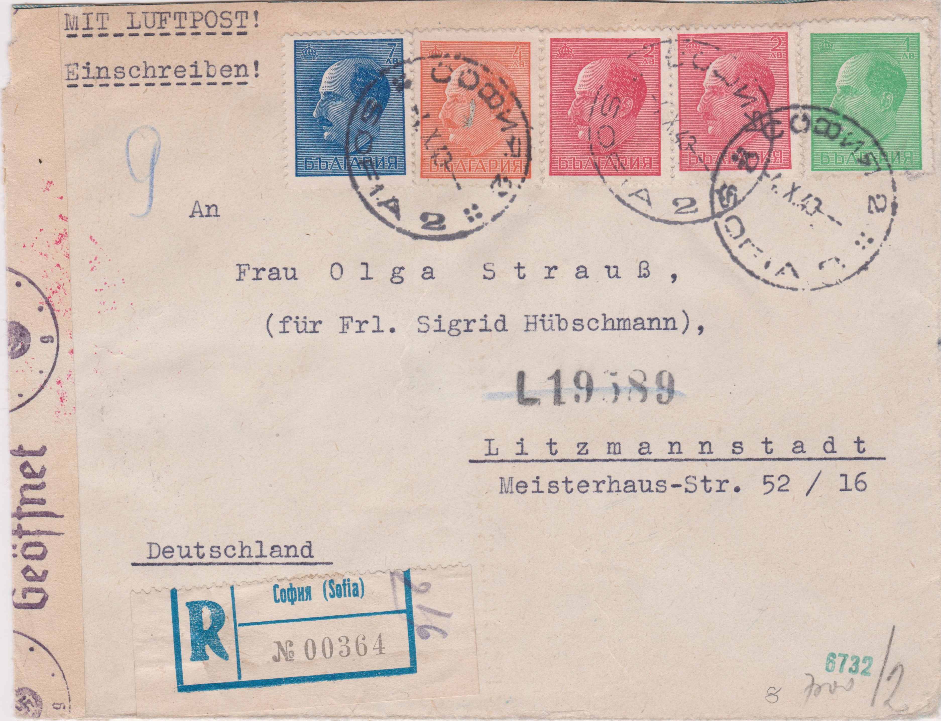 Dieser nach Dresden-Radebeul adressierte, am 01.10.1943 in Sofia in Bulgarien per Einschreiben und Luftpost aufgegebene Brief wurde in der Auslandsbriefprüfstelle Wien linksseitig geöffnet und nach erfolgter Zensurierung mit einem neutralen Streifen der Briefverschlußvorrichtung, 30° diagonal geriffelt, Landsmann GV6.3, wieder verschlossen, was mit einem Stempel der Briefverschlußvorrichtung dokumentiert wurde: