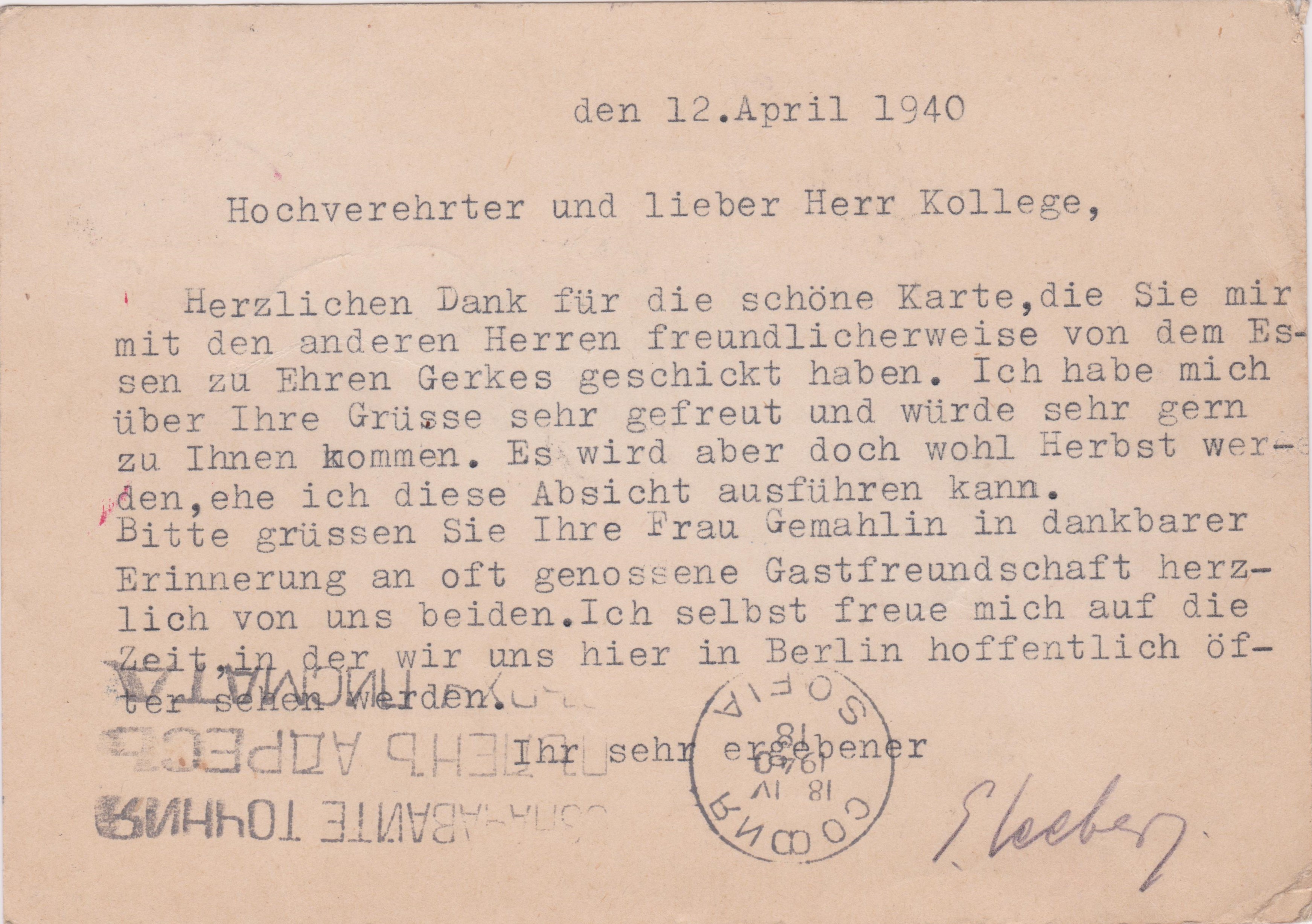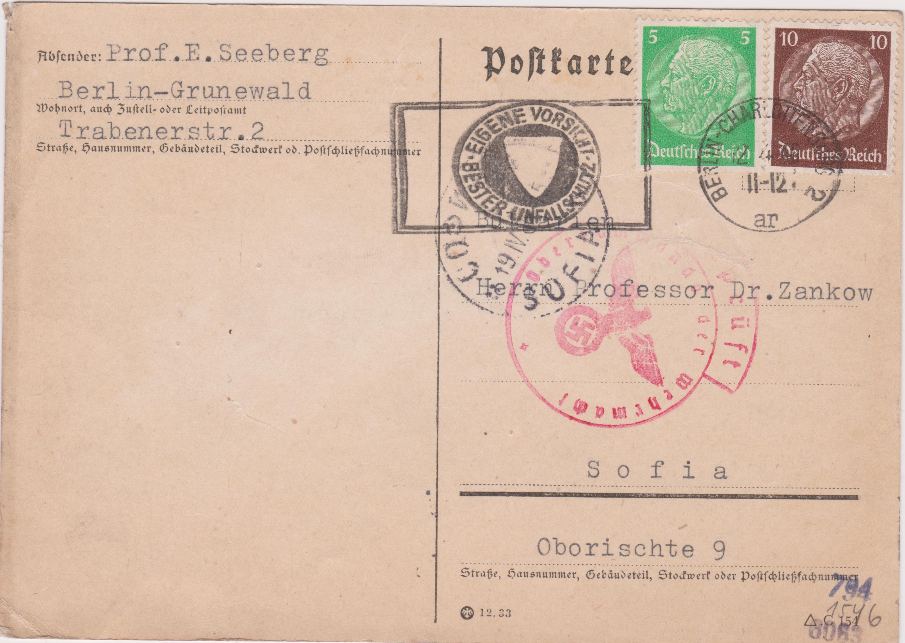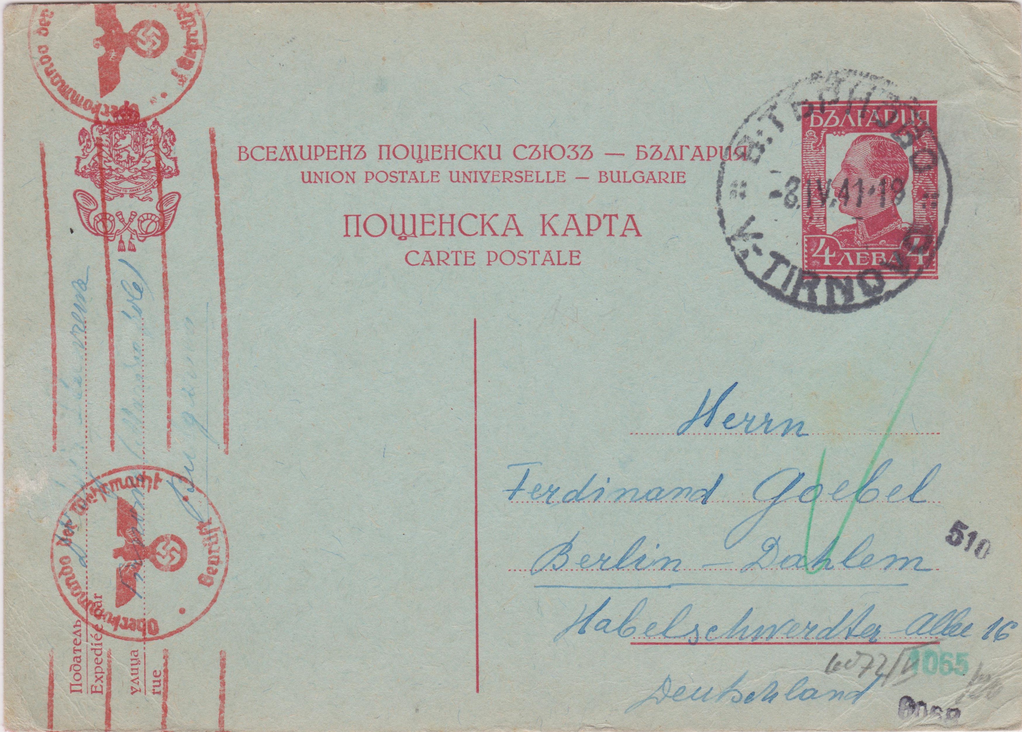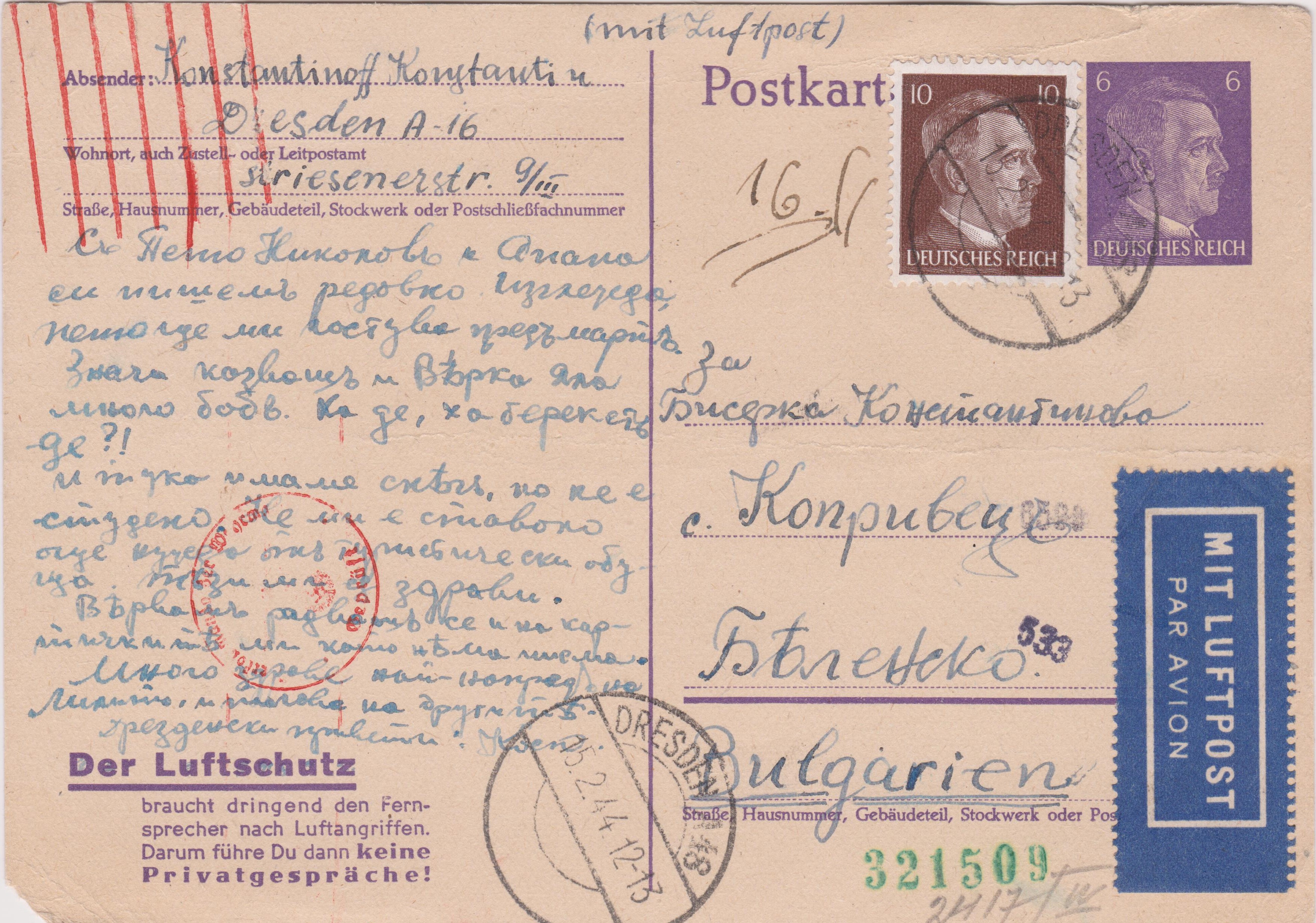 Dieser nach Dresden-Radebeul adressierte, am 01.10.1943 in Sofia in Bulgarien per Einschreiben und Luftpost aufgegebene Brief wurde in der Auslandsbriefprüfstelle Wien linksseitig geöffnet und nach erfolgter Zensurierung mit einem neutralen Streifen der Briefverschlußvorrichtung, 30° diagonal geriffelt, Landsmann GV6.3, wieder verschlossen, was mit einem Stempel der Briefverschlußvorrichtung dokumentiert wurde:
