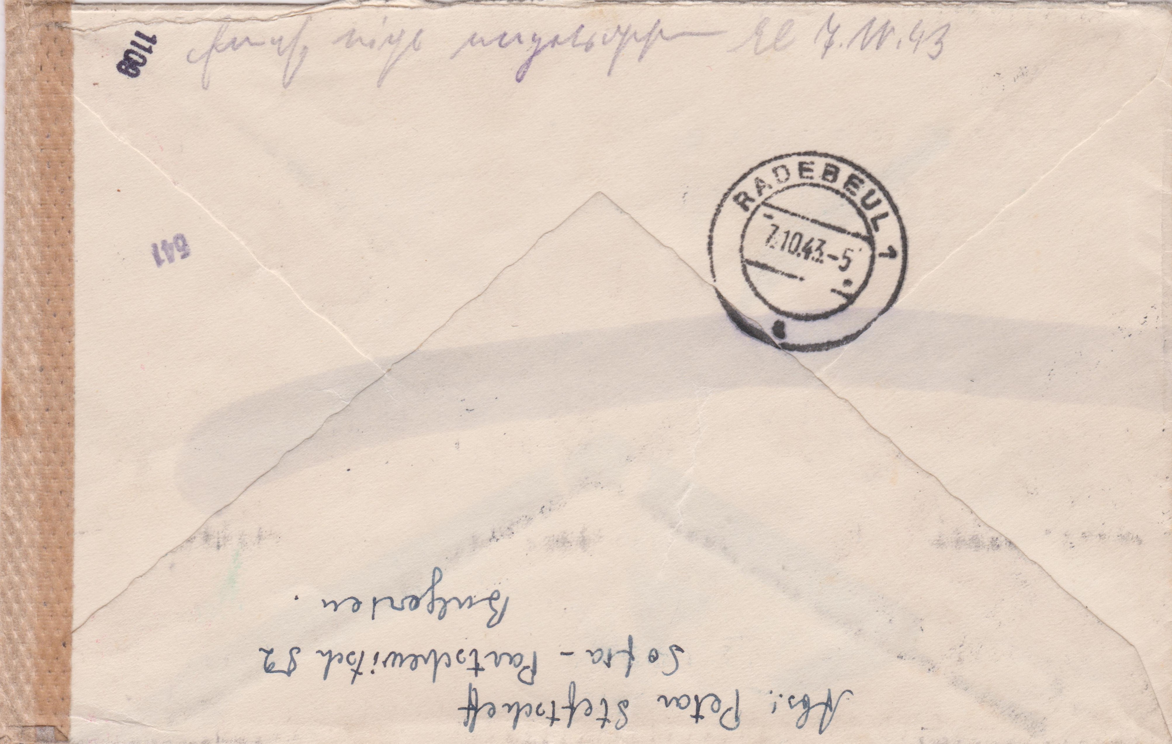 Rückseitig wurde am 07.10.1943 um 5 Uhr früh im Postamt RADEBEUL 1 ein Zweikreisstegstempel als Ankuftsstempel abgeschlagen. Der Zusteller vermerkte handschriftlich "Empf nicht angetroffen"
