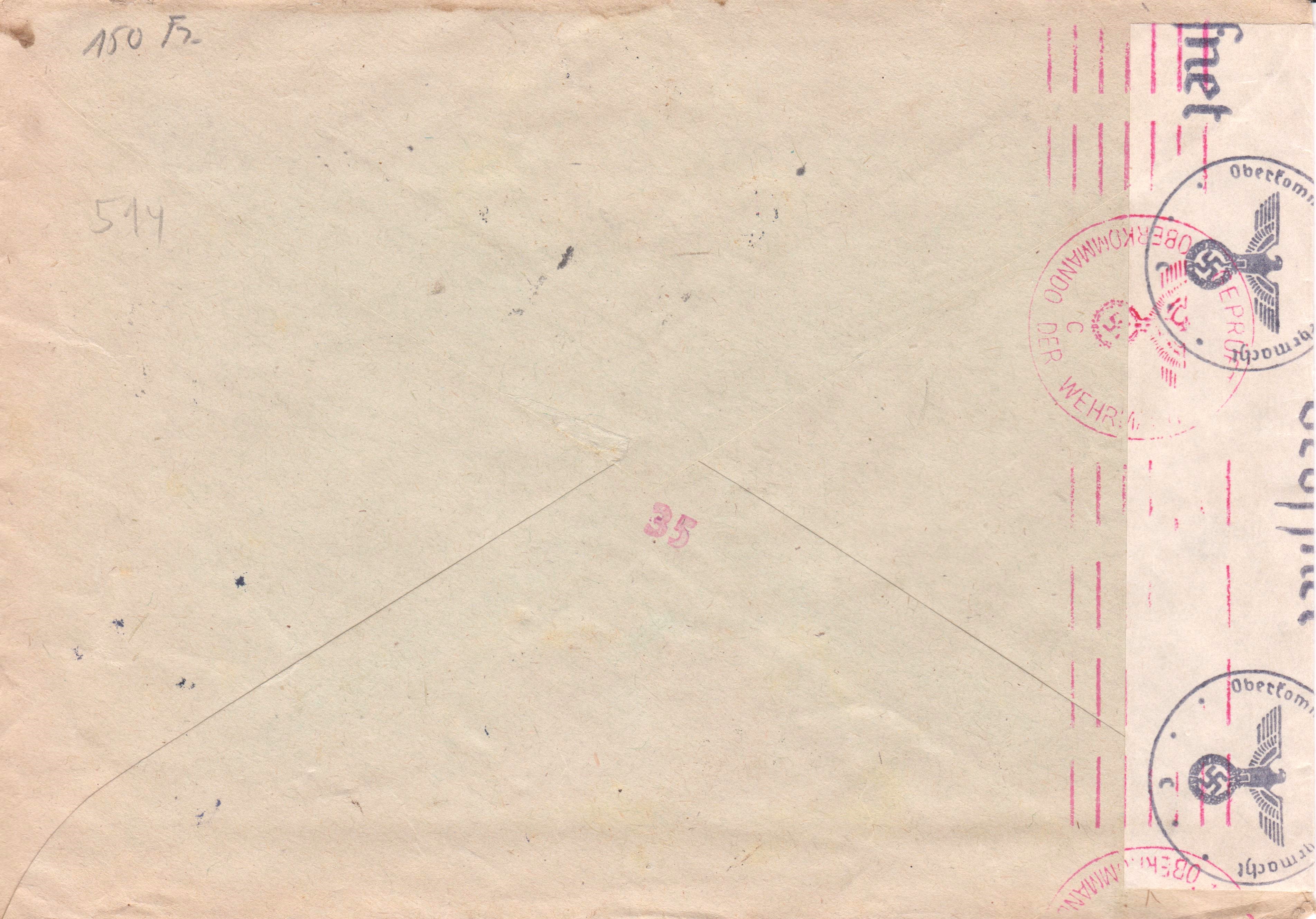 Dieser am 15.10.1944 in Belgien aufgegebene Brief wurde der ABP Köln zugeleitet, wo er linksseitig geöffnet und nach erfolgter Prüfung mit einem neutralen, hellbraunen Streifen der Briefverschlussvorrrichtung, 20 mm breit, senkrecht geriffelt, Landsmann CVB1.2, wieder verschlossen wurde: