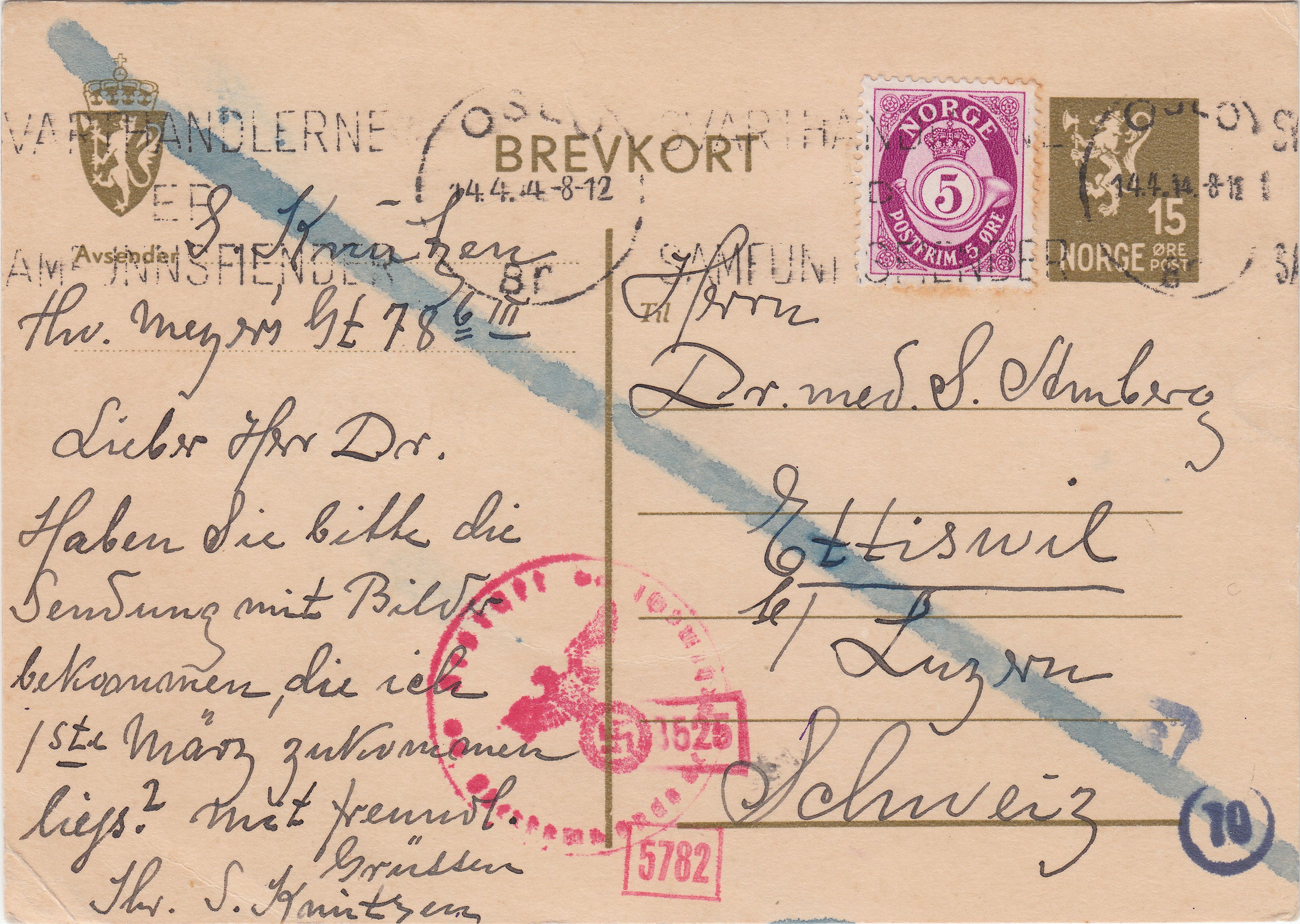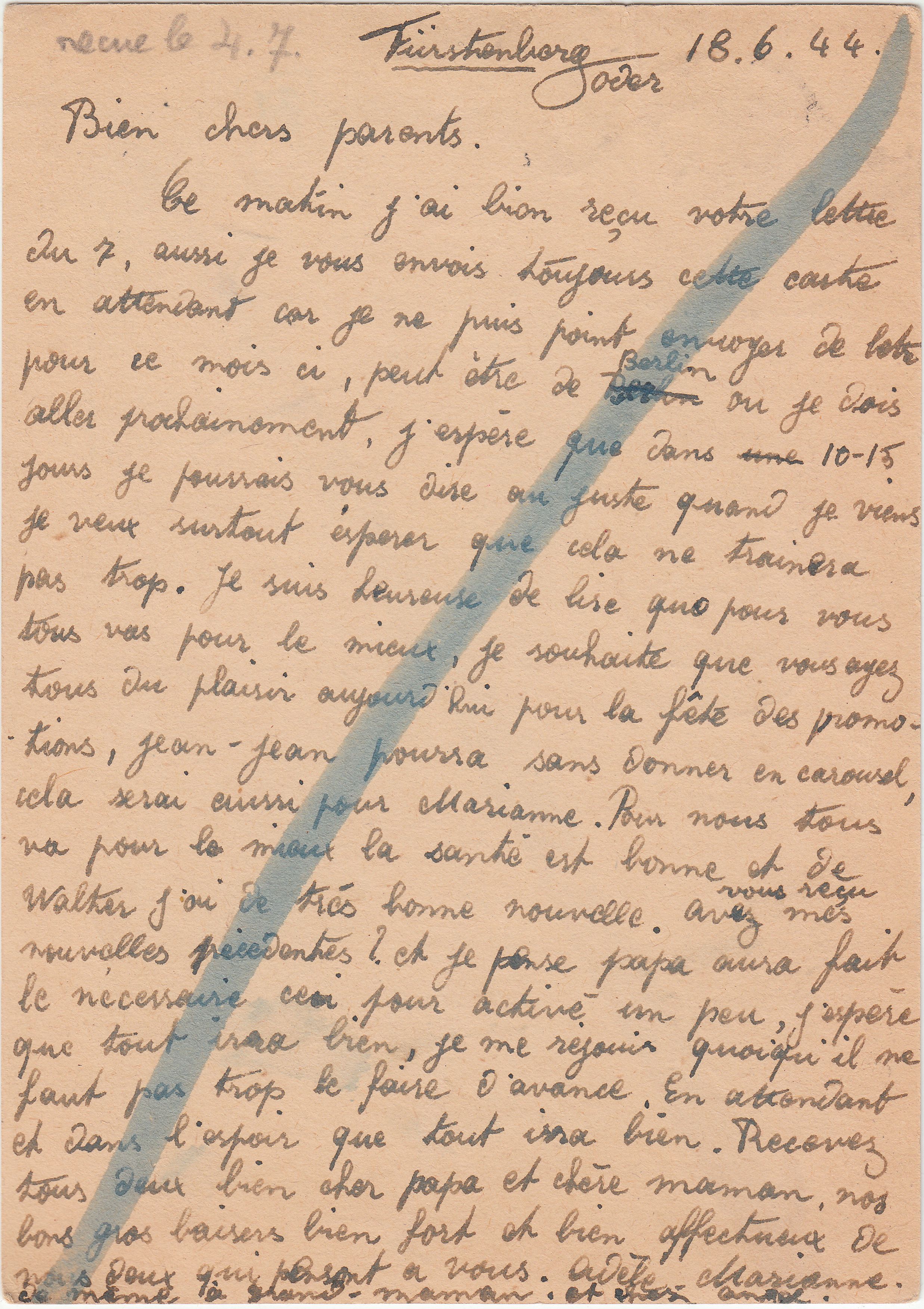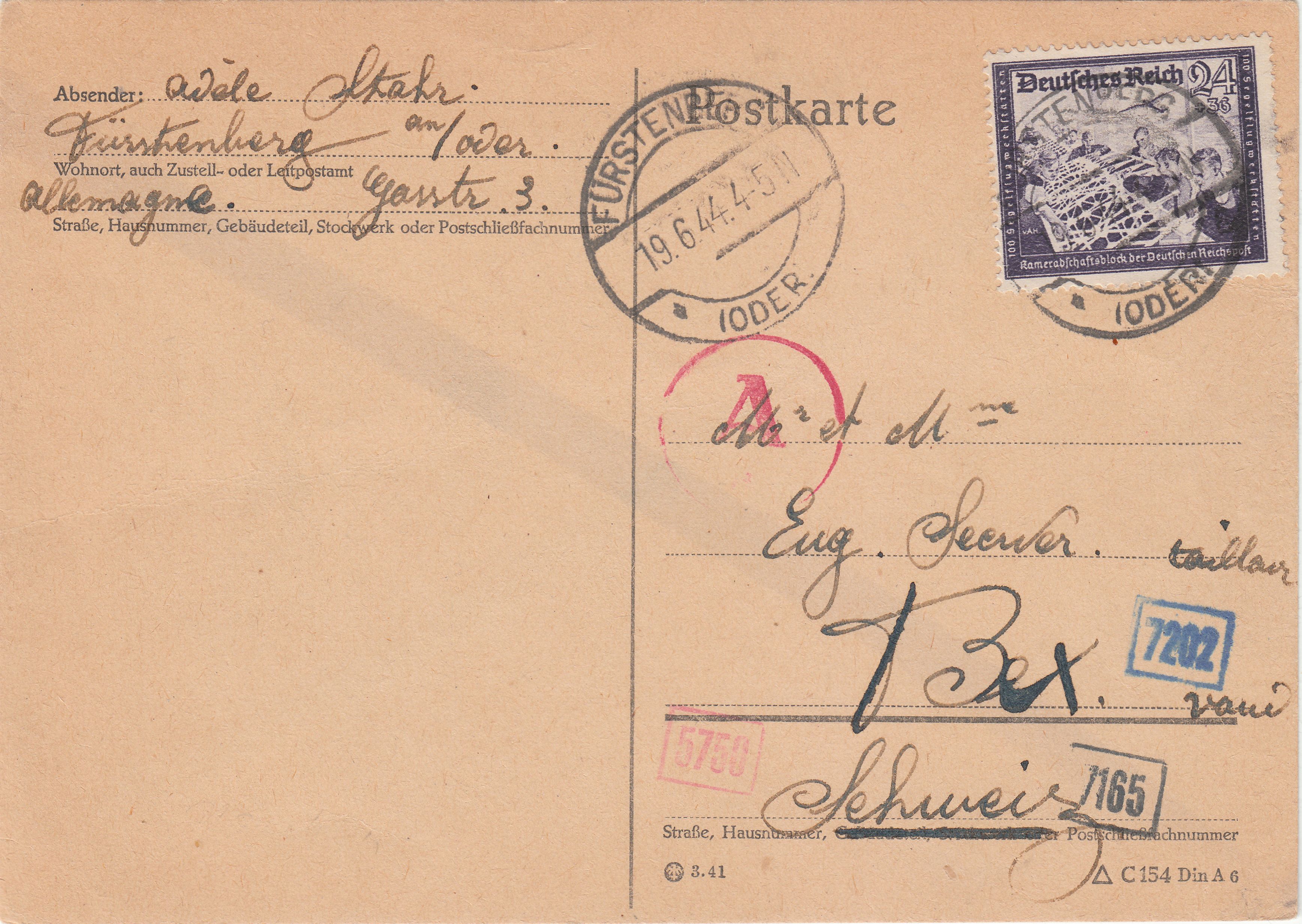 Diese nach Bex adressierte Postkarte wurde am 19.06.1944 in FÜRSTENBERG (ODER) am Postschalter aufgegeben, was der Blankoabschlag des Tagesstempels dokumentiert: