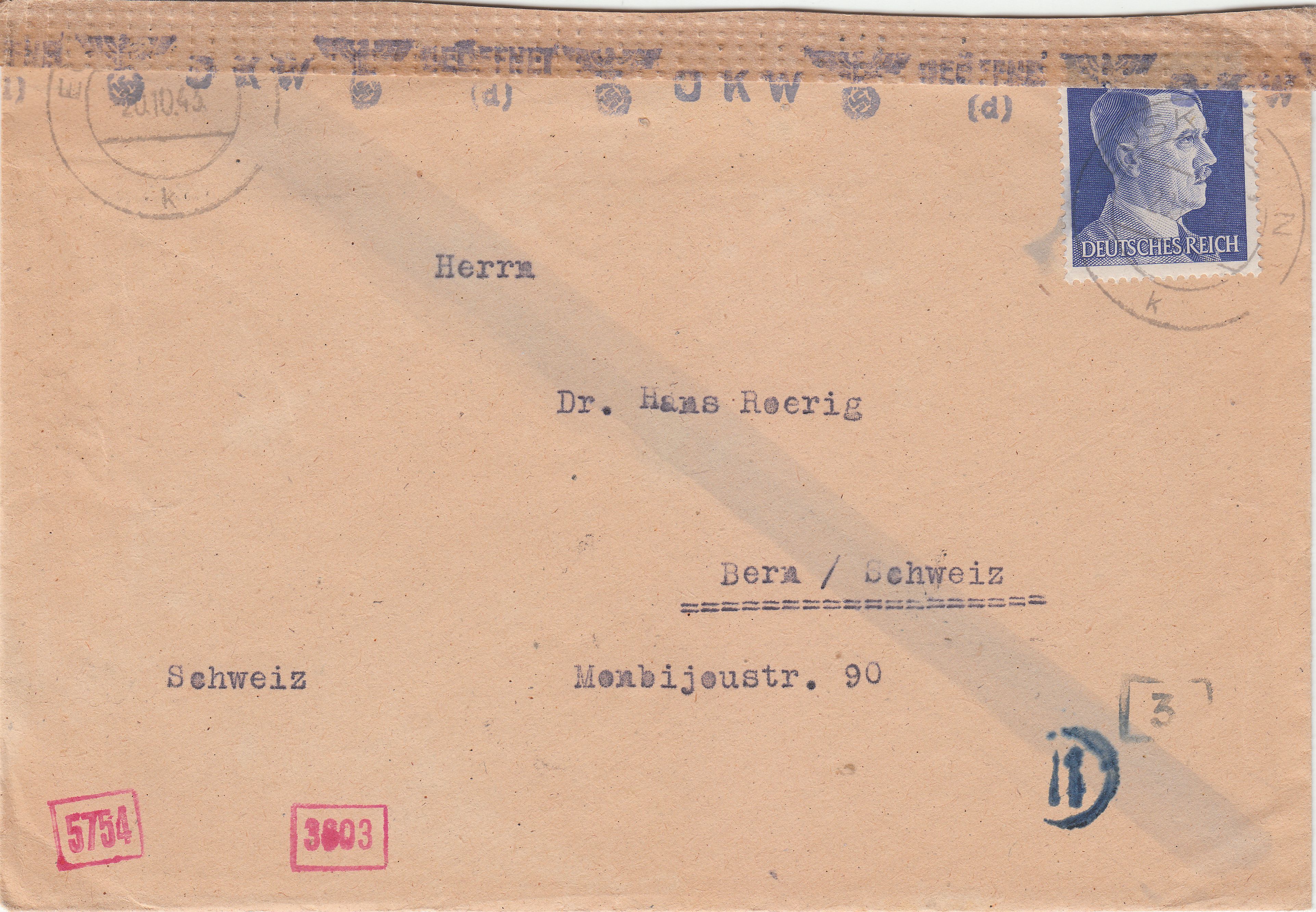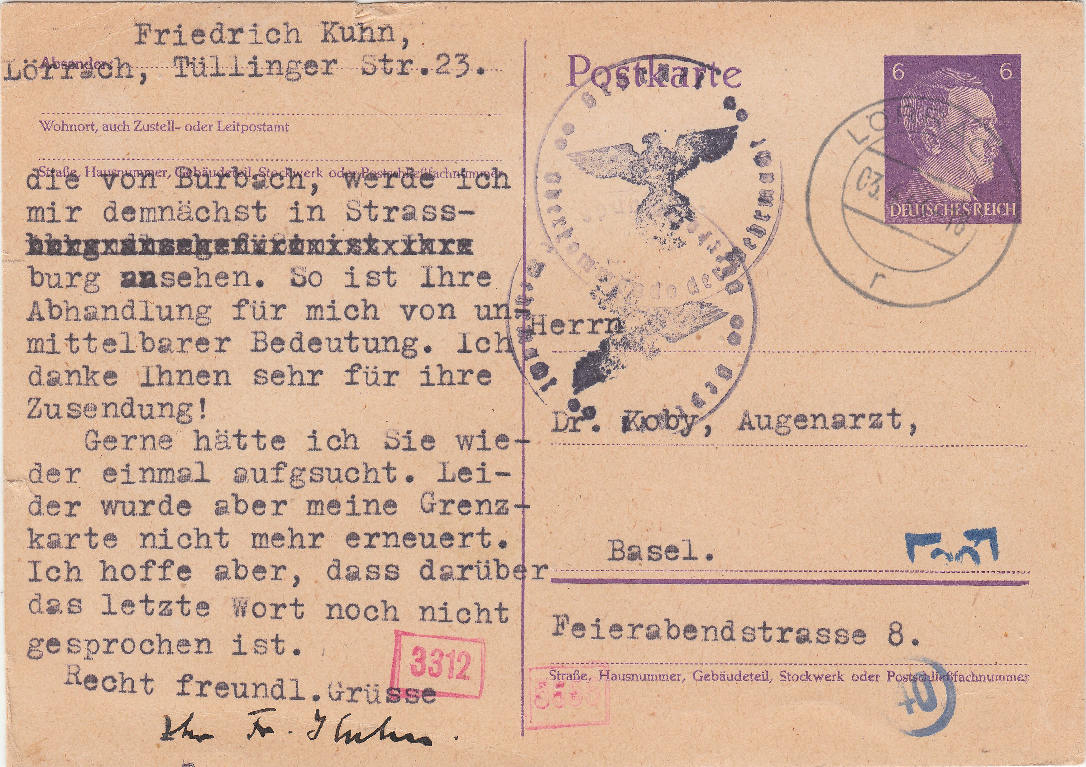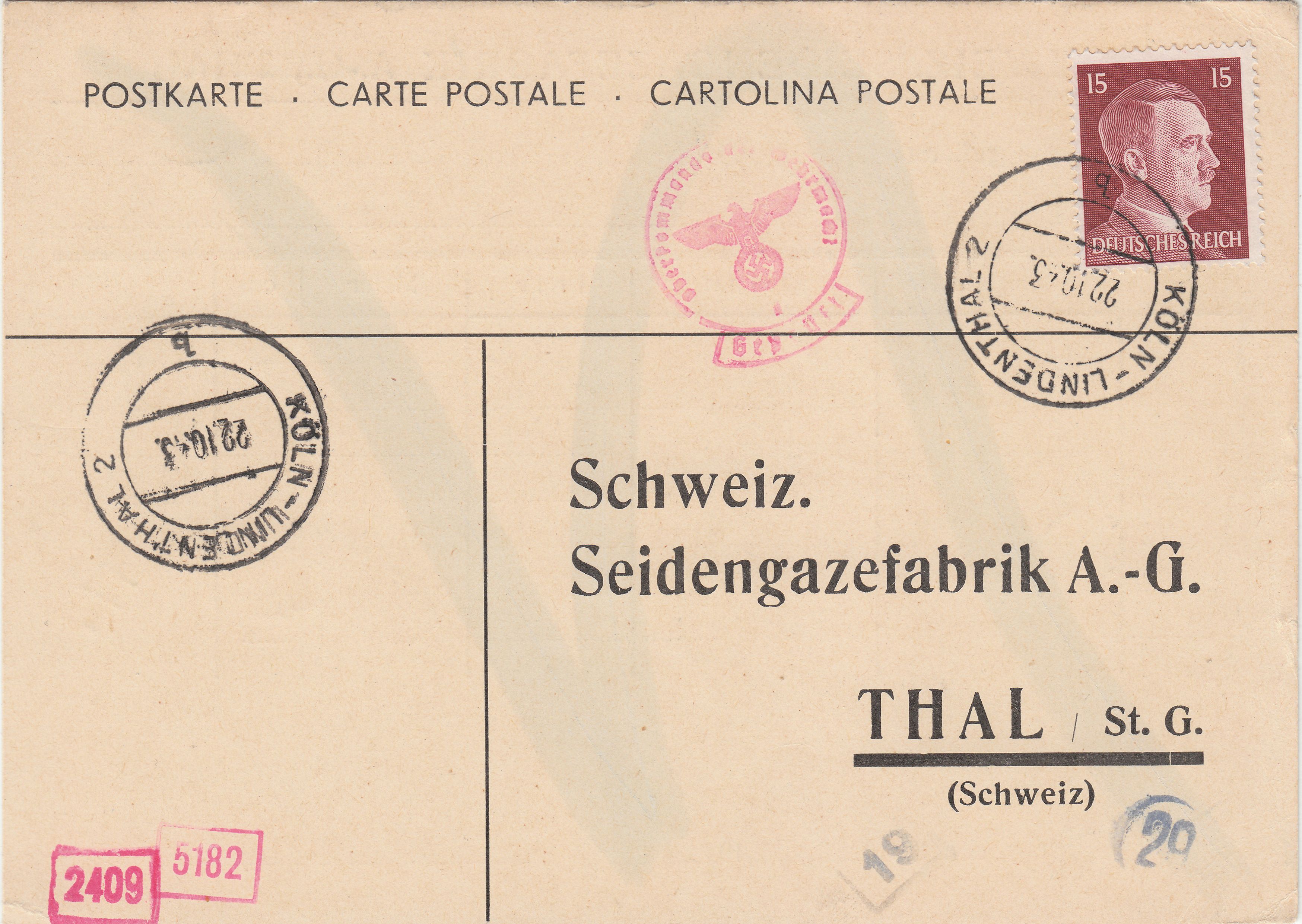 Interessant ist bei diesem Beleg der Kreisstempel "Ad" in Rot. Diese Handstempel wurden ab Aufnahme der Prüfungsarbeit in der ABP München im Oktober 1940 as "Handdurchlaufstempel" benutzt, d.h. sie dokumentierten, dass die jeweilige Postsendung der ABP München vorgelegt worden war und man dort entschieden hatte, auf eine Prüfung zu verzichten.