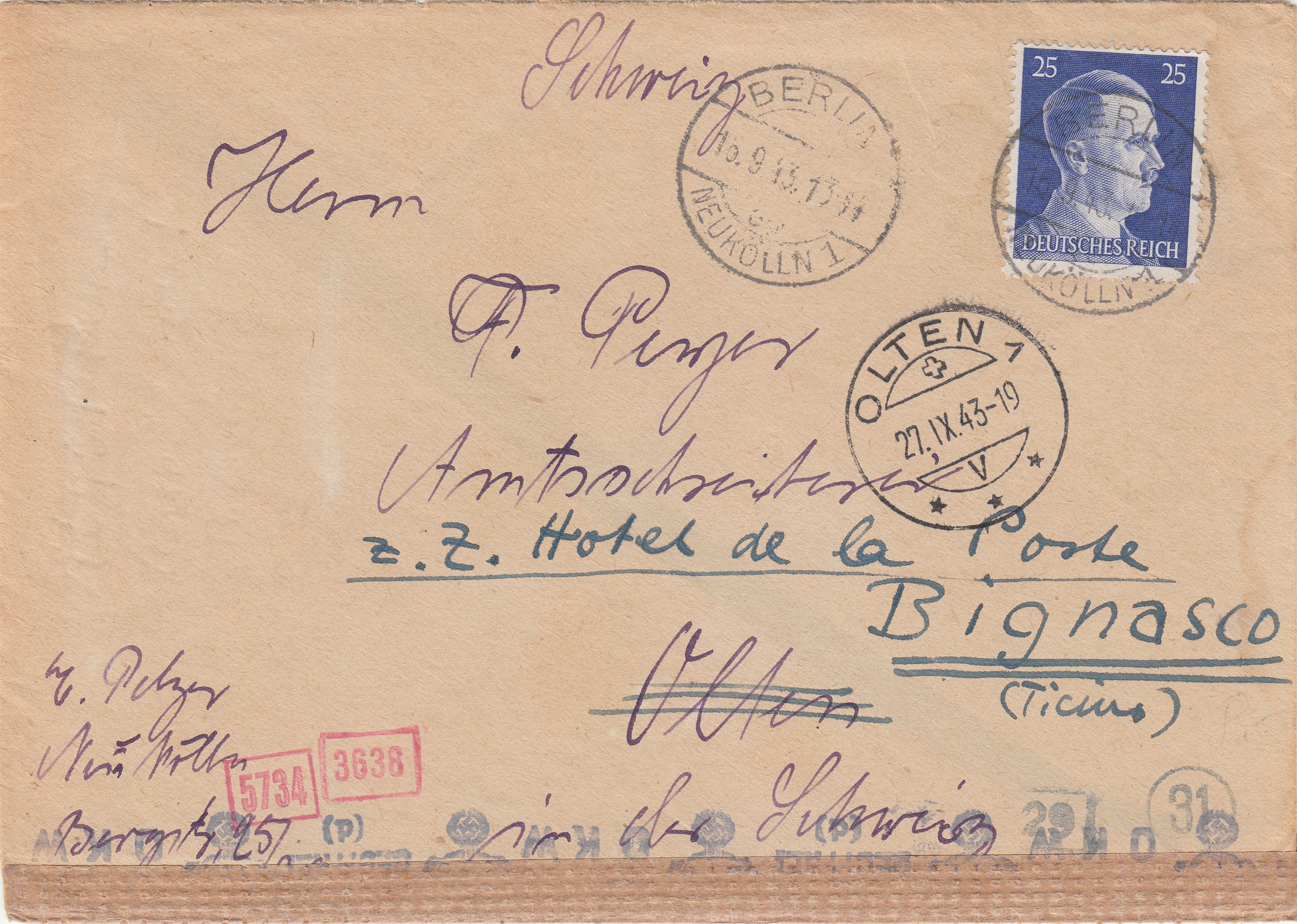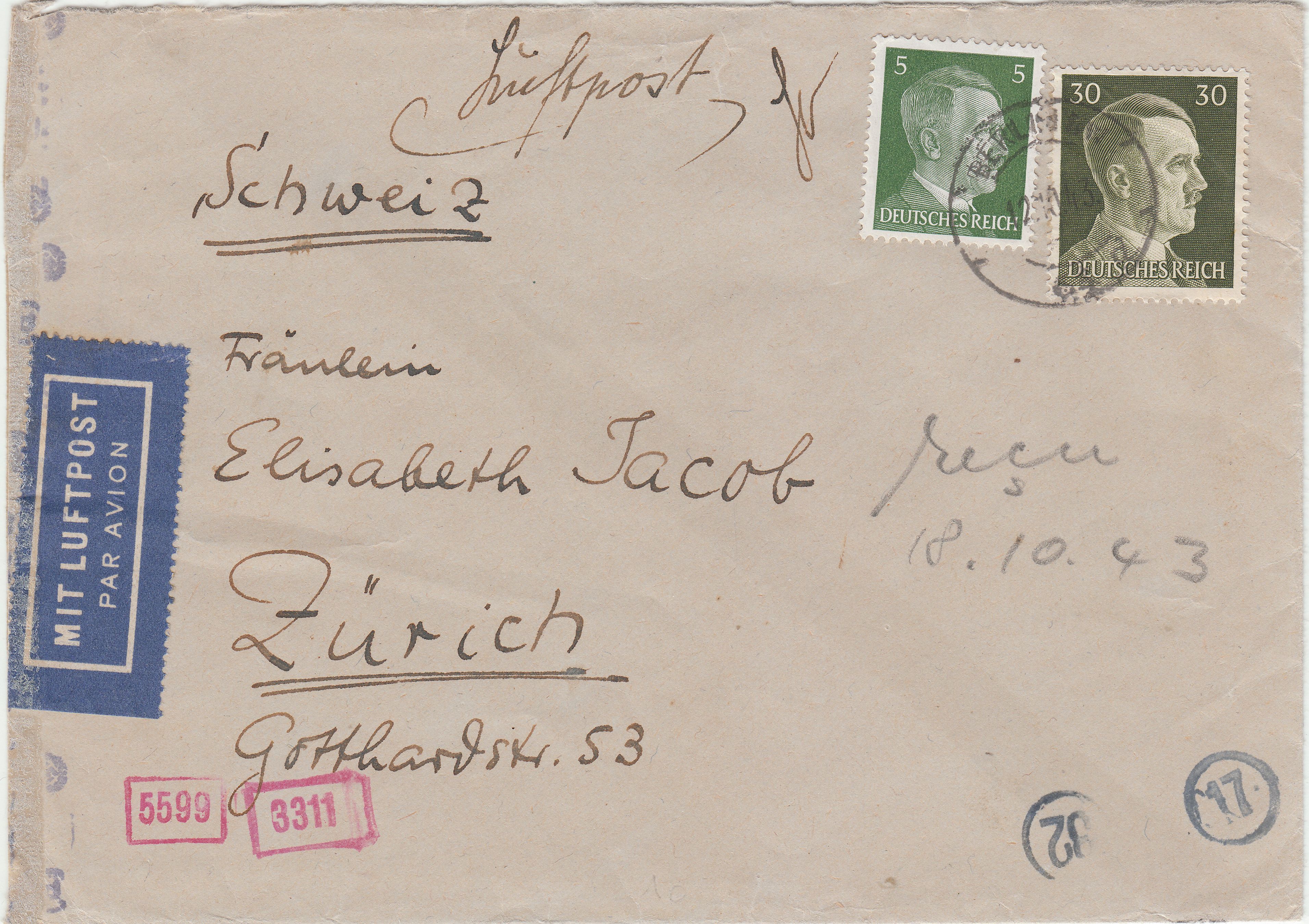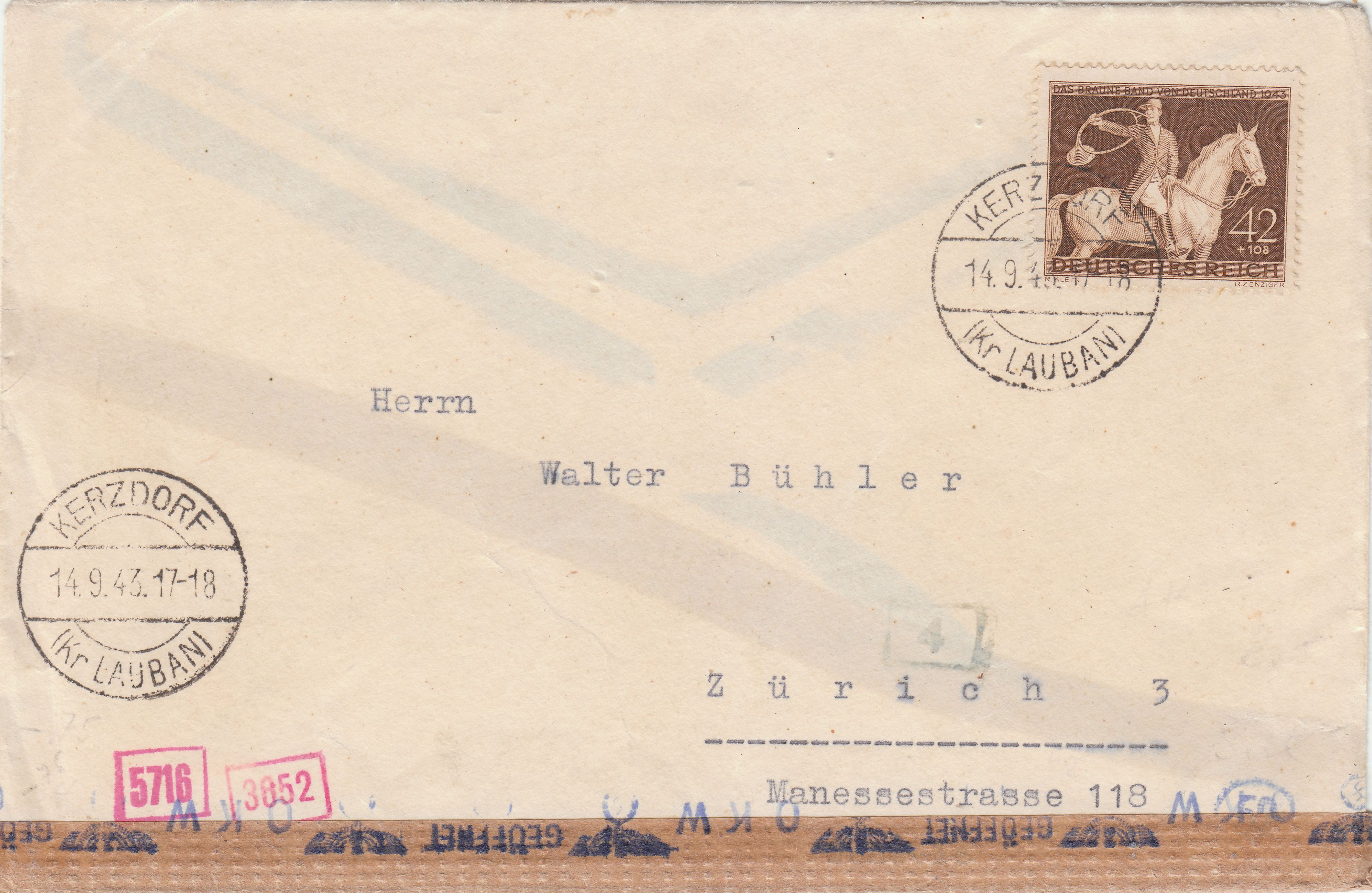 Interessant ist bei diesem Beleg der Kreisstempel "Ad" in Rot. Diese Handstempel wurden ab Aufnahme der Prüfungsarbeit in der ABP München im Oktober 1940 as "Handdurchlaufstempel" benutzt, d.h. sie dokumentierten, dass die jeweilige Postsendung der ABP München vorgelegt worden war und man dort entschieden hatte, auf eine Prüfung zu verzichten.