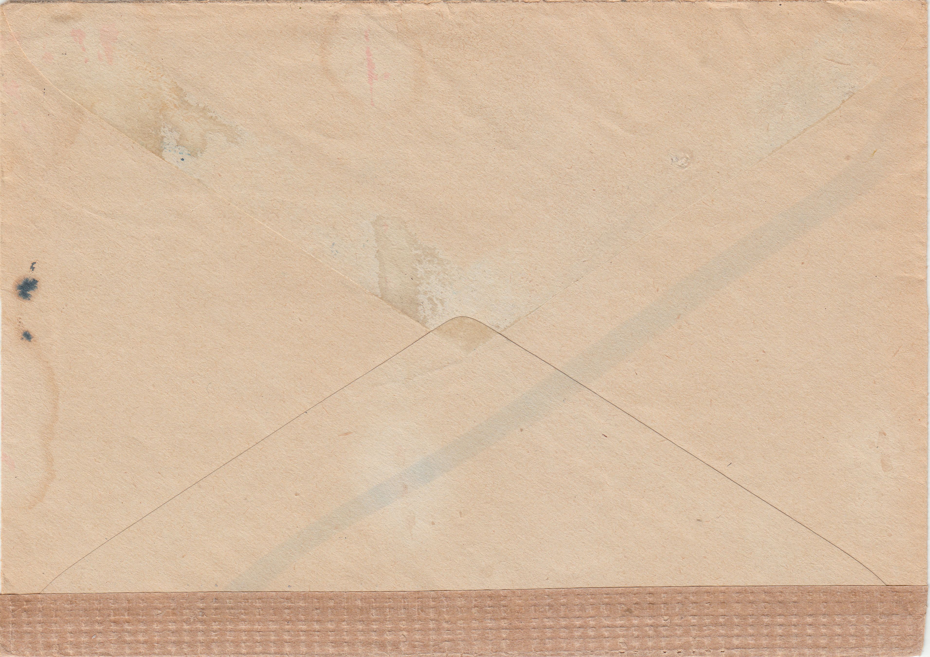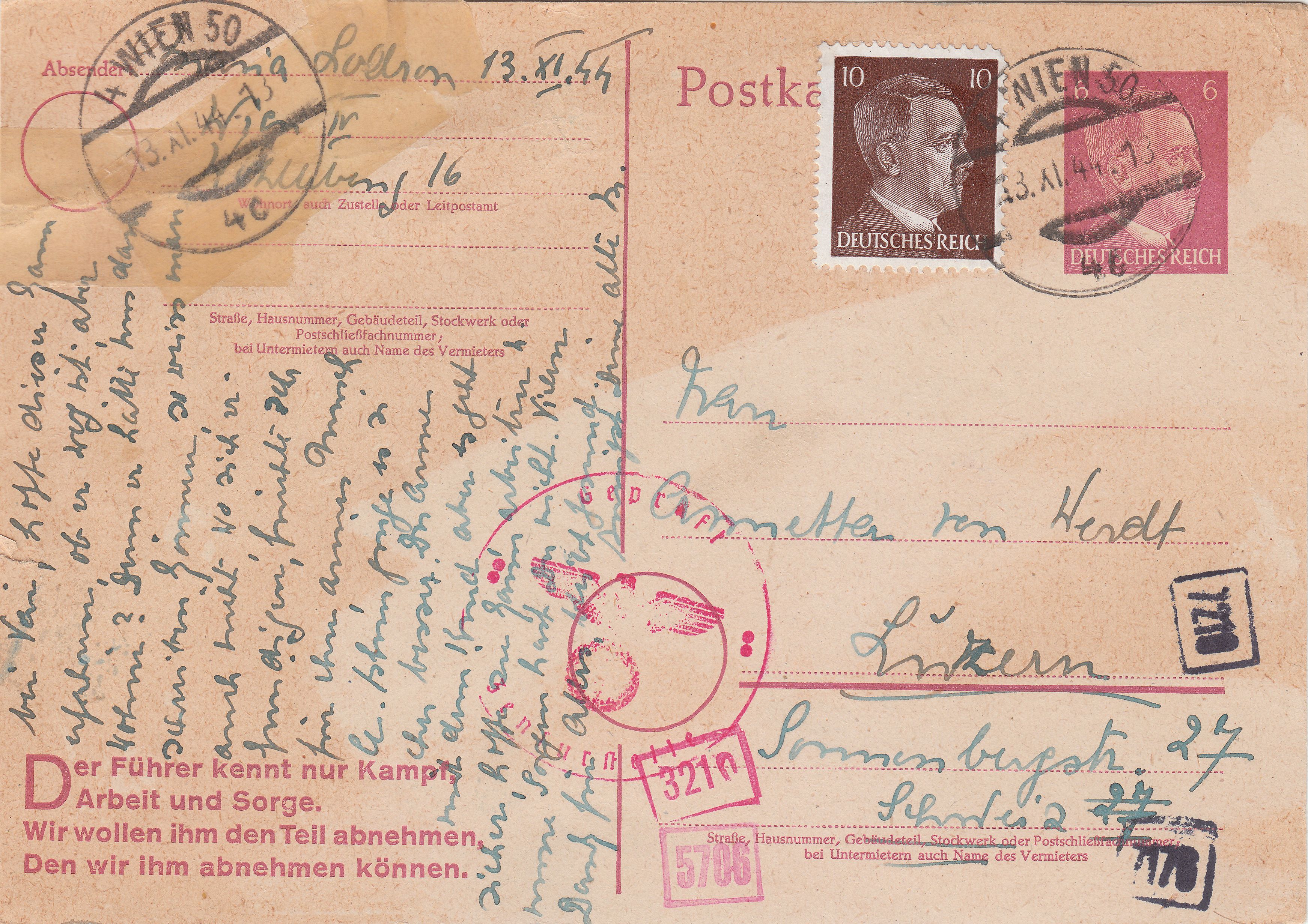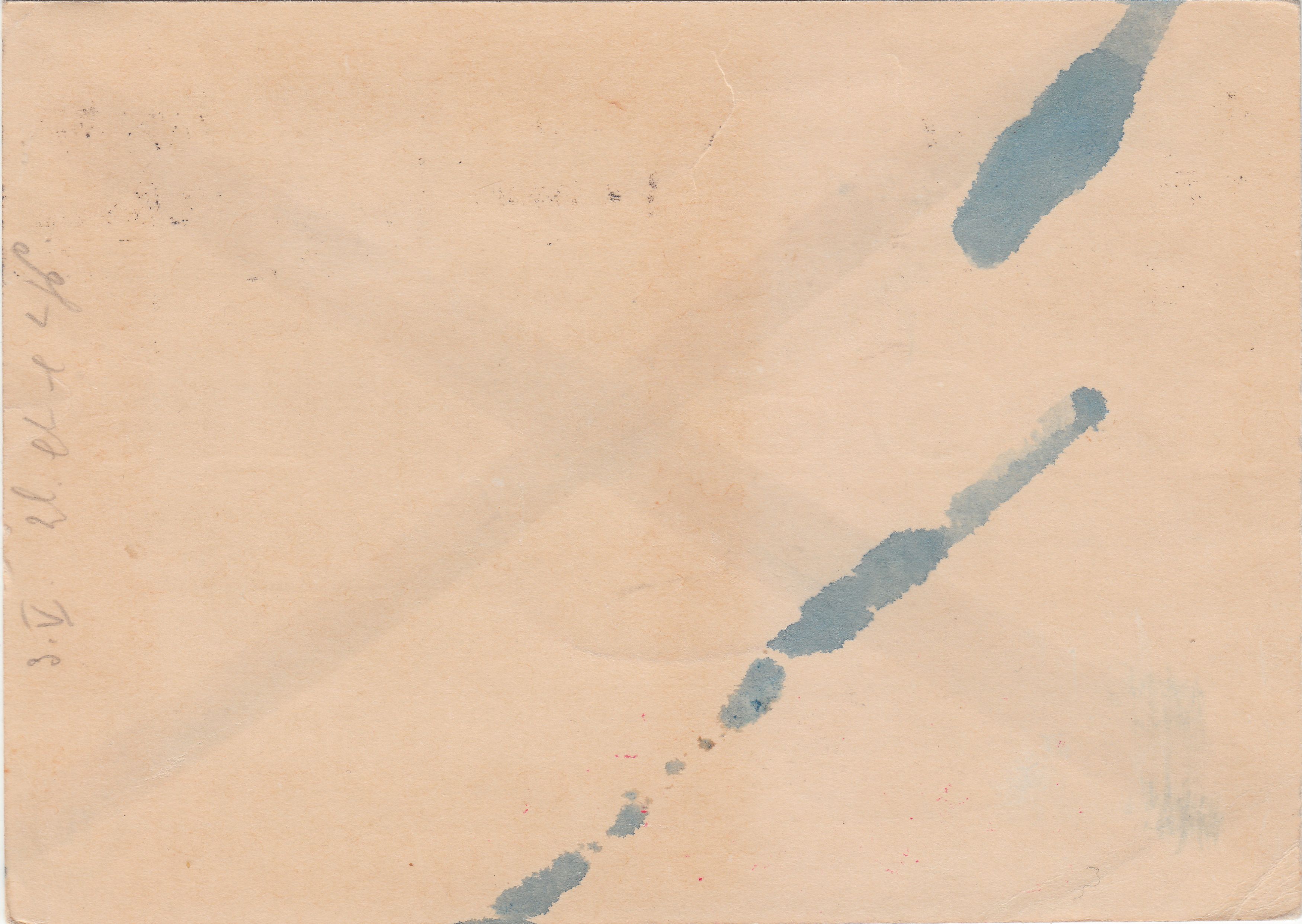 Diese Postkarte durchlief in der ABP München die chemische Zensur mit zwei verschiedenen Chemikalien. Eine Chemikalie wurde auf der Vorderseite diagonal von links oben nach rechts unten angewendet und blaue Tinte wurde auf der Rückseite diagonal von links unten nach rechts oben angewendet.